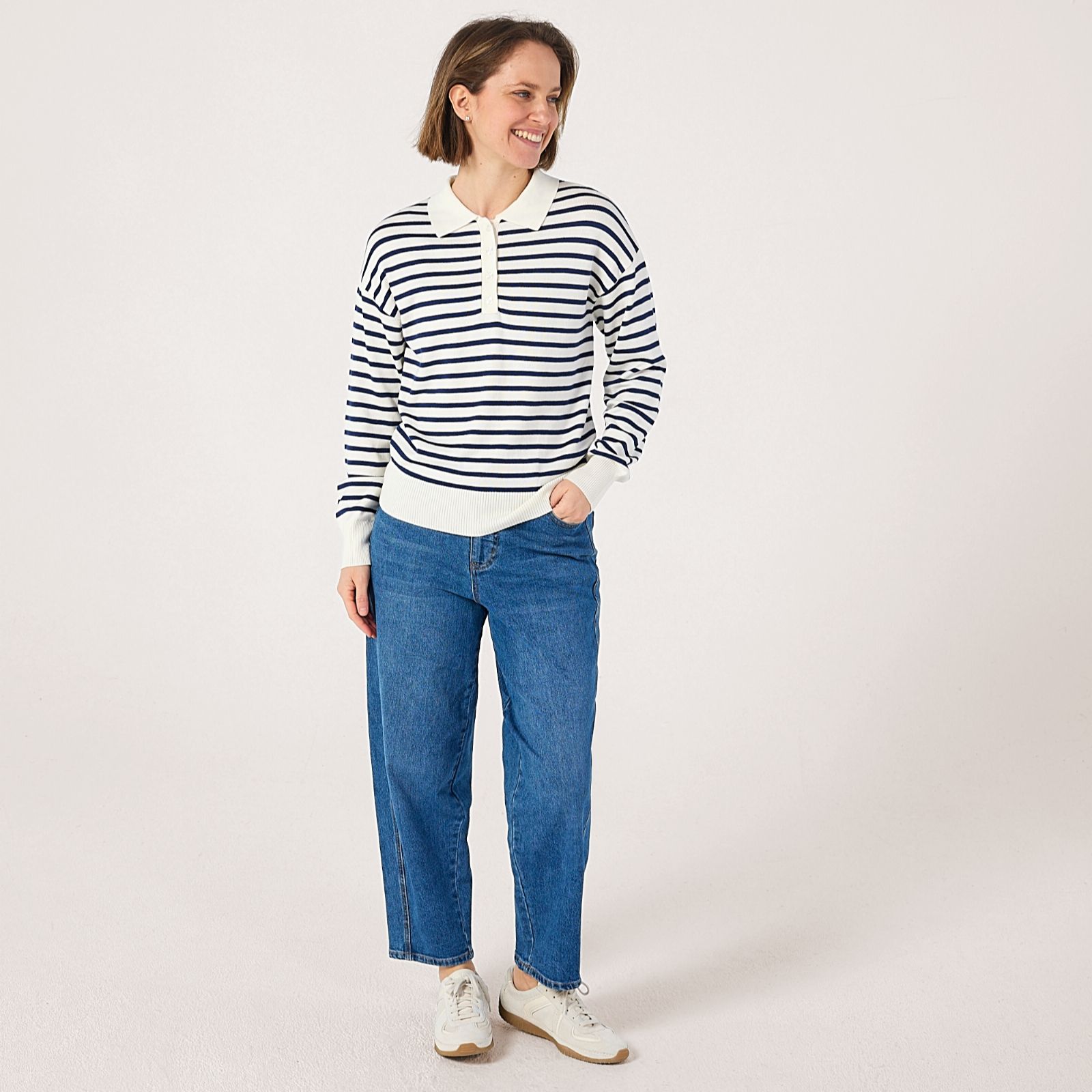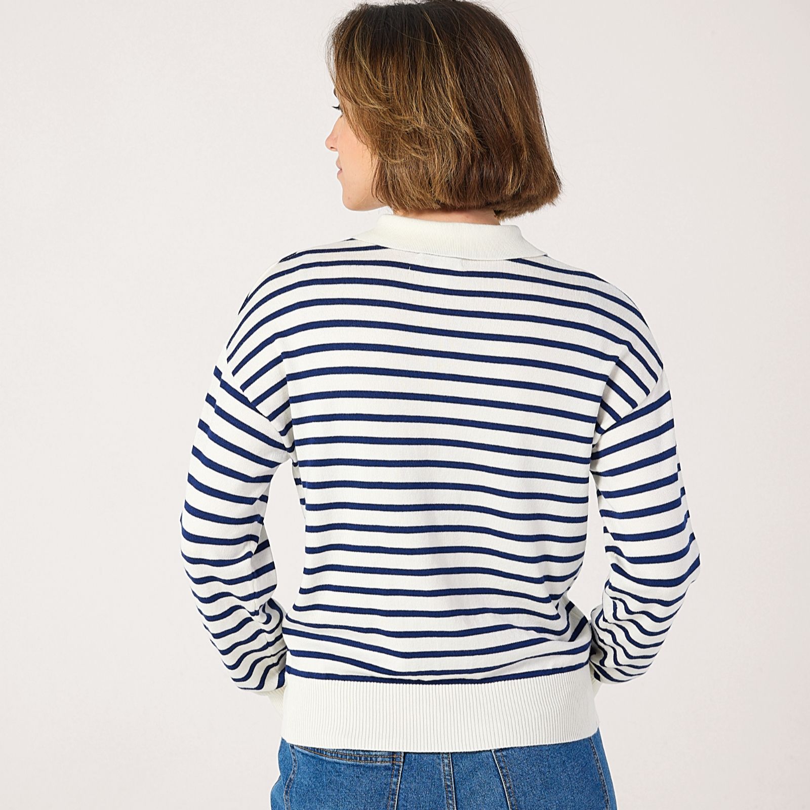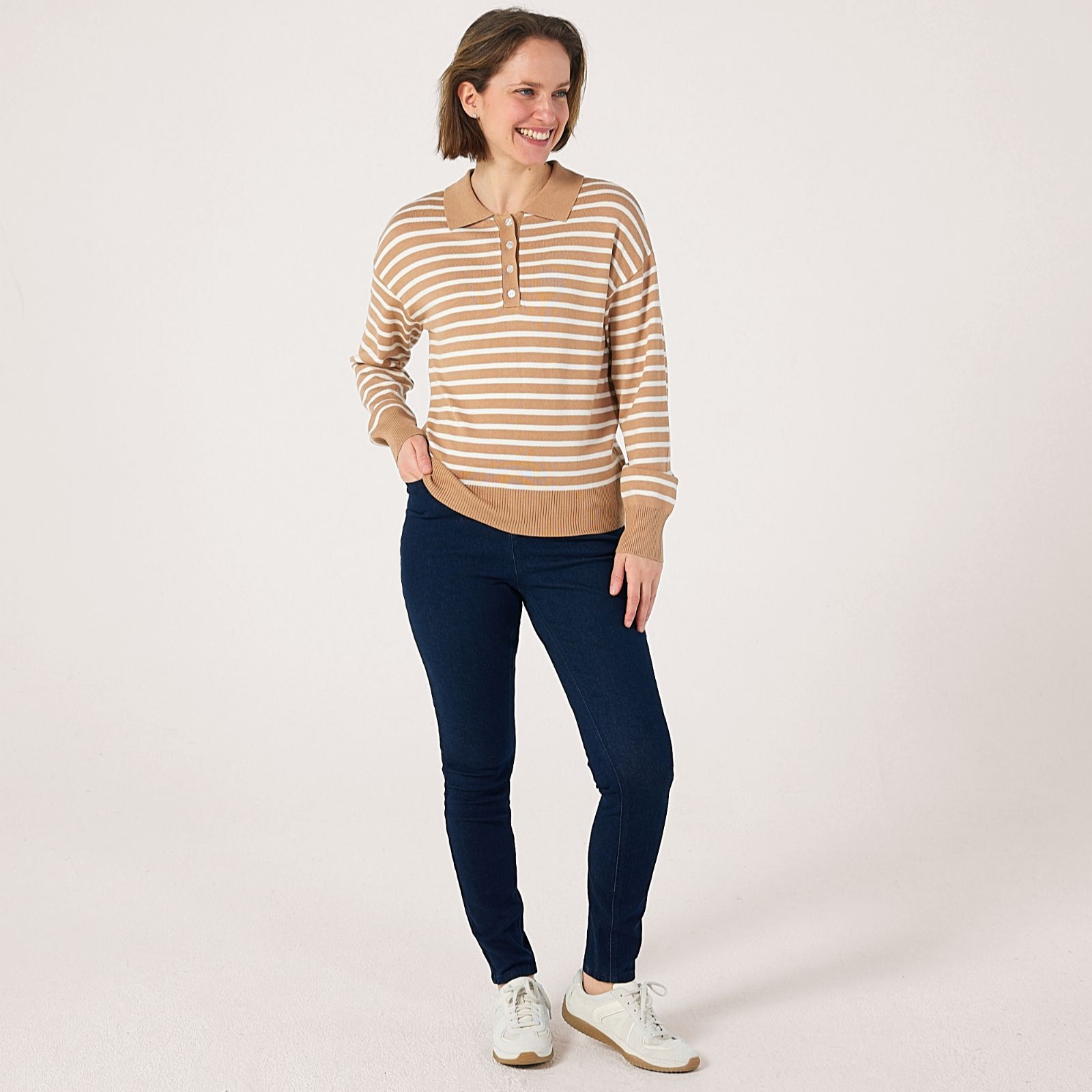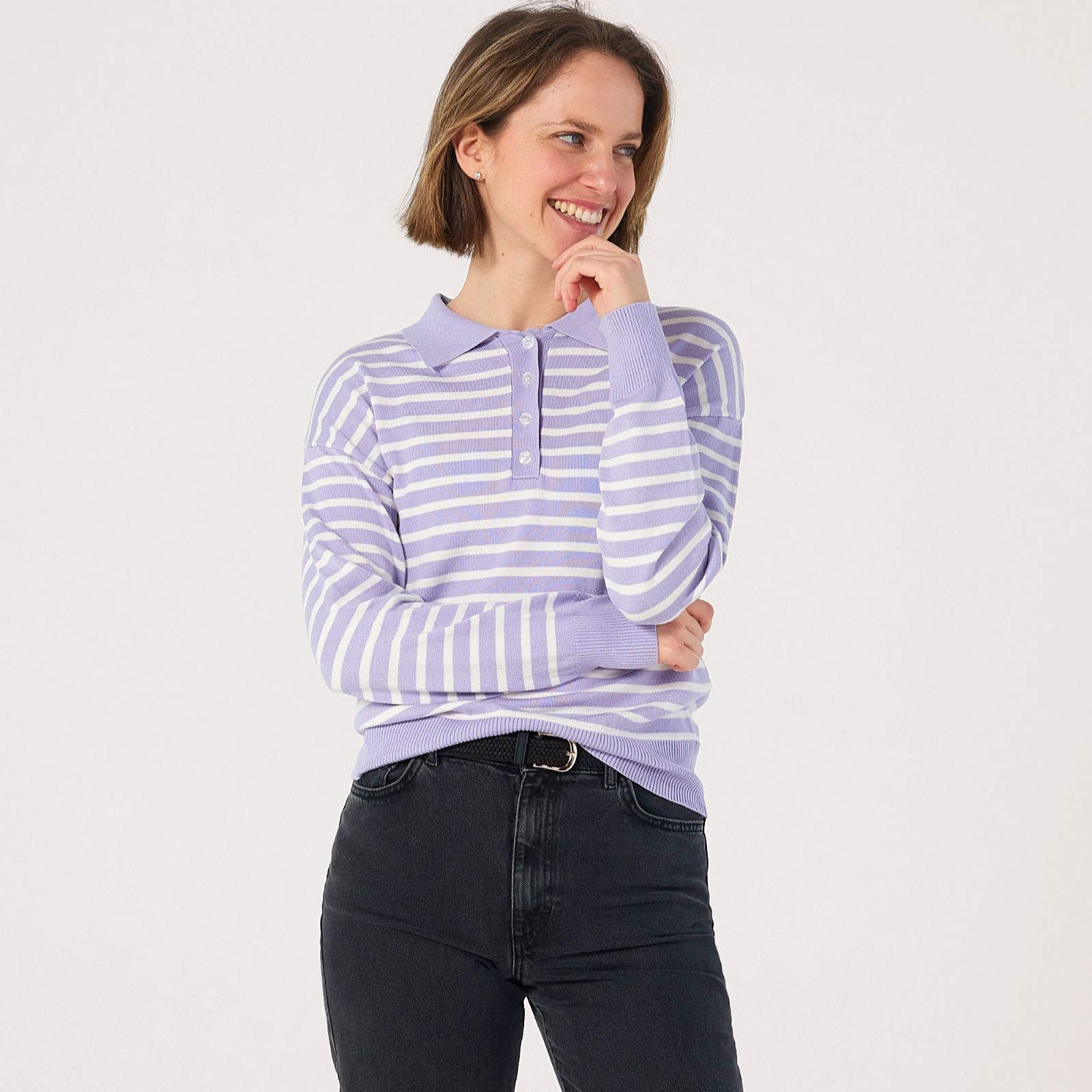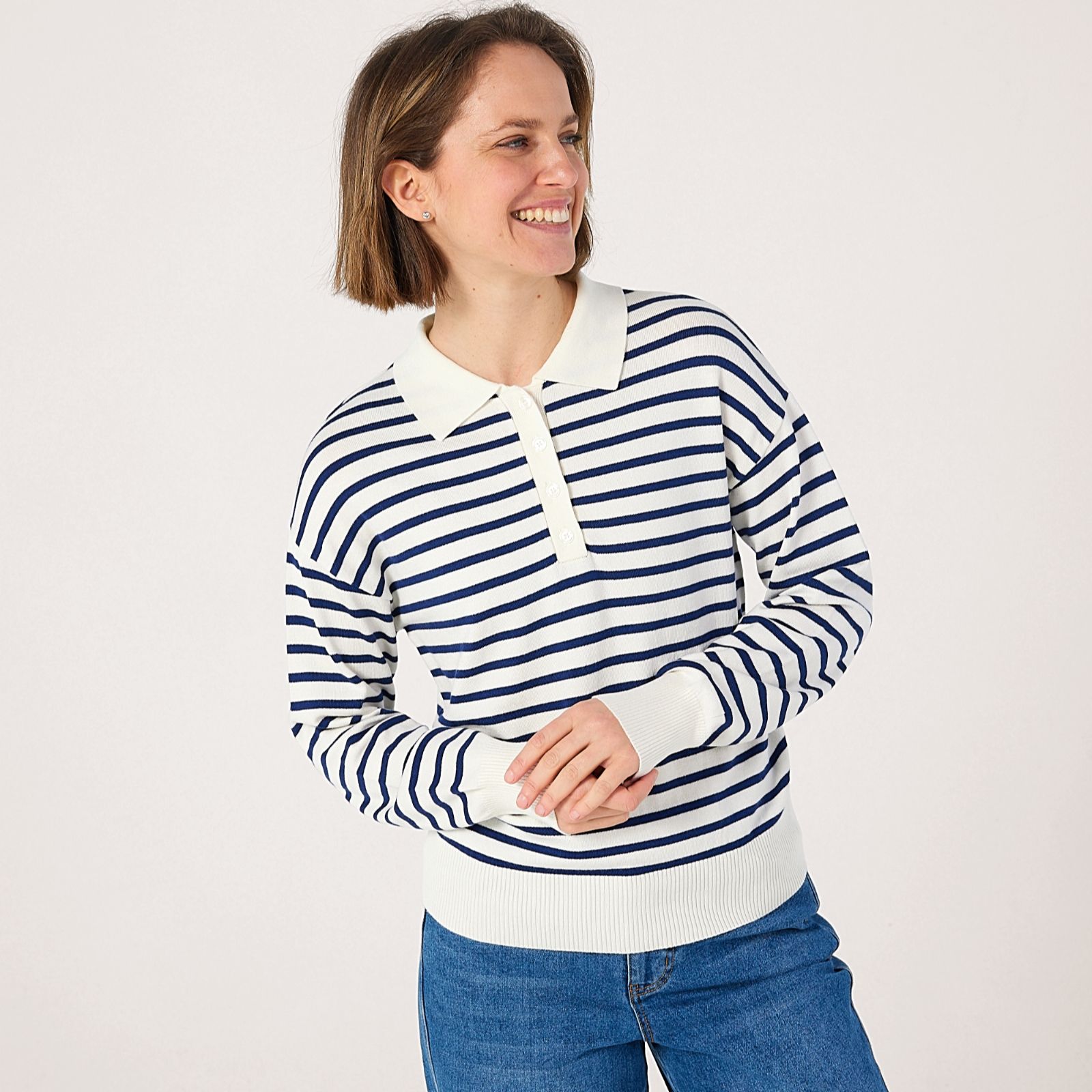 Bring a fresh twist to your knitwear collection with this striped knitted polo jumper from Denim & Co. Featuring a classic button-up design, bold all-over stripes and contrasting solid collar, hem and cuffs, it's the perfect blend of timeless style and modern flair. Ideal for everything from relaxed weekends to casual lunches, this jumper pairs beautifully with tailored trousers or your favourite denim for a laid-back yet put-together look.