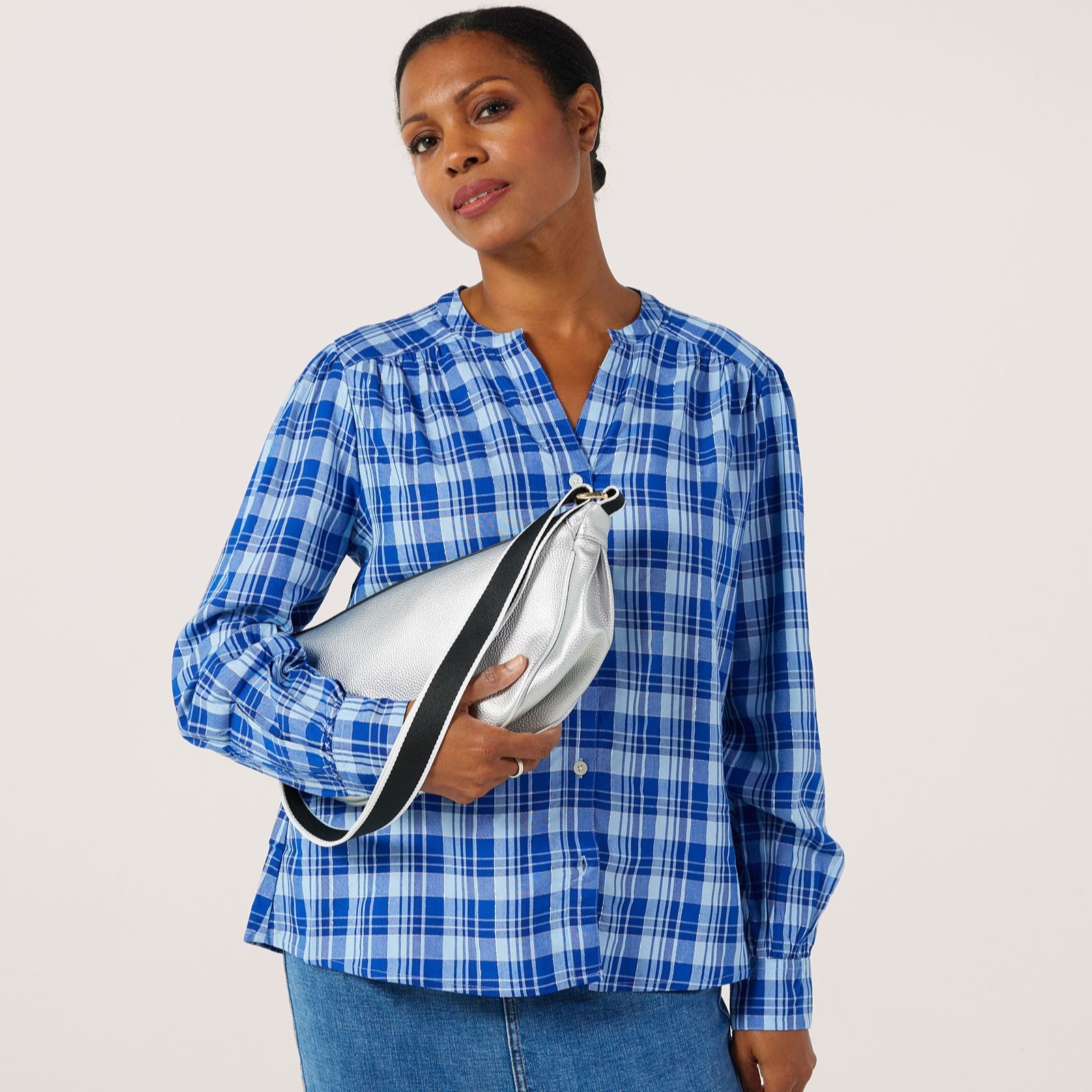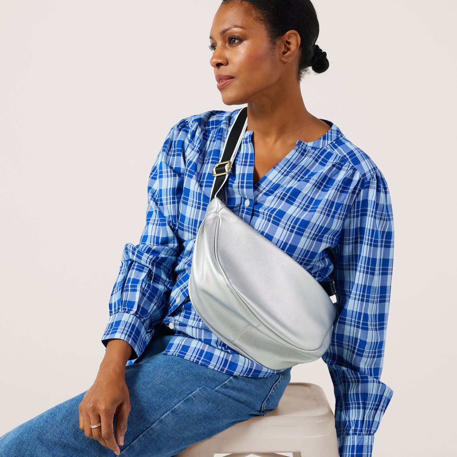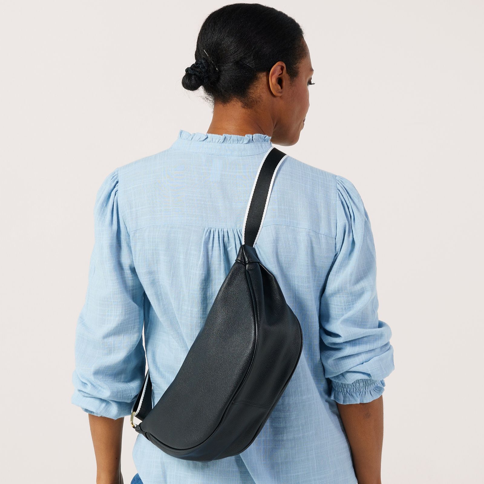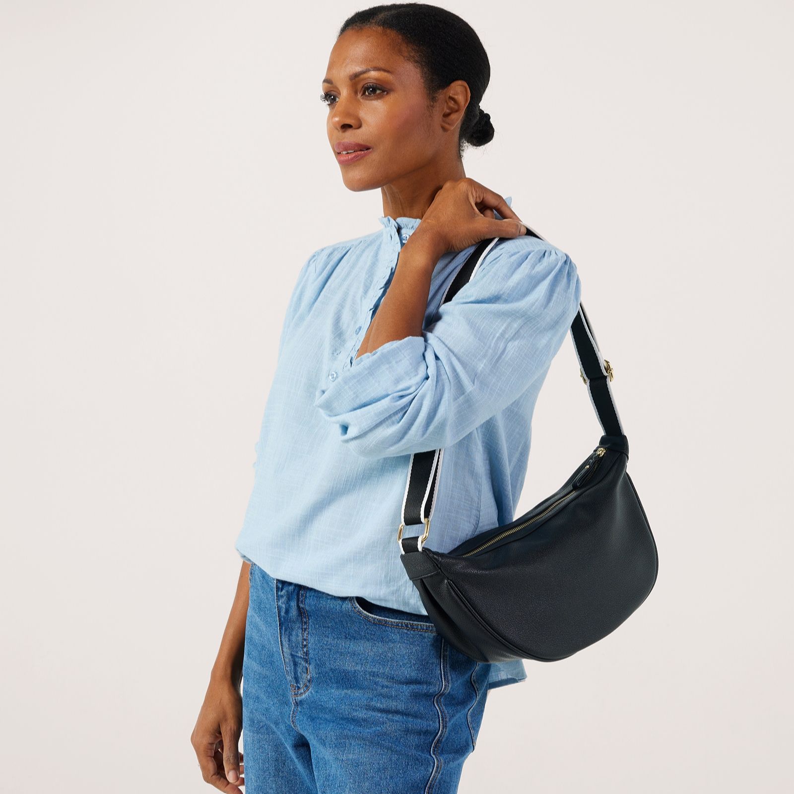 Head out the door with the Denim & Co. sling bag, where a sleek half-moon shape meets a modern finish for everyday style. The copper zip pocket and adjustable black and white webbed strap add a street-style edge, while the compact size and practical pockets keep your essentials organised, whether you're heading to the shops, taking the dog out or meeting up with friends.