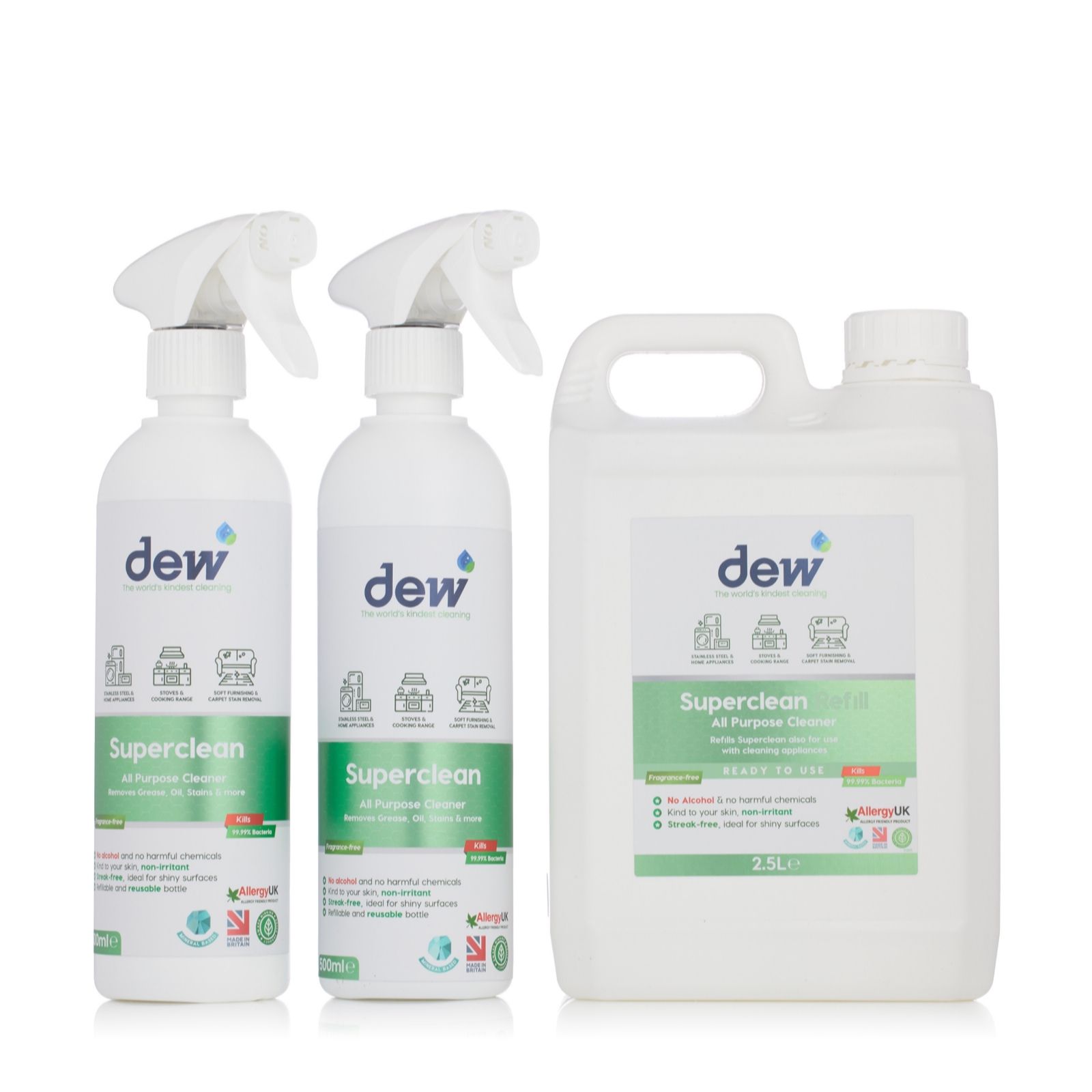 Get ready to transform your cleaning routine with the Dew Products Superclean Bundle. This all-purpose cleaner and degreaser is perfect for tackling everything from worktops to carpets. The fast-acting formula cuts through grime and stubborn stains, while the easy-to-use, rinse-free application makes cleaning a breeze. And, with its refillable containers, you're not just cleaning your home, but also doing your bit for the environment.