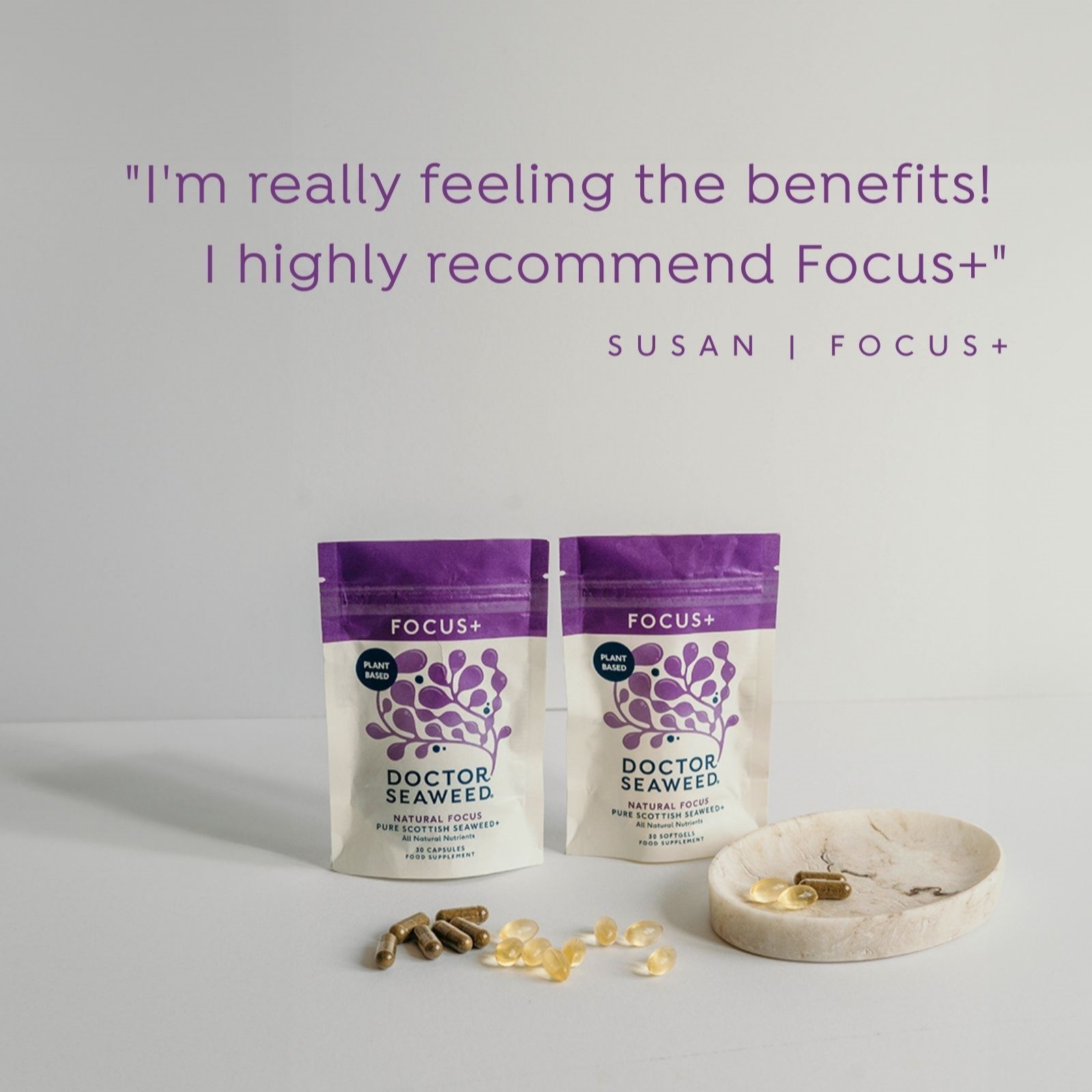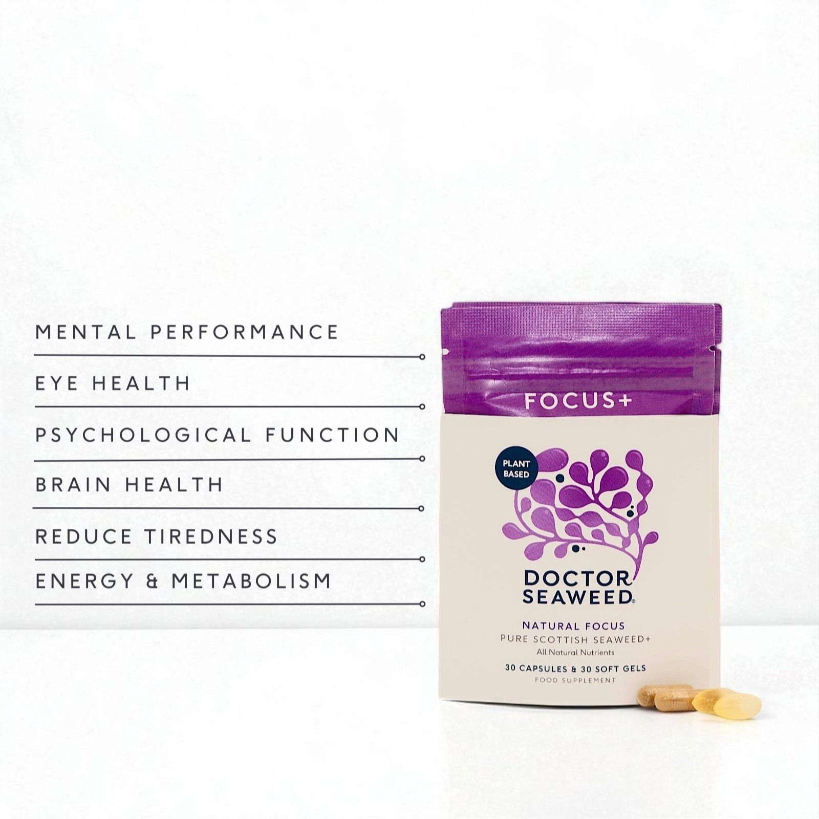 Doctor Seaweed's Focus+ supplements contains natural sources of nutrients including iodine from Scottish seaweed that supports normal cognitive function, pantothenic acid, which contributes to normal mental performance and the reduction of tiredness and fatigue, as well as DHA which contributes to the maintenance of normal brain function and vision, plus vitamins B1, B6 and B12. Help support your focus, brain, energy and vision through the wonder of seaweed and other natural plant-based ingredients.