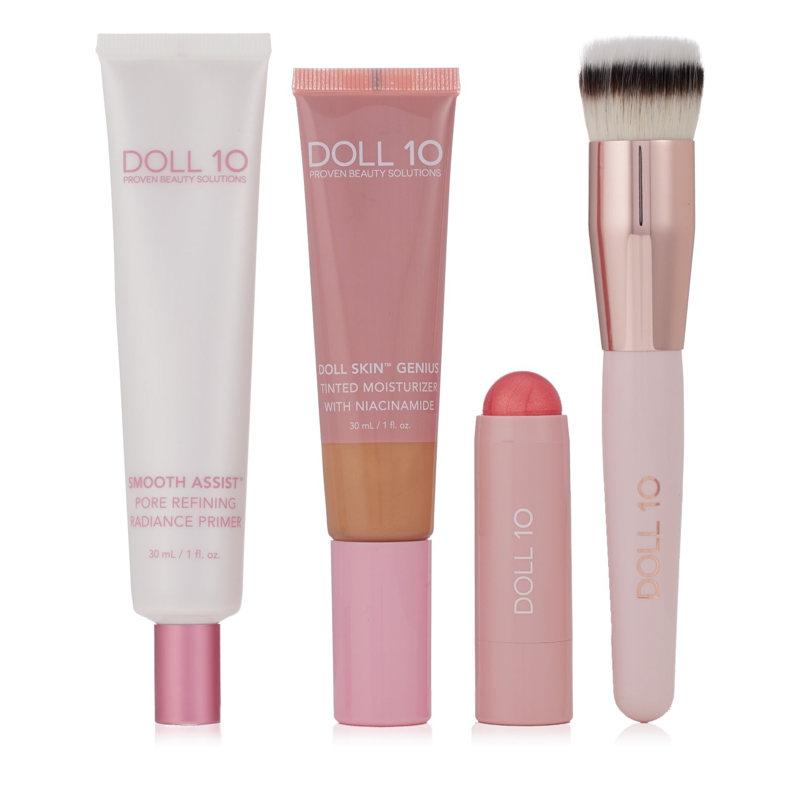 Discover the secret to flawless summer skin with the Doll 10 four-piece Doll Skin Complexion Collection. Boasting gorgeous, lightweight formulas that are perfect for summer, this edit includes the new Doll Skin Genius Tinted Moisturizer and Smooth Assist Pore Refining Radiance Primer, plus a Doll Skin Genius The Multitasker 3-in-1 Creme Color Stick and Stippling Brush. Powered by skin-loving ingredients and designed to give you a full face of confidence, this set will leave you looking glowing and radiant.