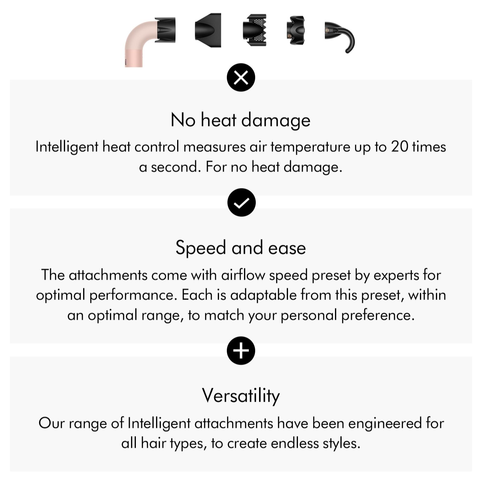 - Includes concentrator, powerful air attachment, gentle air attachment, smoothing nozzle and flyaway attachment