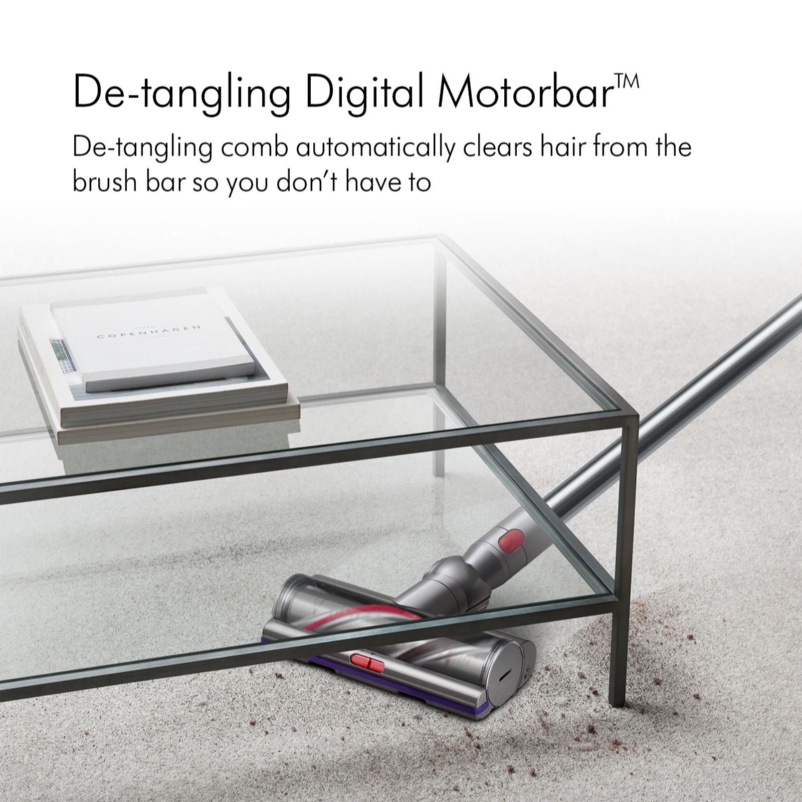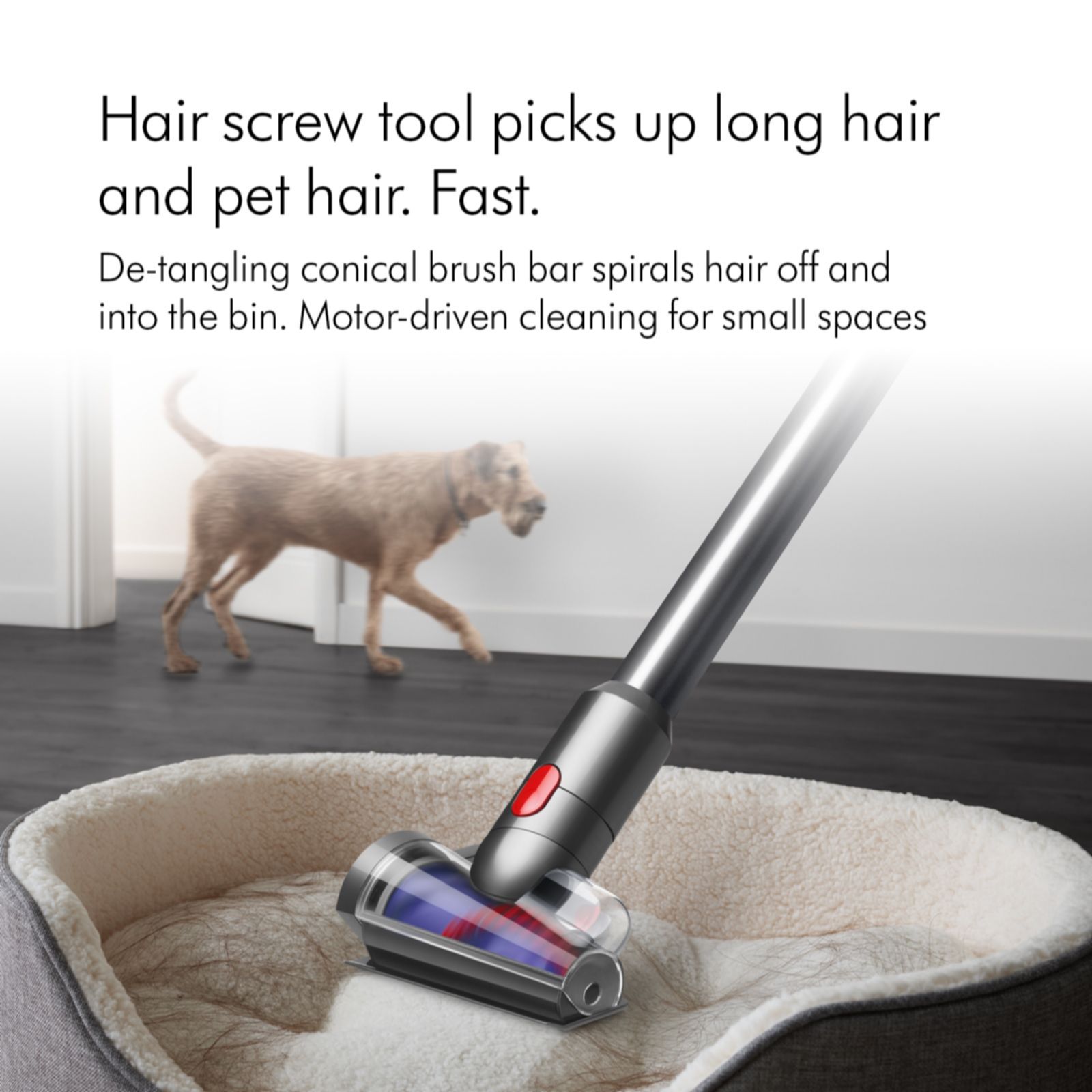 - Dyson's latest de-tangling technology removes stubborn hair from all around your home. It de-tangles hair automatically and sucks up pet hair fast. Special vanes on the motor bar cleaner head automatically clear wrapped hair from the brush bar as you clean.