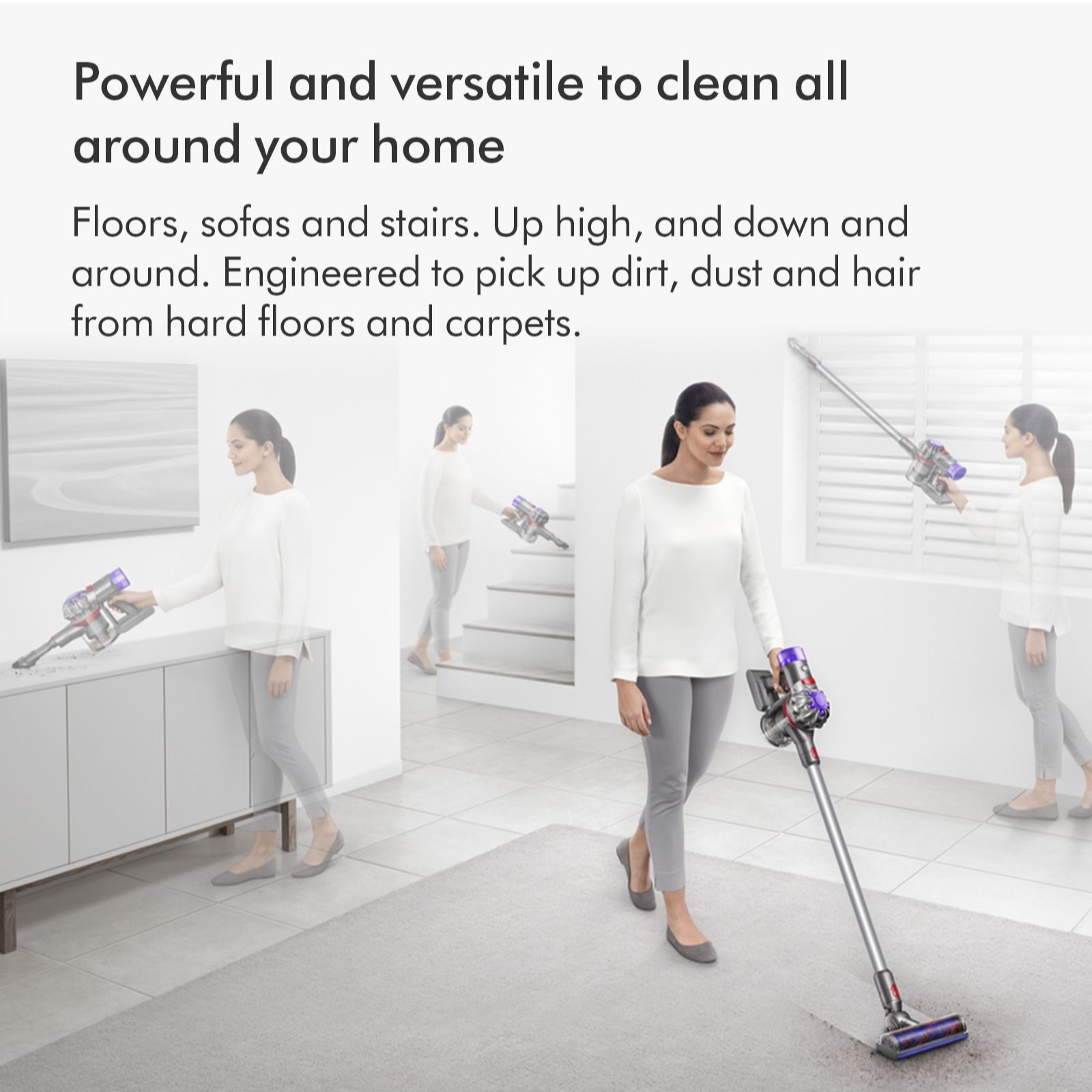 – this convenient cleaner is ideal for a quick clean-up around your home, offering 40 minutes of powerful, fade-free suction. Its lightweight, cordless design, coupled with the ability to turn it into a handheld vacuum, mean the V8 is also ideal for cleaning mattresses, sofas, stairs, vehicles and more.