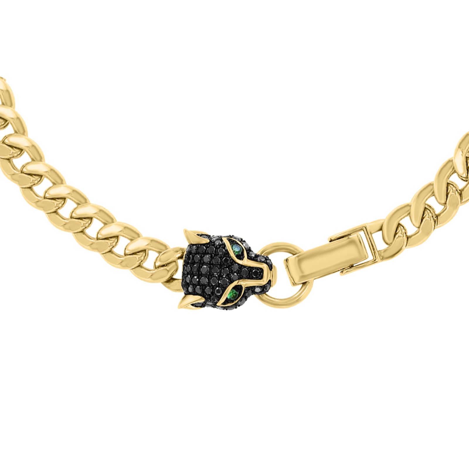 Feel the allure of untamed elegance with this panther chain link bracelet from Effy. Crafted in luxurious 14ct yellow gold, it captures the strength and grace of the panther with a head set in glimmering black diamonds and tsavorite eyes that gleam with vivid green brilliance. The Cuban curb chain adds substance and style, while the concealed clasp hidden within the panthers mouth ensures a seamless, sophisticated finish.