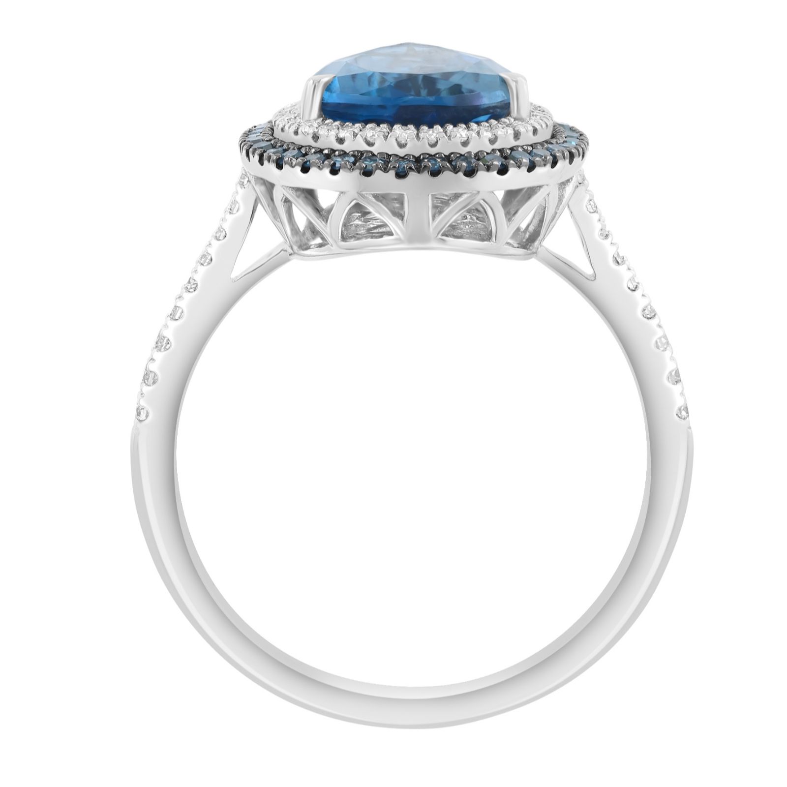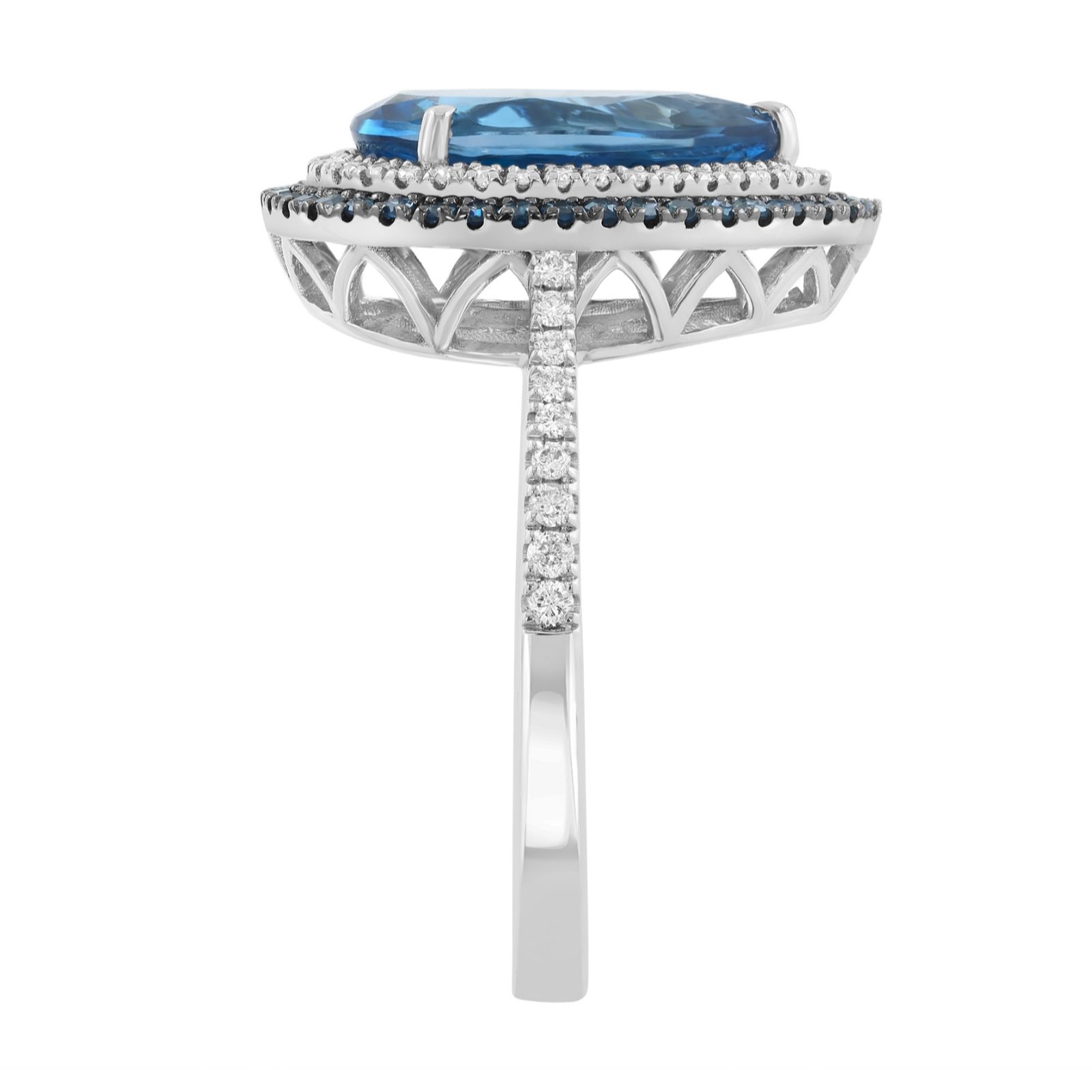 Make a statement of timeless sophistication with this exquisite ring from Effy. Crafted in luxurious 14ct white gold, it showcases a captivating pear-cut London blue topaz at its centre, radiating deep oceanic hues. Surrounding halos of sparkling white and blue diamonds add a mesmerising contrast, creating a piece that blends classic glamour with contemporary elegance  a treasure to cherish for years to come.