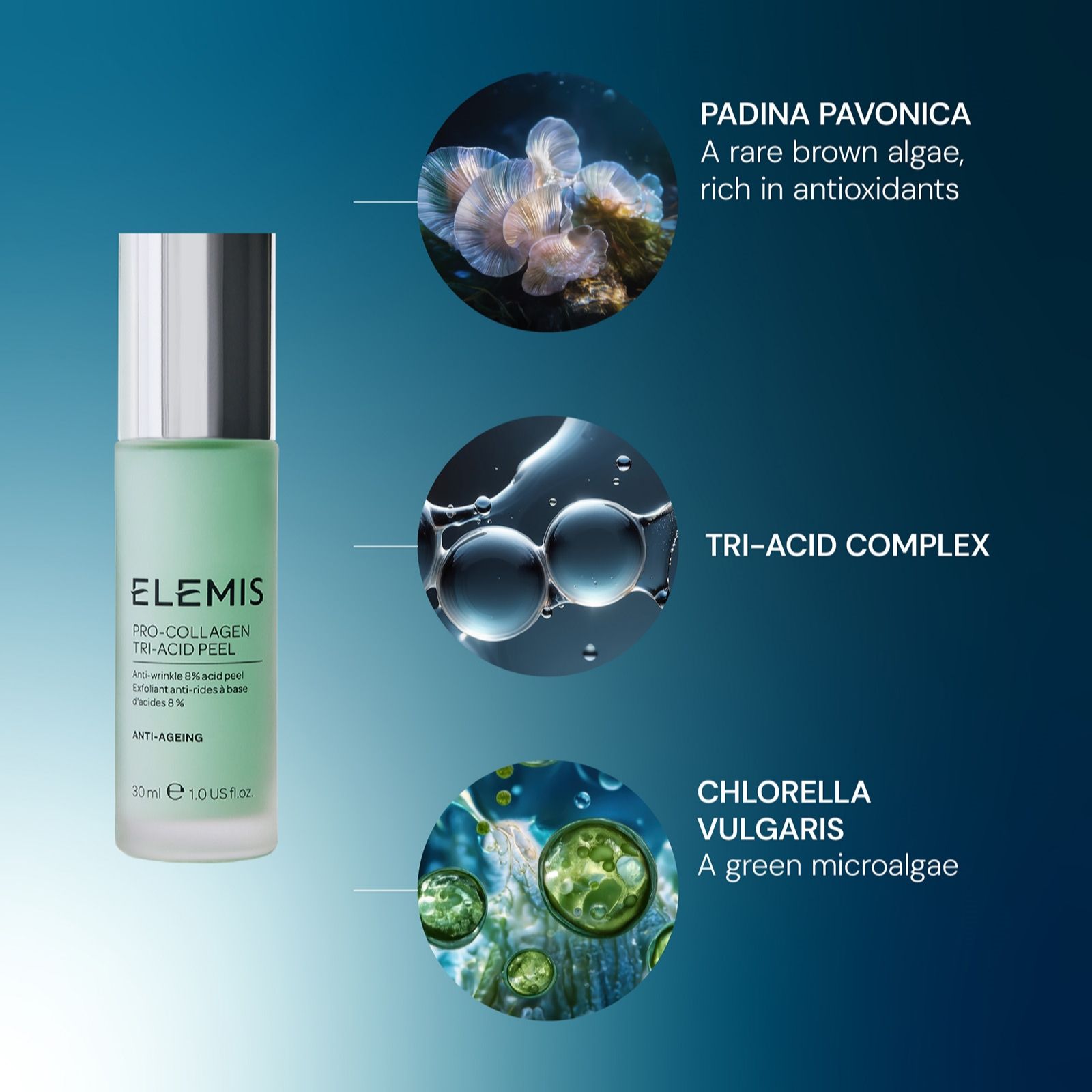 - 1 x Pro-Collagen Tri-Acid Peel (30ml) - powerful, yet gentle on the skin, helps to support the skin’s natural moisture barrier and is formulated with an 8% Tri-Acid Complex of lactobionic, Asiatic and mandelic acids and infused with padina pavonica (a marine algae) and chlorella