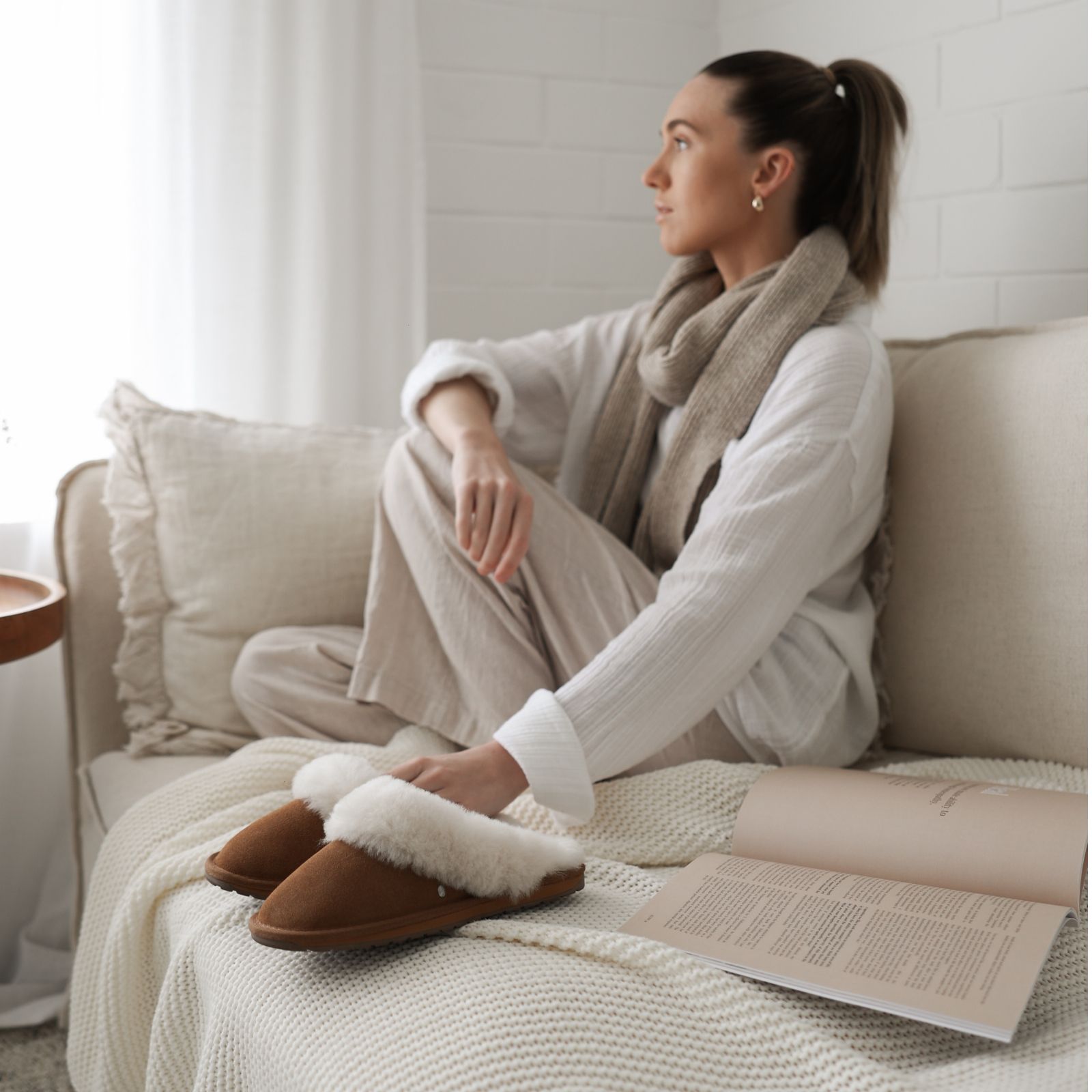 Treat your feet to pure indulgence with the Jolie slippers from Emu Nest, where plush exposed sheepskin cuffs and soft suede wrap you in cosiness. Perfect for unwinding at home, these slippers feature a dual-density sole and cushioned EVA midsole, making them ideal for relaxed mornings, cosy evenings, or nipping outside. Pair them with your favourite loungewear for a luxurious finishing touch.
