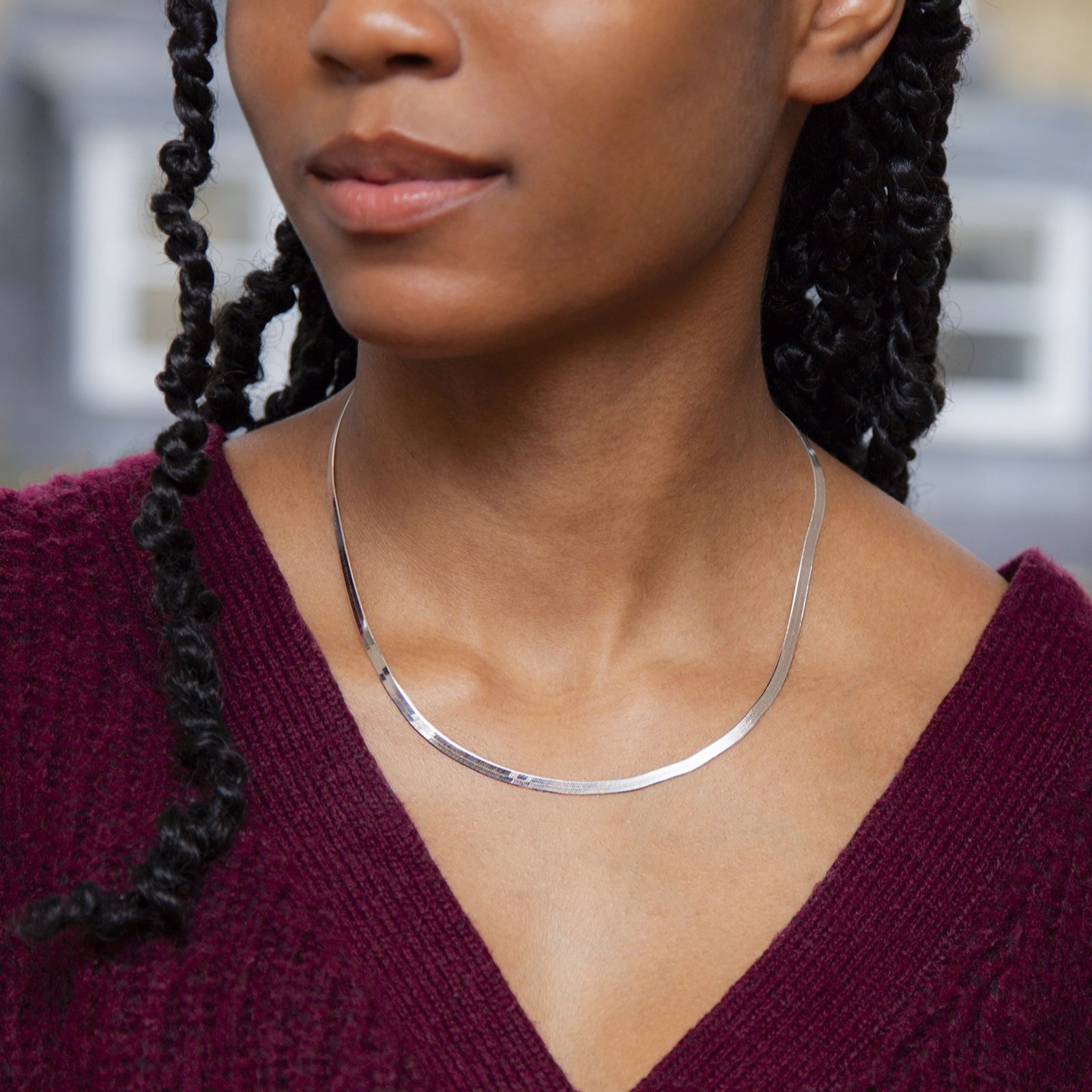 Bring a sleek finish to your look with this Faith & Brown triple herringbone necklace, showcasing three elegant rows of sterling silver that shimmer with every movement. The intricate herringbone weave creates a fluid, contemporary look, perfect for elevating both your day-to-day style and evening ensembles with a touch of refined sophistication.