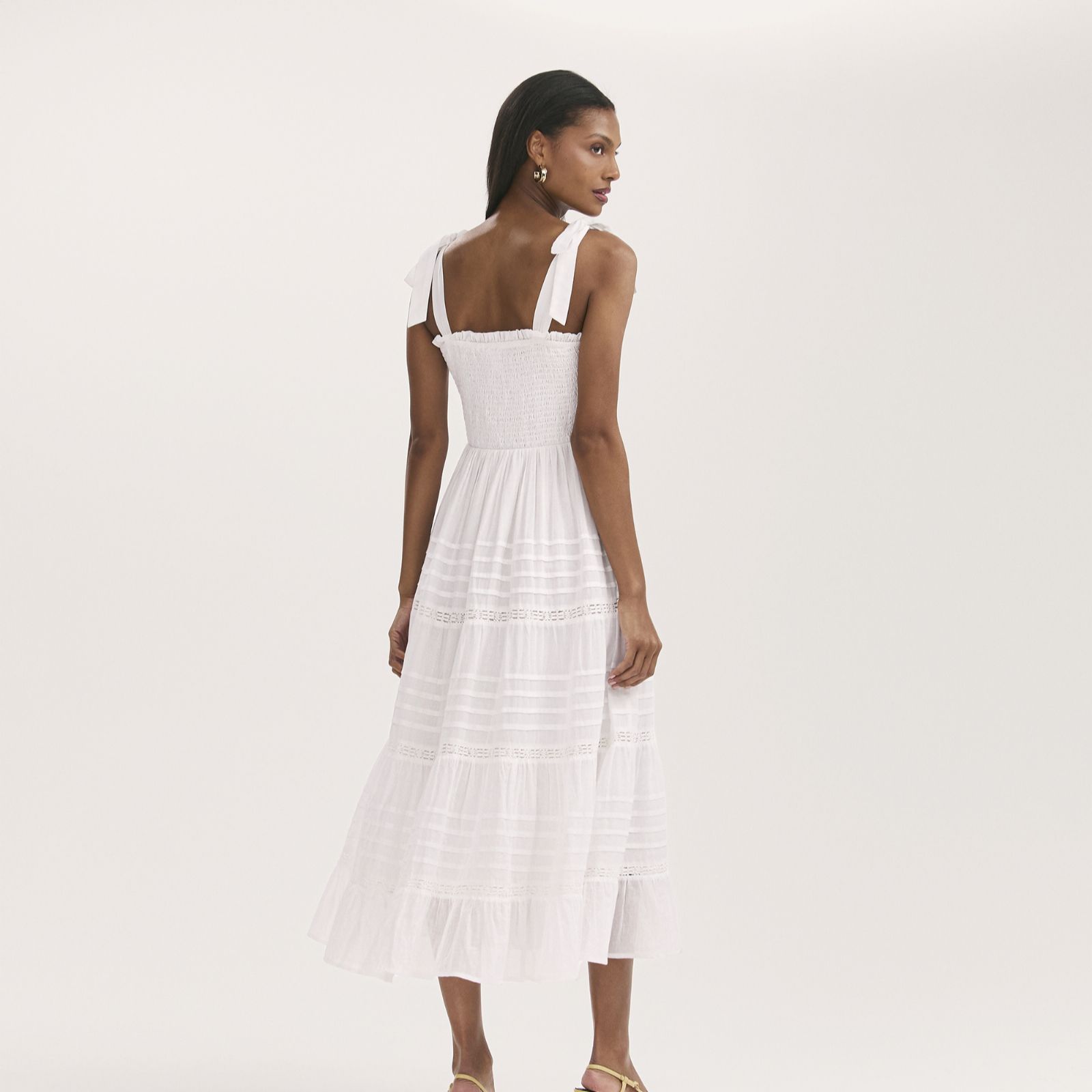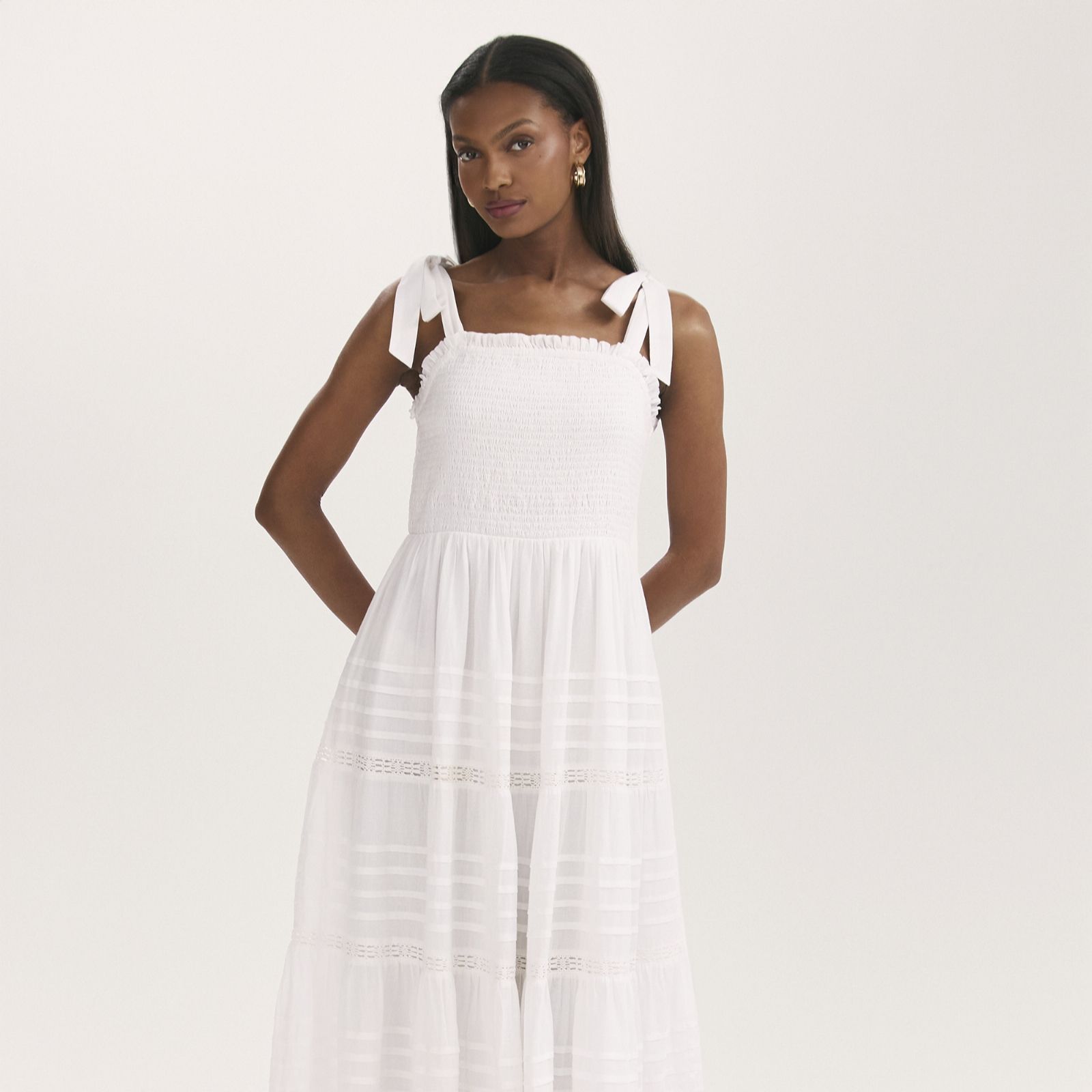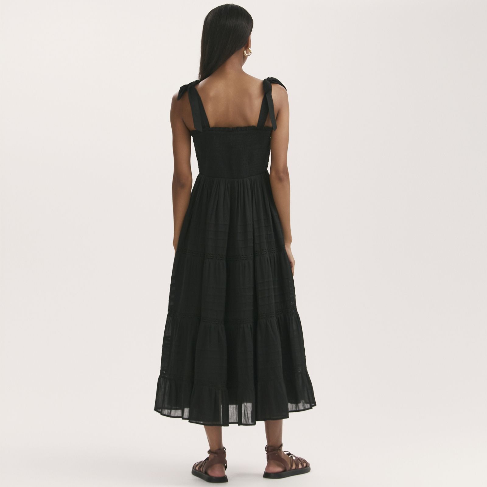 Breeze through sunny days in the Ebony tiered midi dress from Finery London, where wide self-tie straps and delicate pin tucks with lace trims create a feminine, floaty silhouette. The shirred bodice flatters your figure, making this dress a go-to for picnics in the park, brunches with friends, or laid-back garden parties. Pair it with espadrilles and a straw tote for effortless summer style.