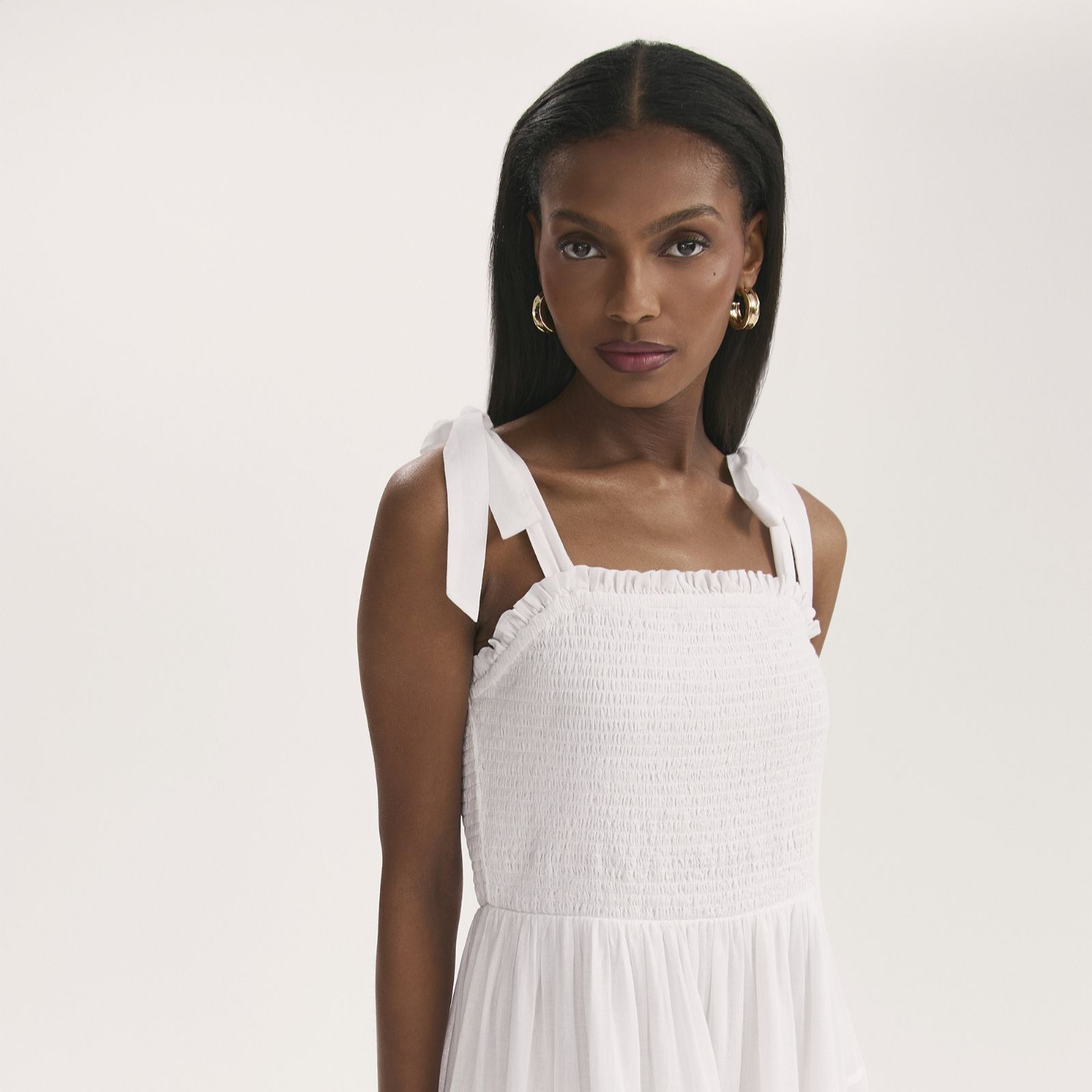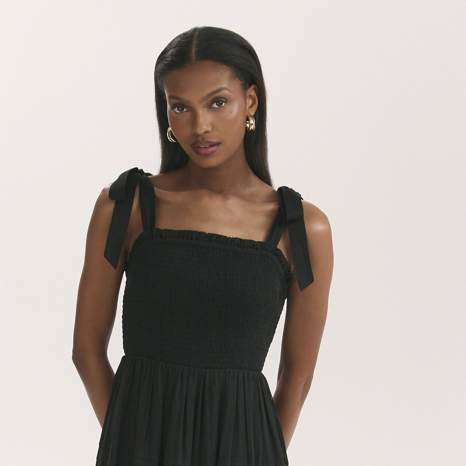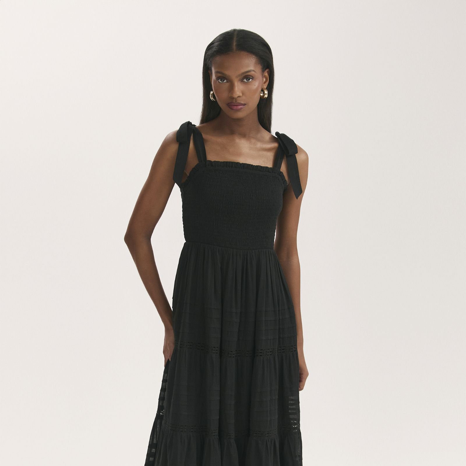 Breeze through sunny days in the Ebony tiered midi dress from Finery London, where wide self-tie straps and delicate pin tucks with lace trims create a feminine, floaty silhouette. The shirred bodice flatters your figure, making this dress a go-to for picnics in the park, brunches with friends, or laid-back garden parties. Pair it with espadrilles and a straw tote for effortless summer style.
