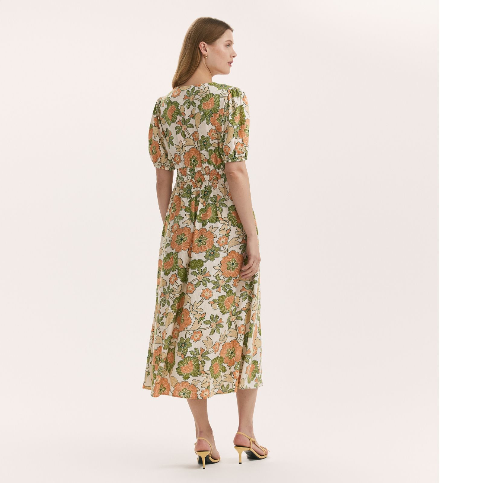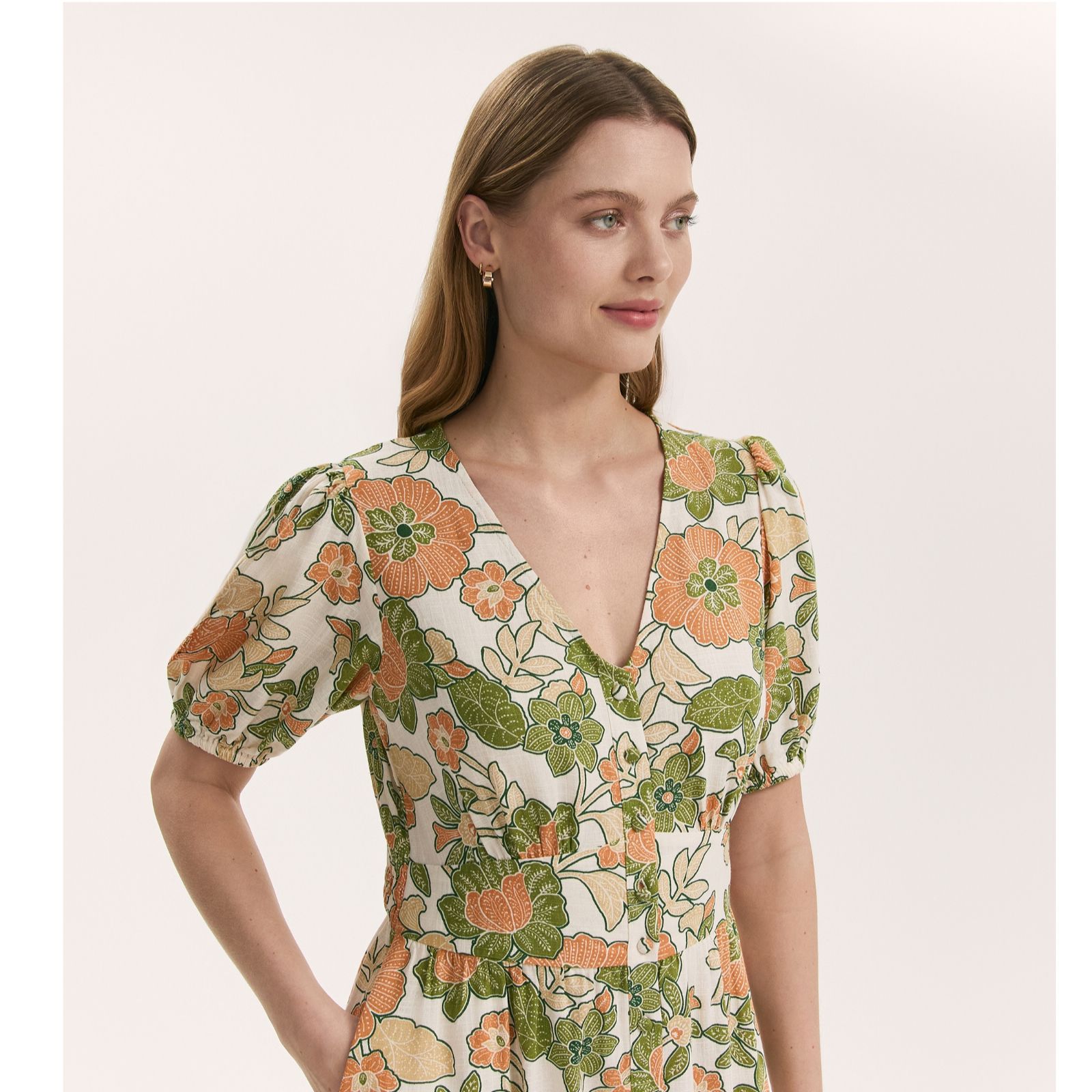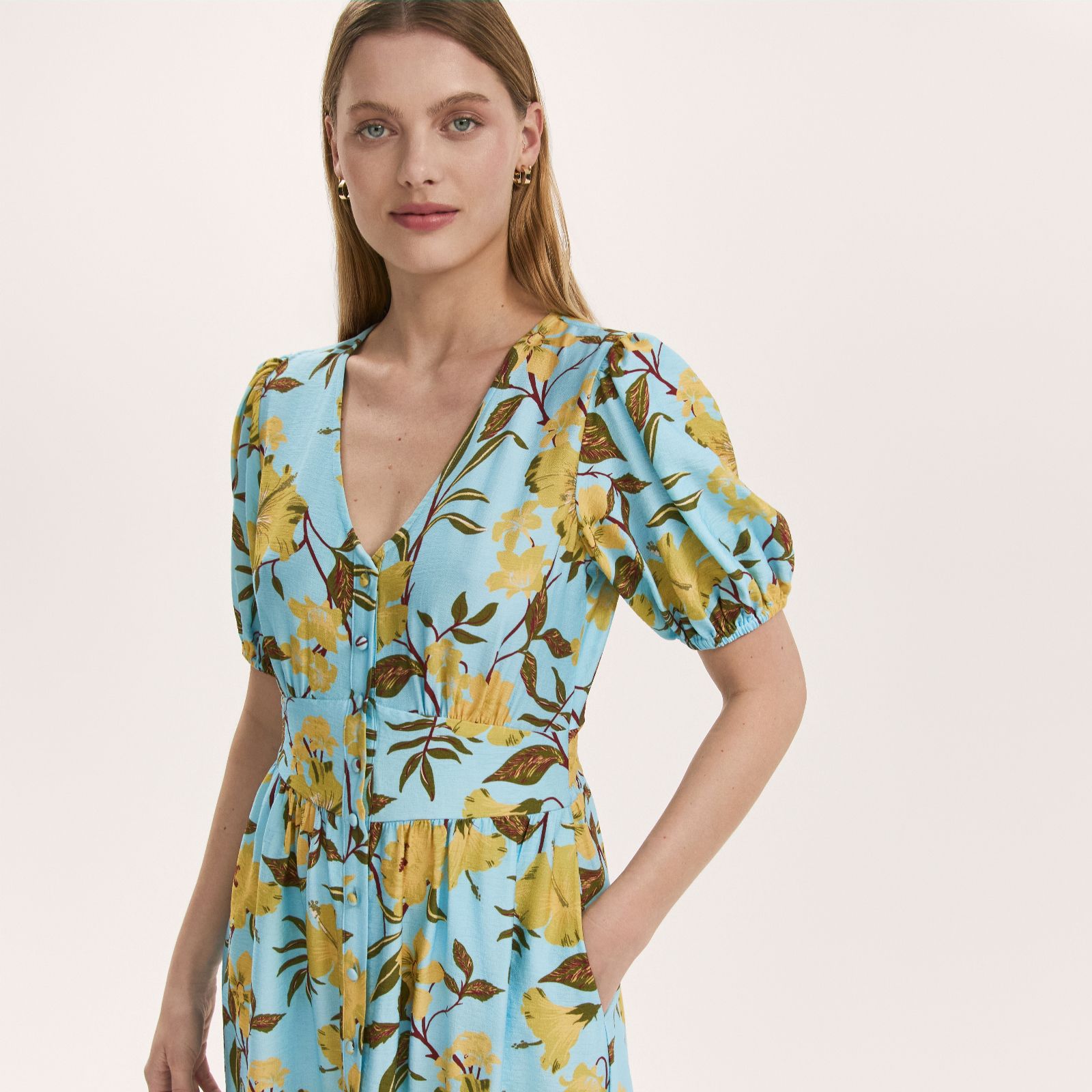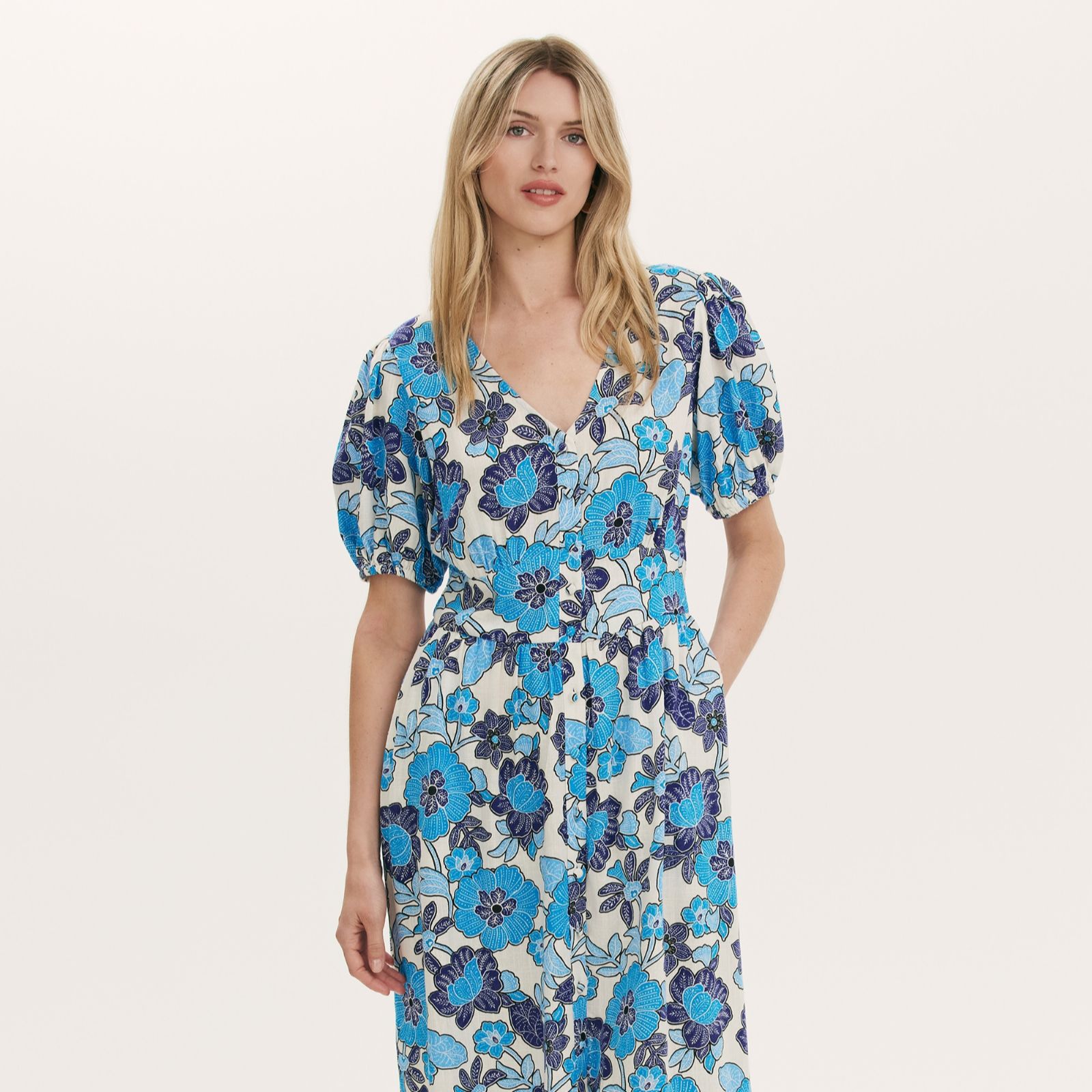 Turn heads at your next gathering with the Addision Printed Button Through Midi Dress from Finery London, where vintage-inspired florals meet a stunning silhouette. The charming puff sleeves and v-neckline are complemented by a button-down front and defined waist, making this dress a go-to for brunches, garden parties or days at the office. Pair with heeled sandals and a cross-body bag for an effortlessly chic ensemble.