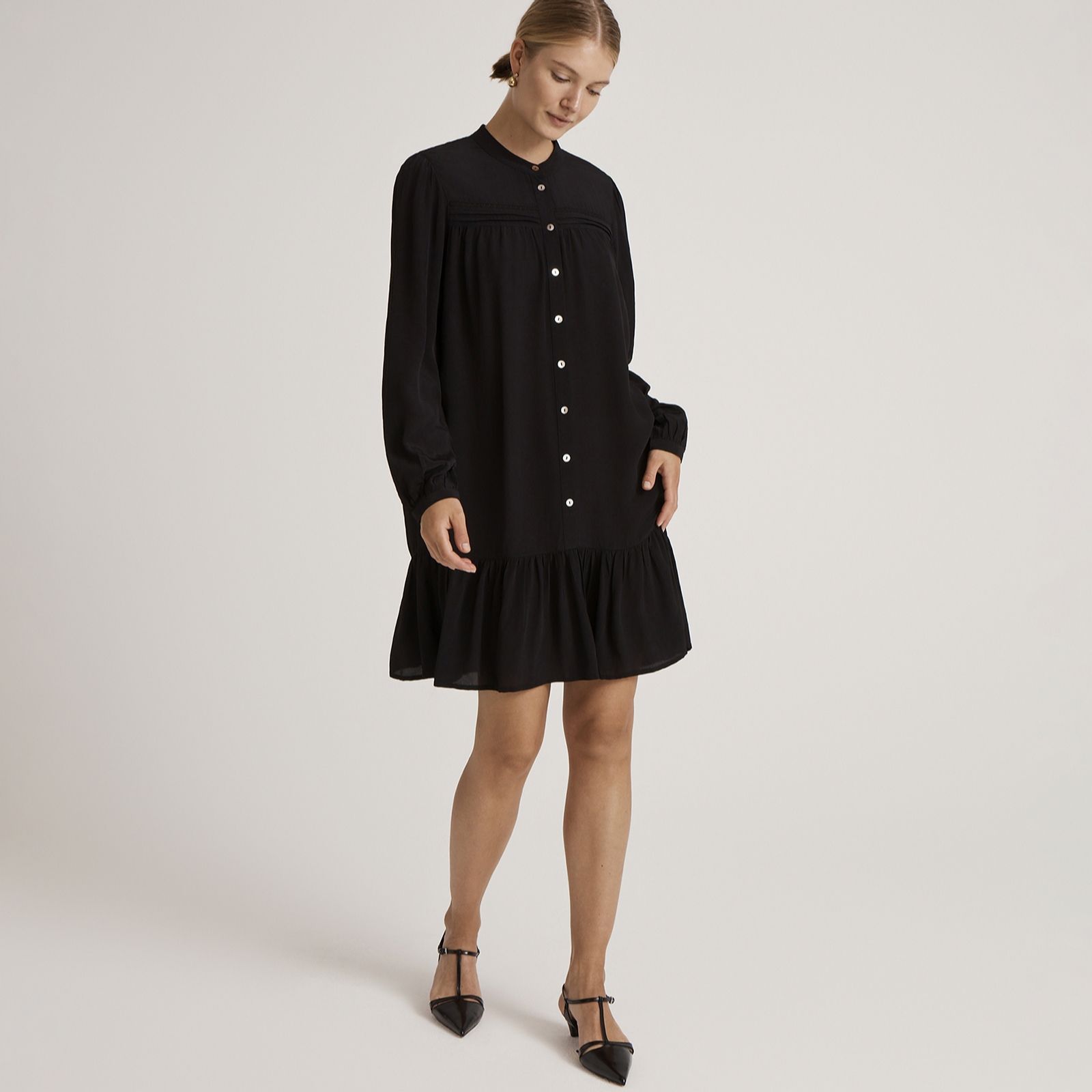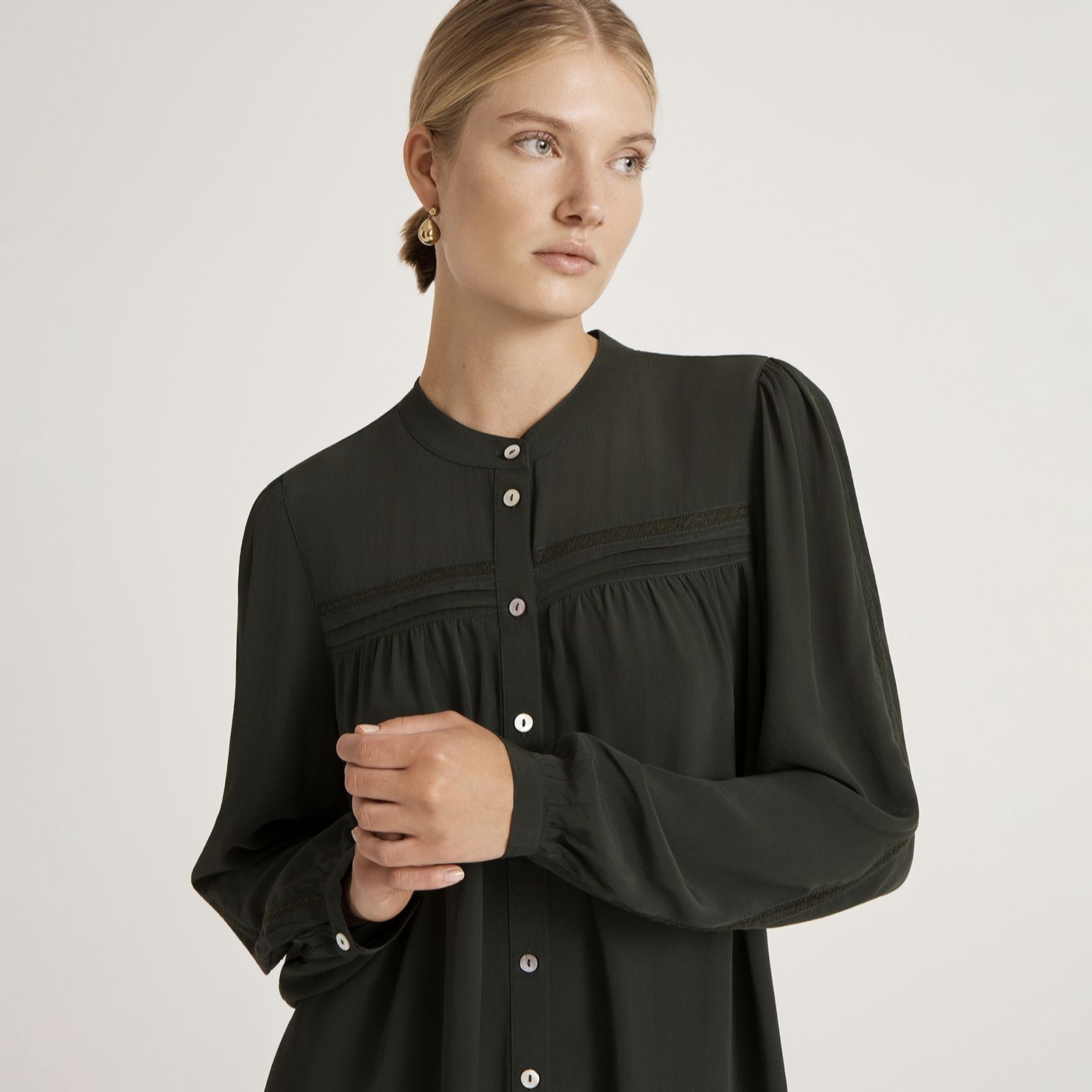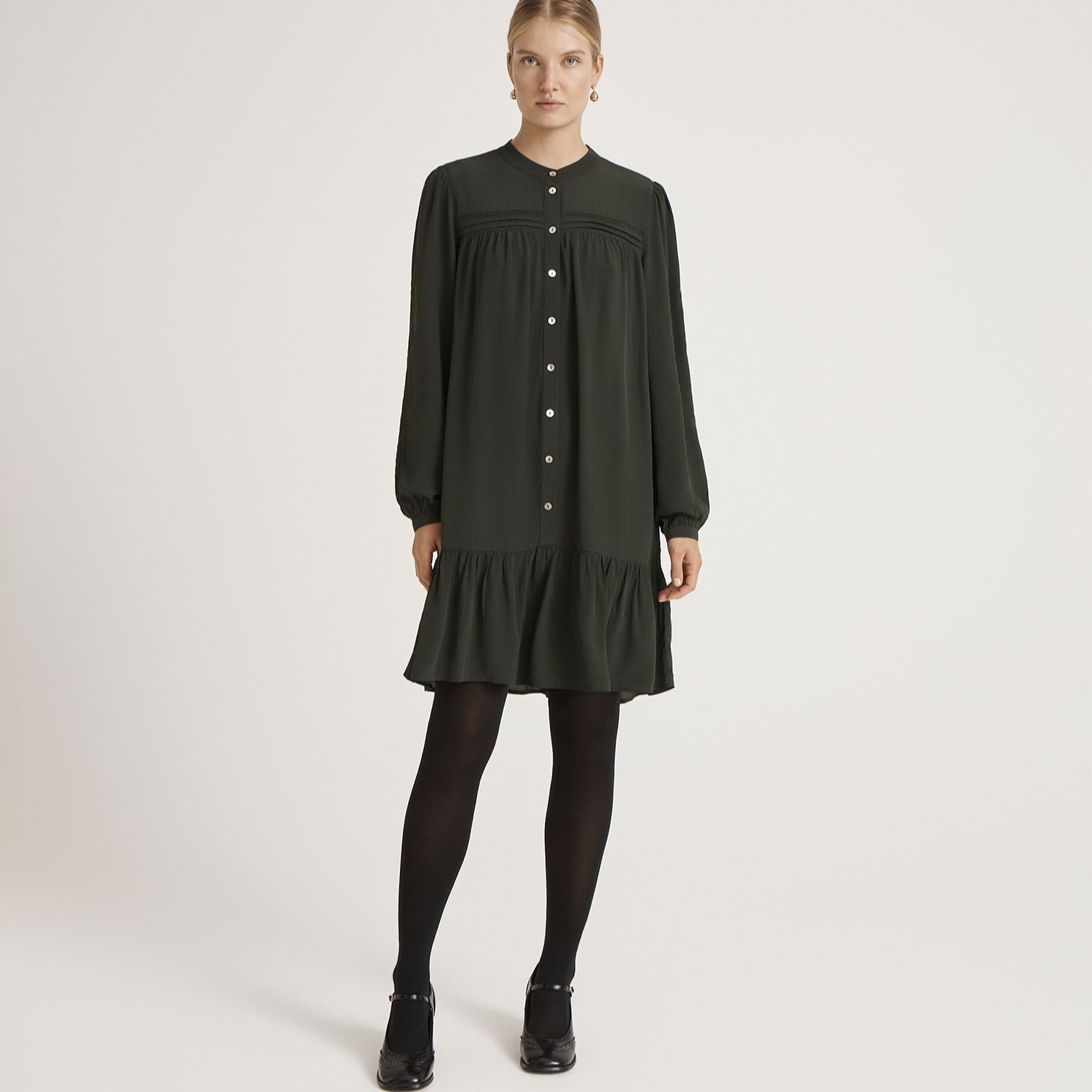 Indulge in the timeless romance of the Beccy mini dress from Finery London, a vintage-inspired piece adorned with delicate pintuck and lace trim detailing. Its mandarin collar and faux mother-of-pearl buttons add refined charm, while the long puff sleeves and tiered skirt create a soft, flowing silhouette. Perfect for both casual days and special evenings, style it with ankle boots for daytime chic or heels for an elegant night out.