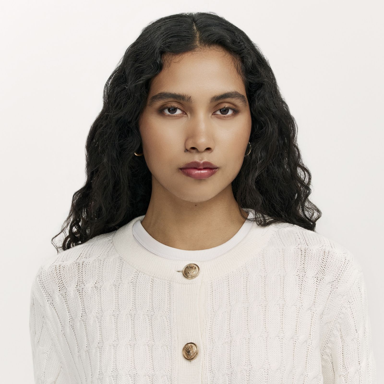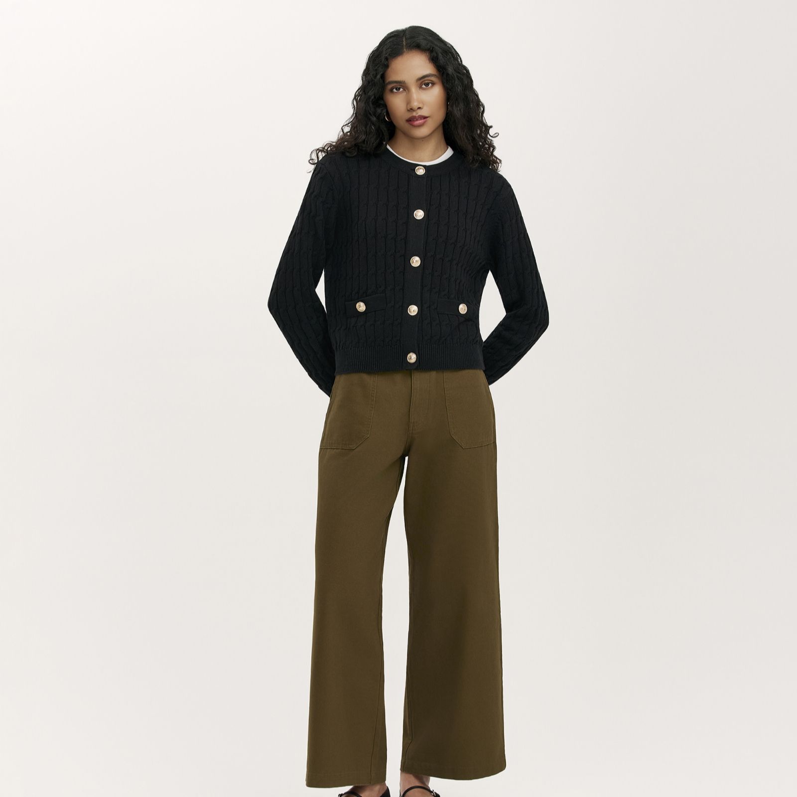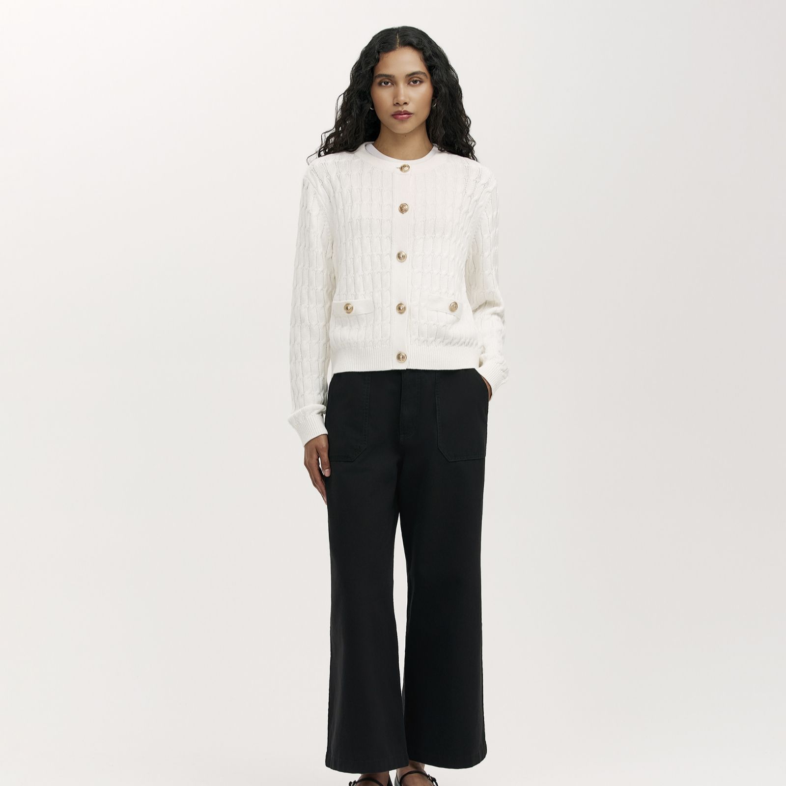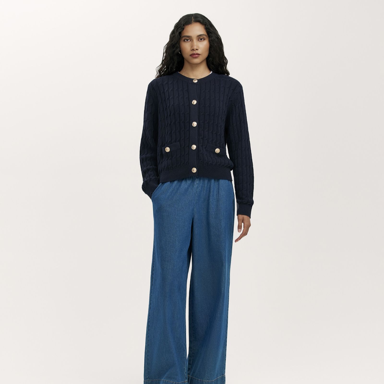 Wrap up in the Finery London Elaine button-up knitted cardigan, where classic cable knit meets gleaming gold-coloured buttons and a relaxed silhouette. This timeless piece is perfect for everything from weekend walks to productive office days, thanks to its cosy texture and practical front pockets. For effortless style, layer it over a white tee and black leggings to add warmth and readiness.