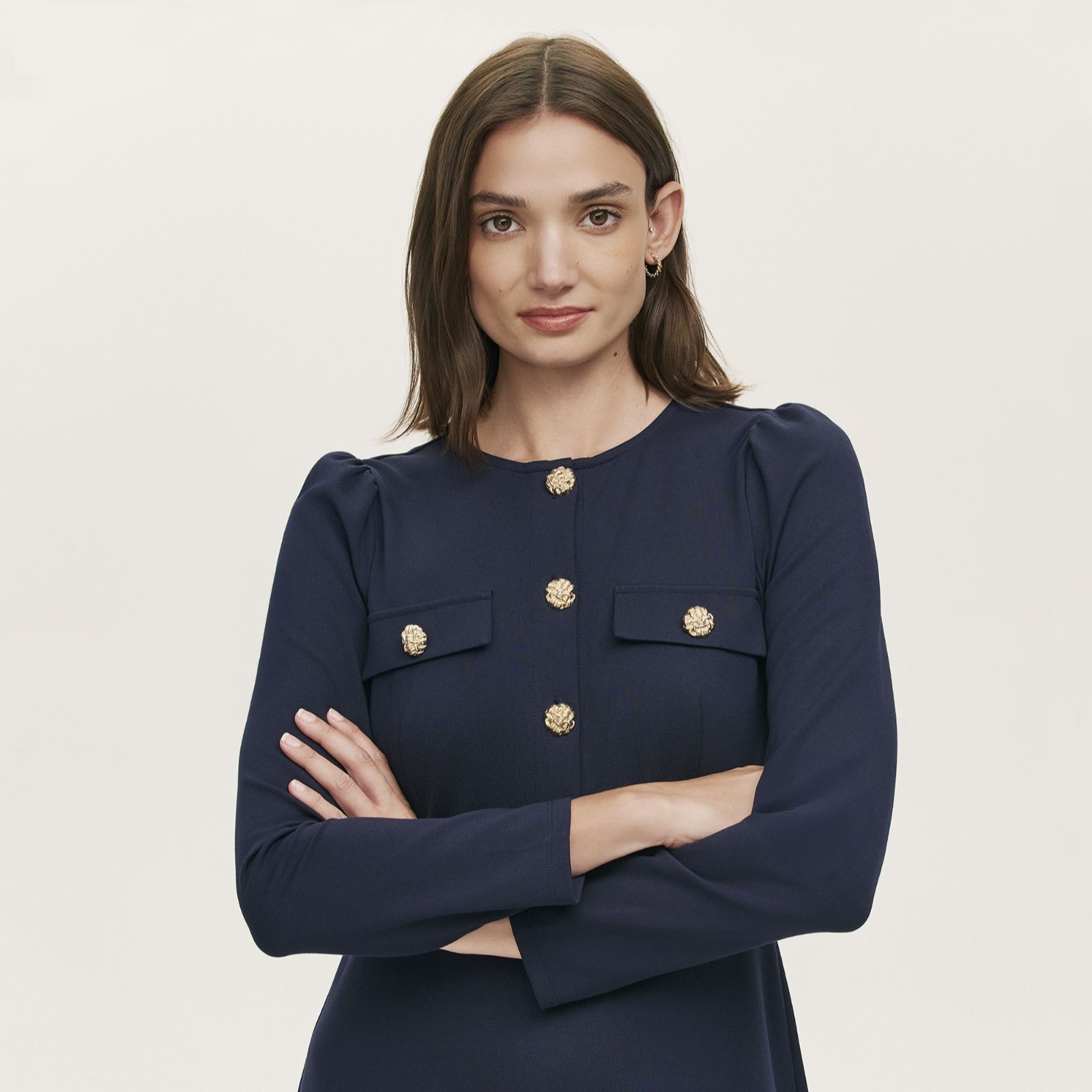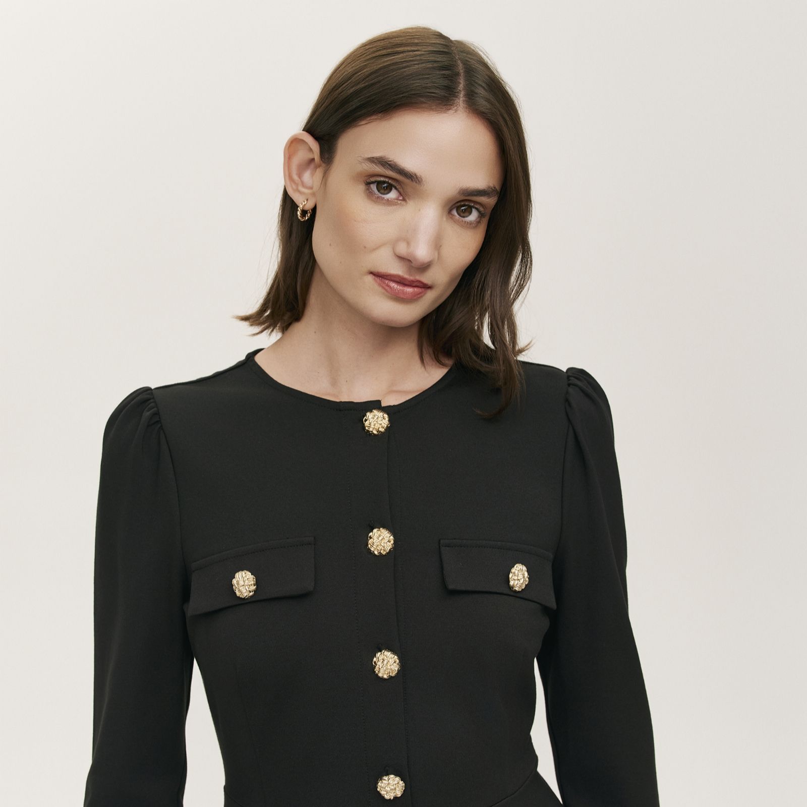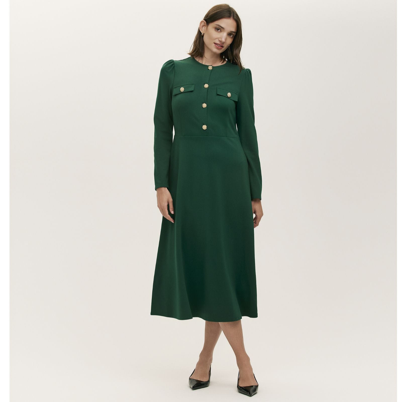 Make a lasting impression with the Gilly ponte dress from Finery London, an elegant midi cut that blends classic tailoring with contemporary gold button accents. Designed for as a transitional staple, this dress' full length straight sleeves and practical pockets make it an easy choice for work, events or weekend plans. Try pairing it with heeled boots for a polished finish.