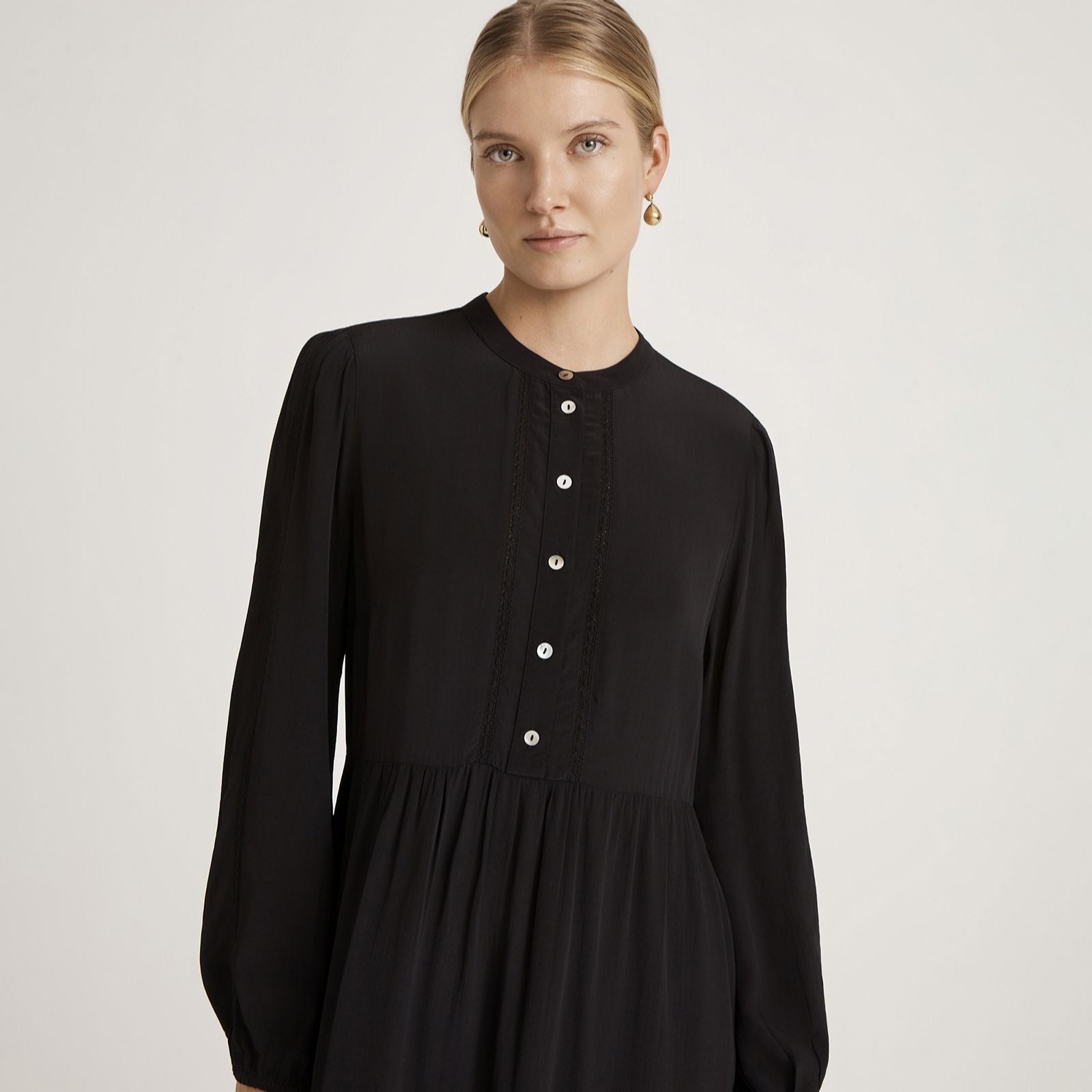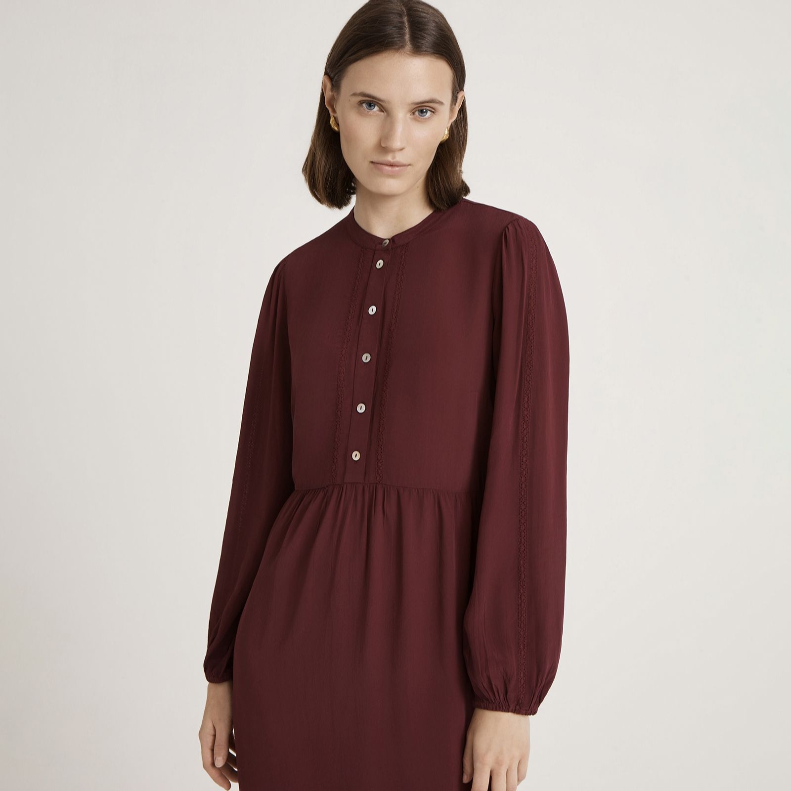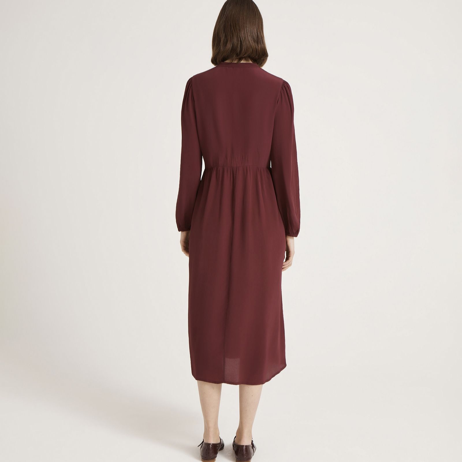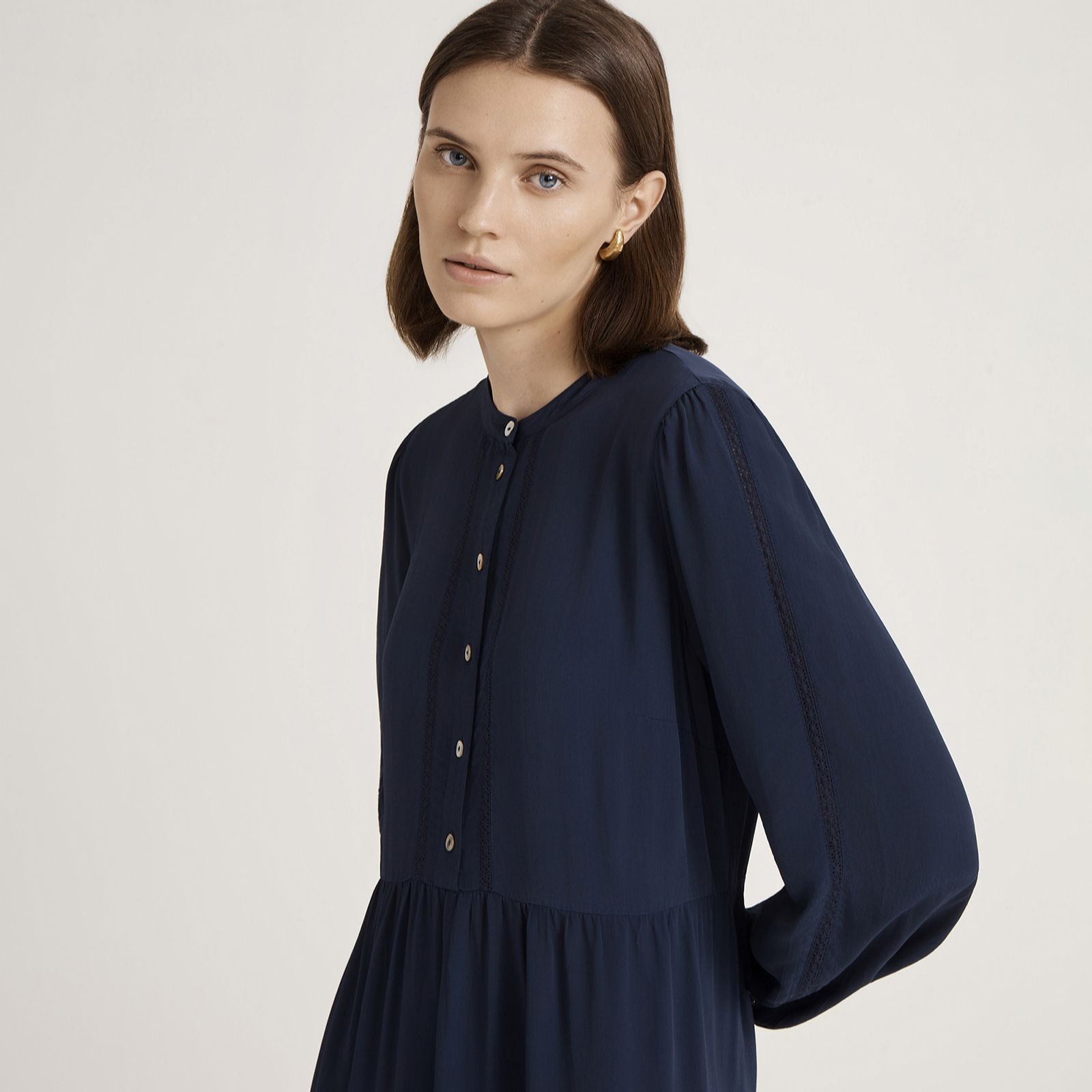 Channel timeless elegance with the Jasmine midi dress from Finery London, a vintage-inspired piece adorned with a delicate mandarin collar, faux mother-of-pearl buttons and romantic lace trim. The long puff sleeves with buttoned cuffs and flowing crepe fabric make this dress ideal for everything from daytime outings to evening gatherings. Pair with heeled boots and a tailored coat for a chic, polished look.