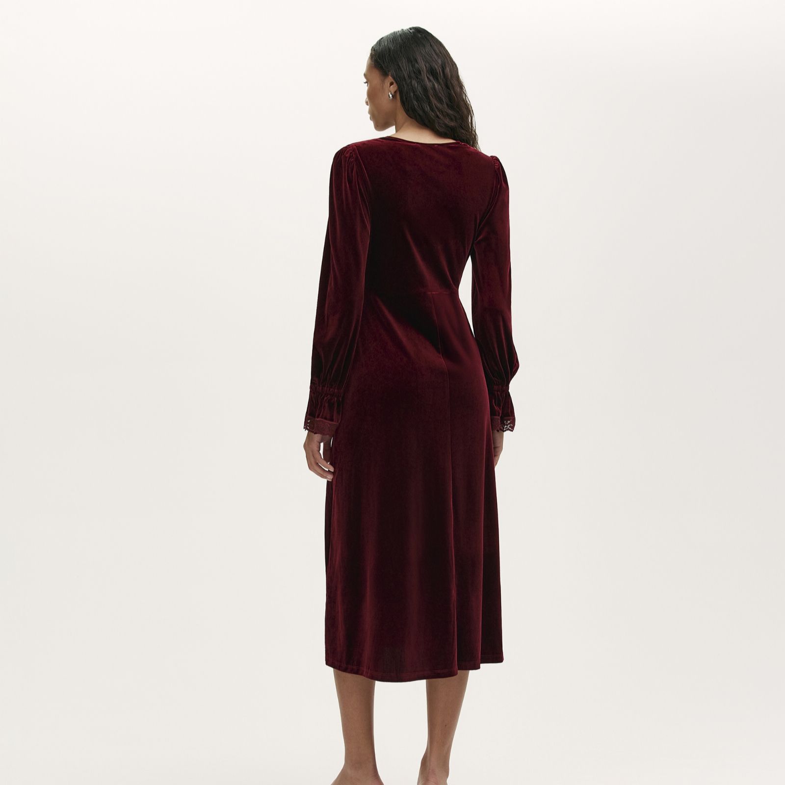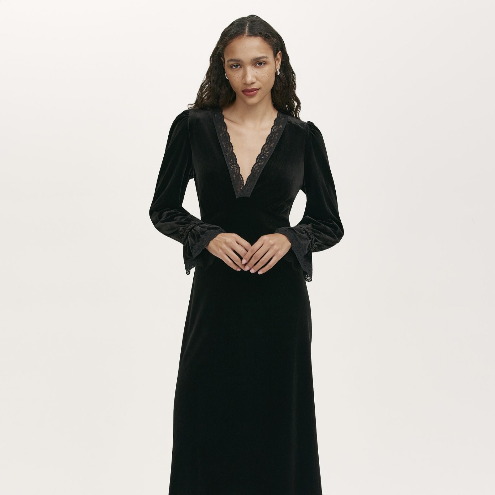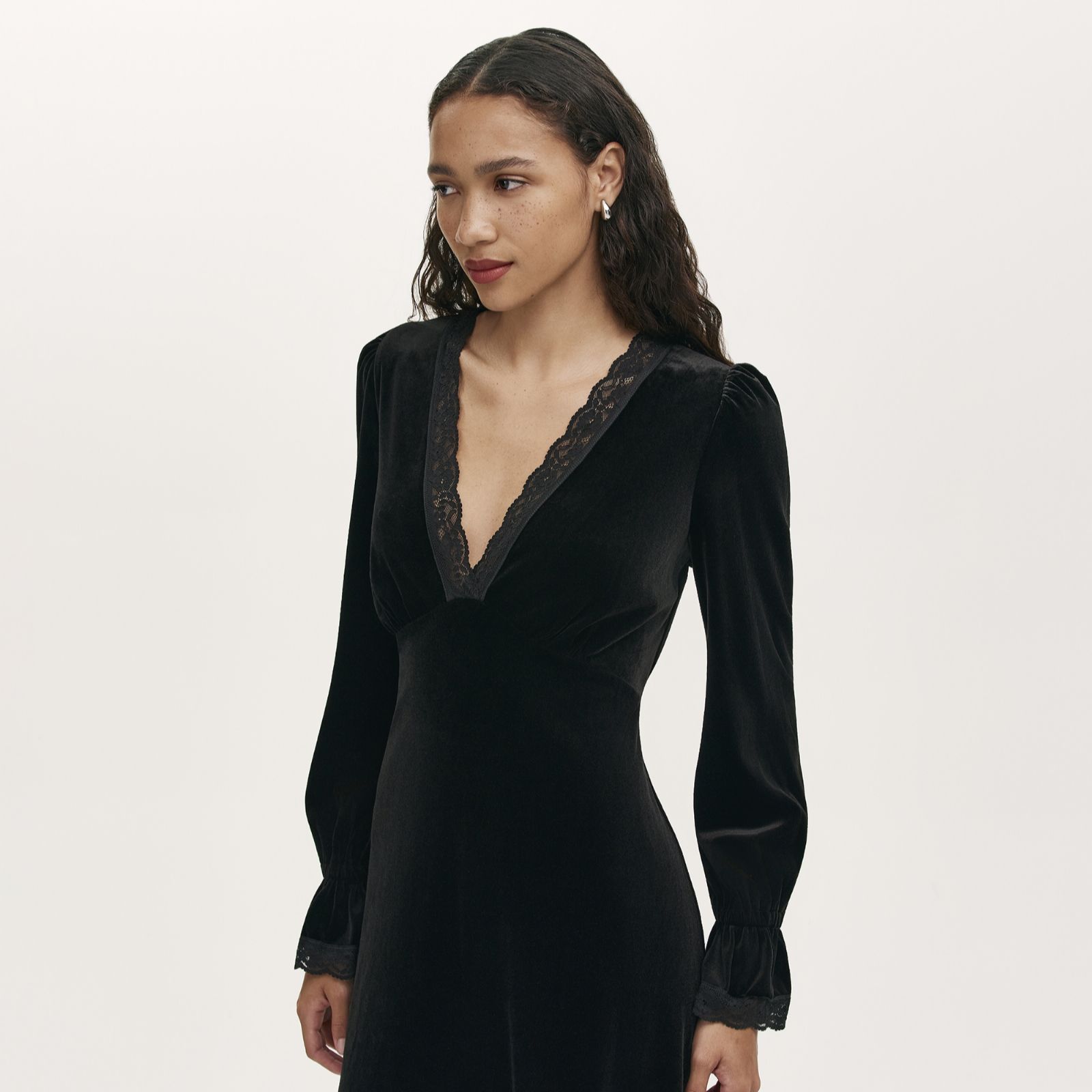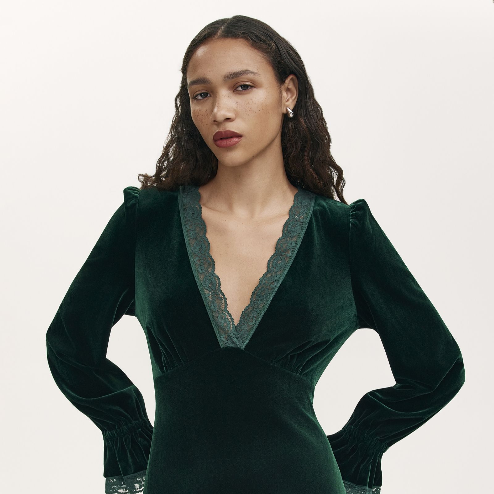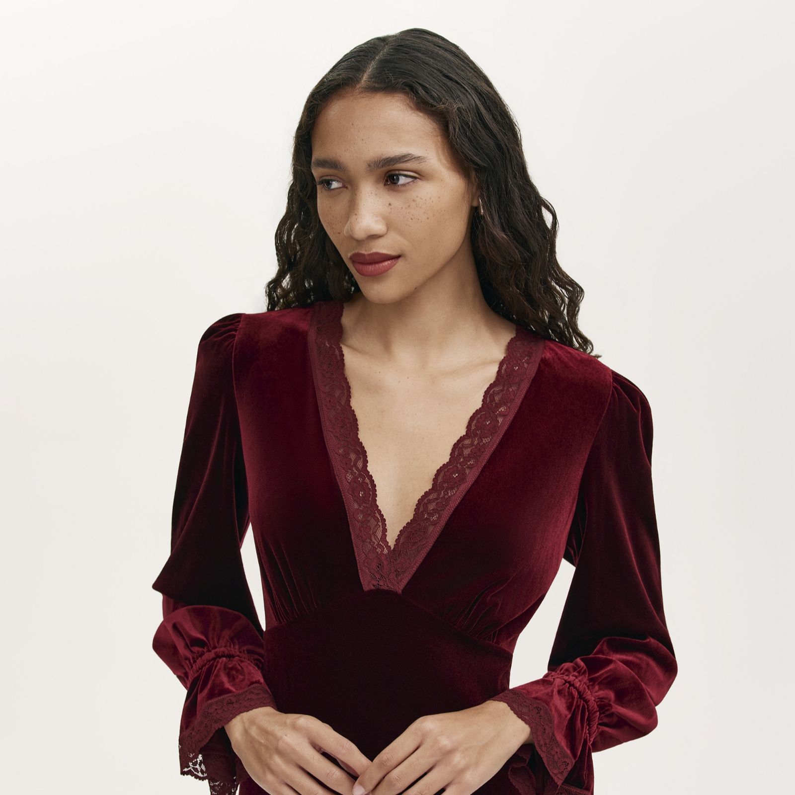Slip into the romantic allure of the Louise midi dress from Finery London, where plush stretch velvet and delicate lace trims create a look that's both soft and striking. Perfect for evening events, dinner dates or festive gatherings, its empire silhouette and ruffled cuffs offer timeless elegance with a modern twist. Pair with heeled boots and a statement clutch for effortless sophistication.