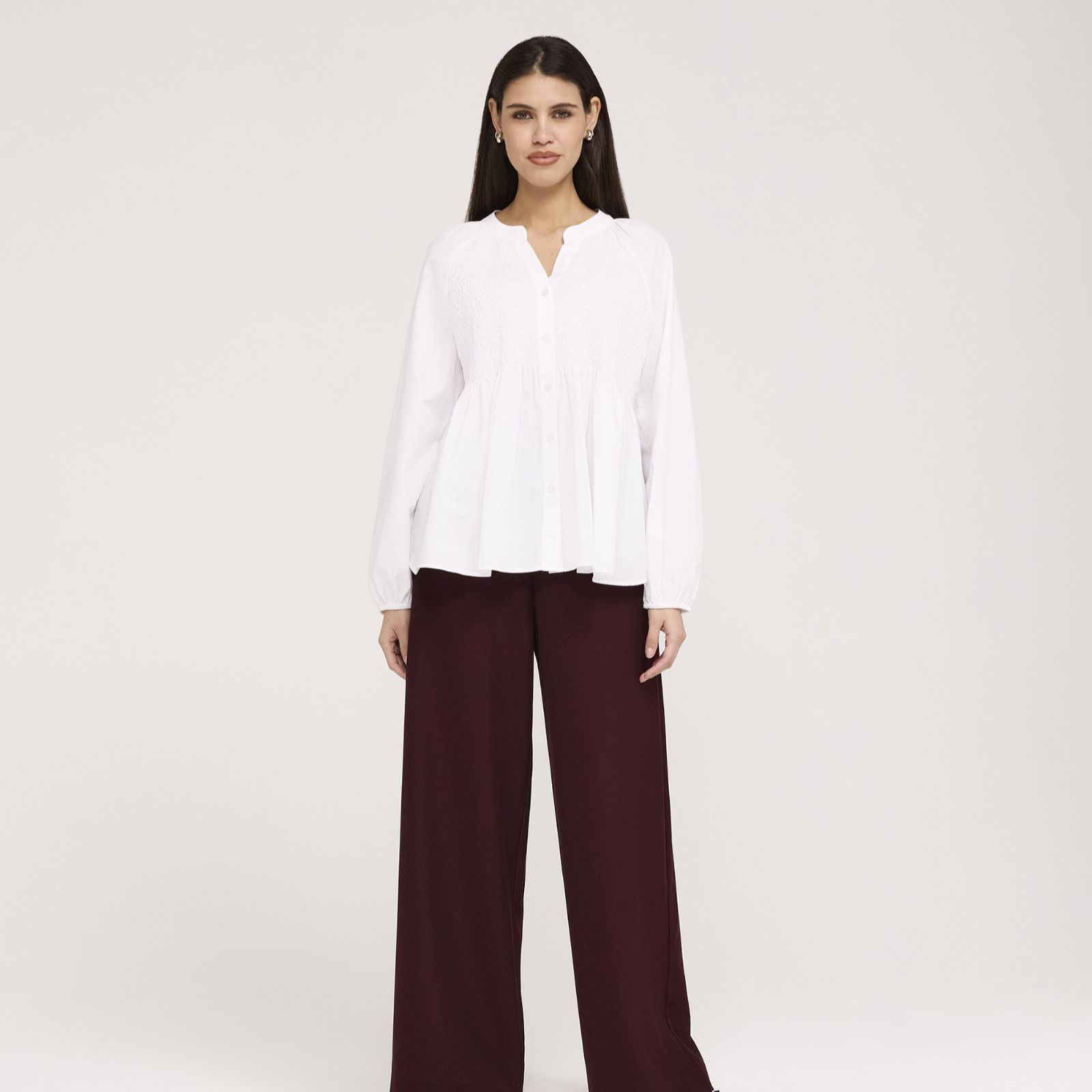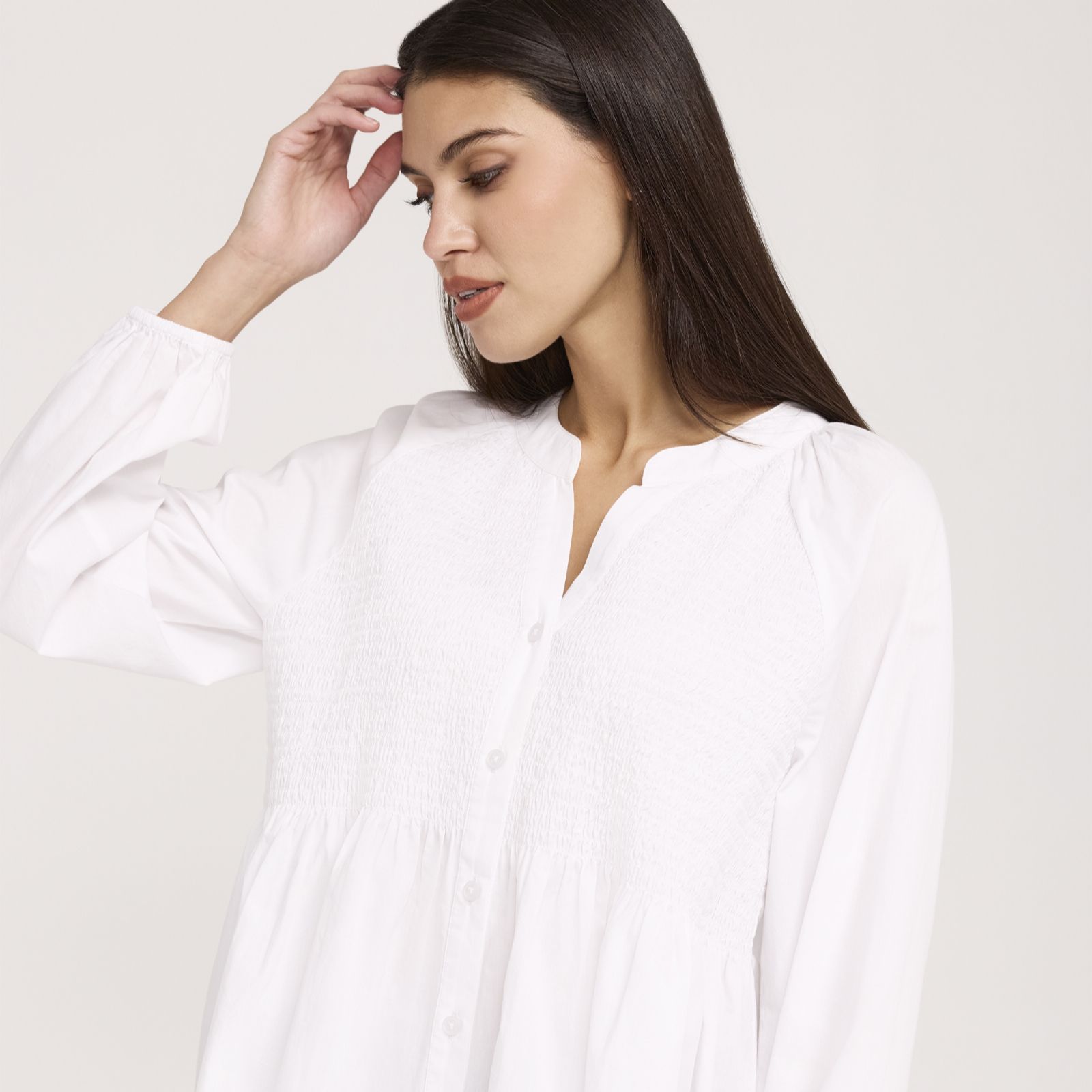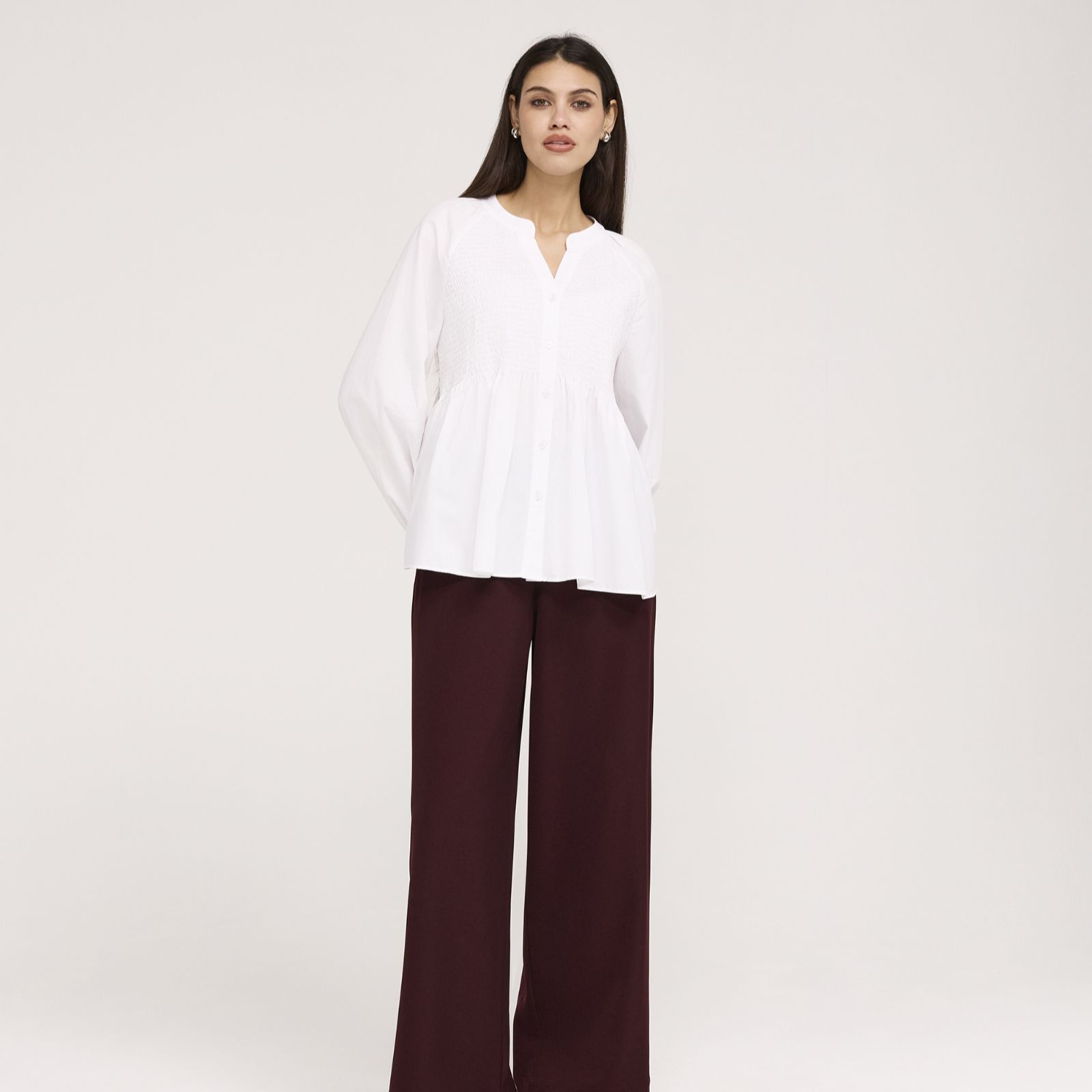 Exude carefree elegance with the Martha ruched detail blouse from Finery London, a loose-fit design that blends comfort with everlasting style. The button-through front and raglan long sleeves create a relaxed silhouette, while the shirred front and back bodice gently define the waist. Perfect for everything from casual brunches to smart office days, it pairs beautifully with tailored trousers or your favourite jeans for effortless chic.