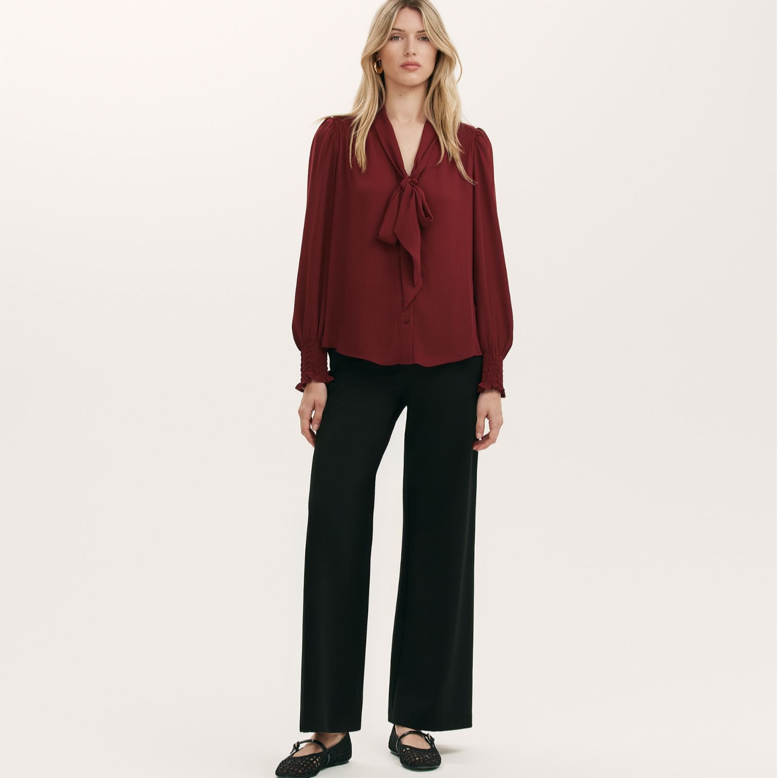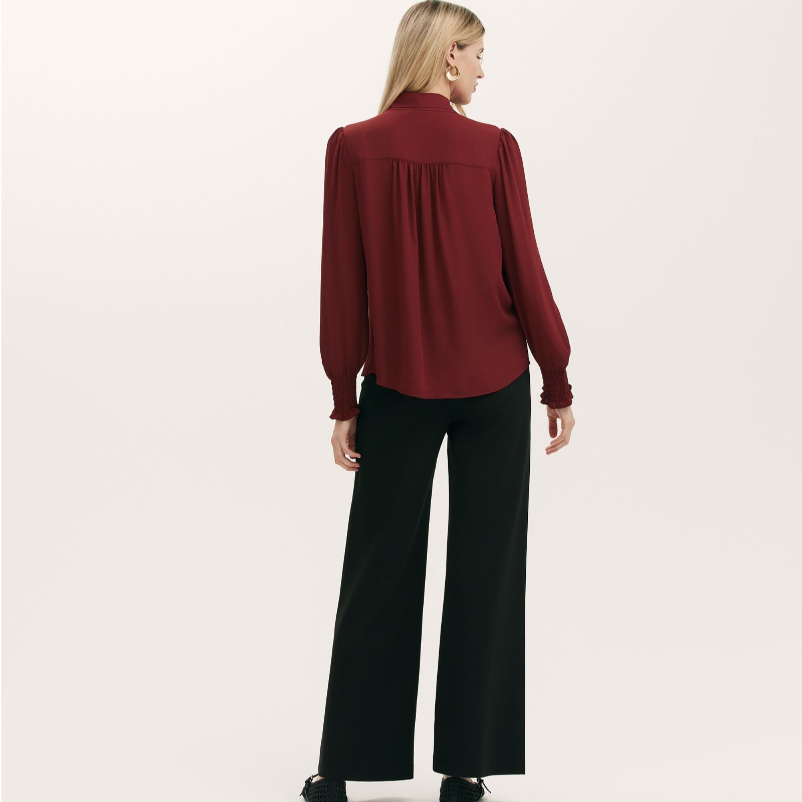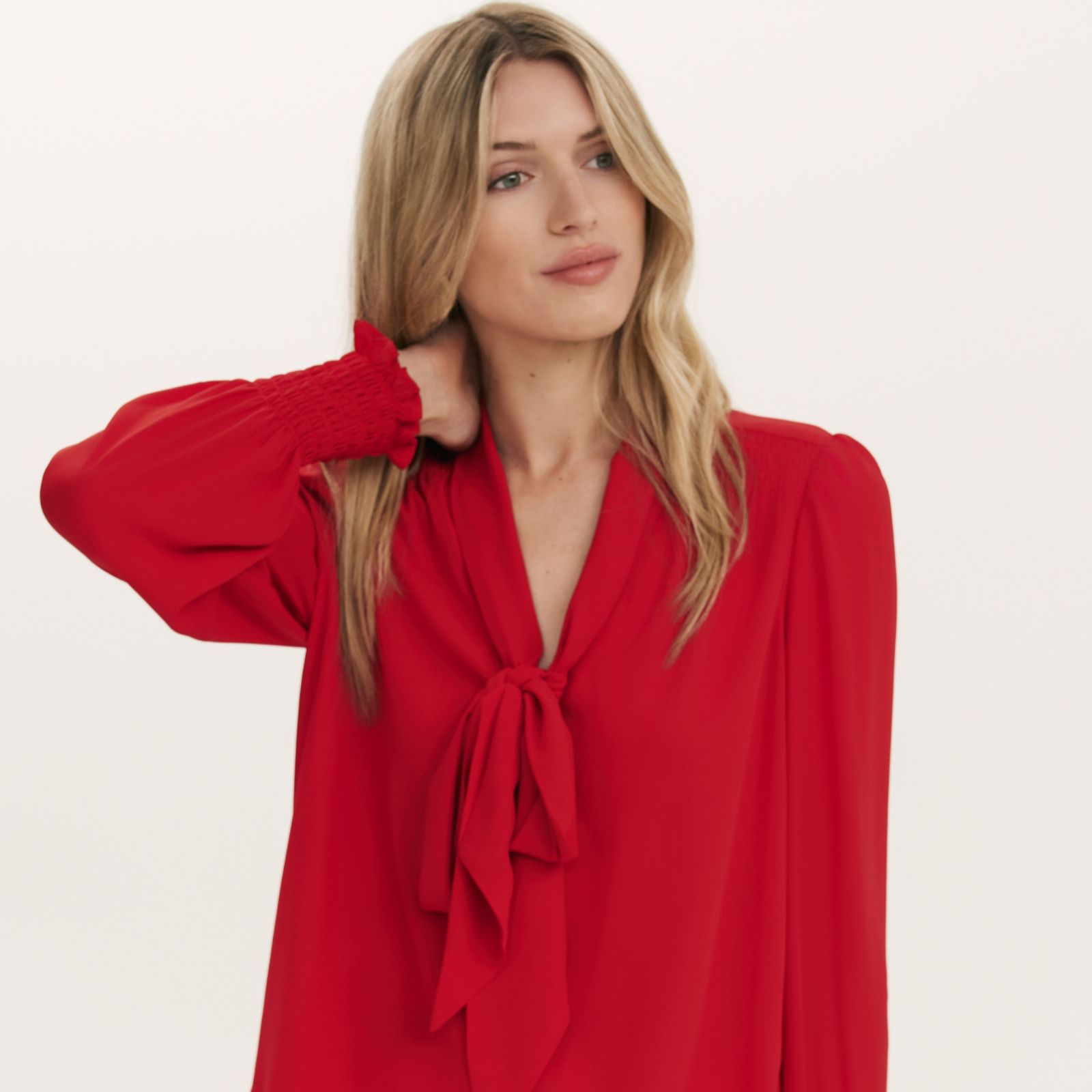- Long blouson sleeves with shirred, frill-detailed cuffs