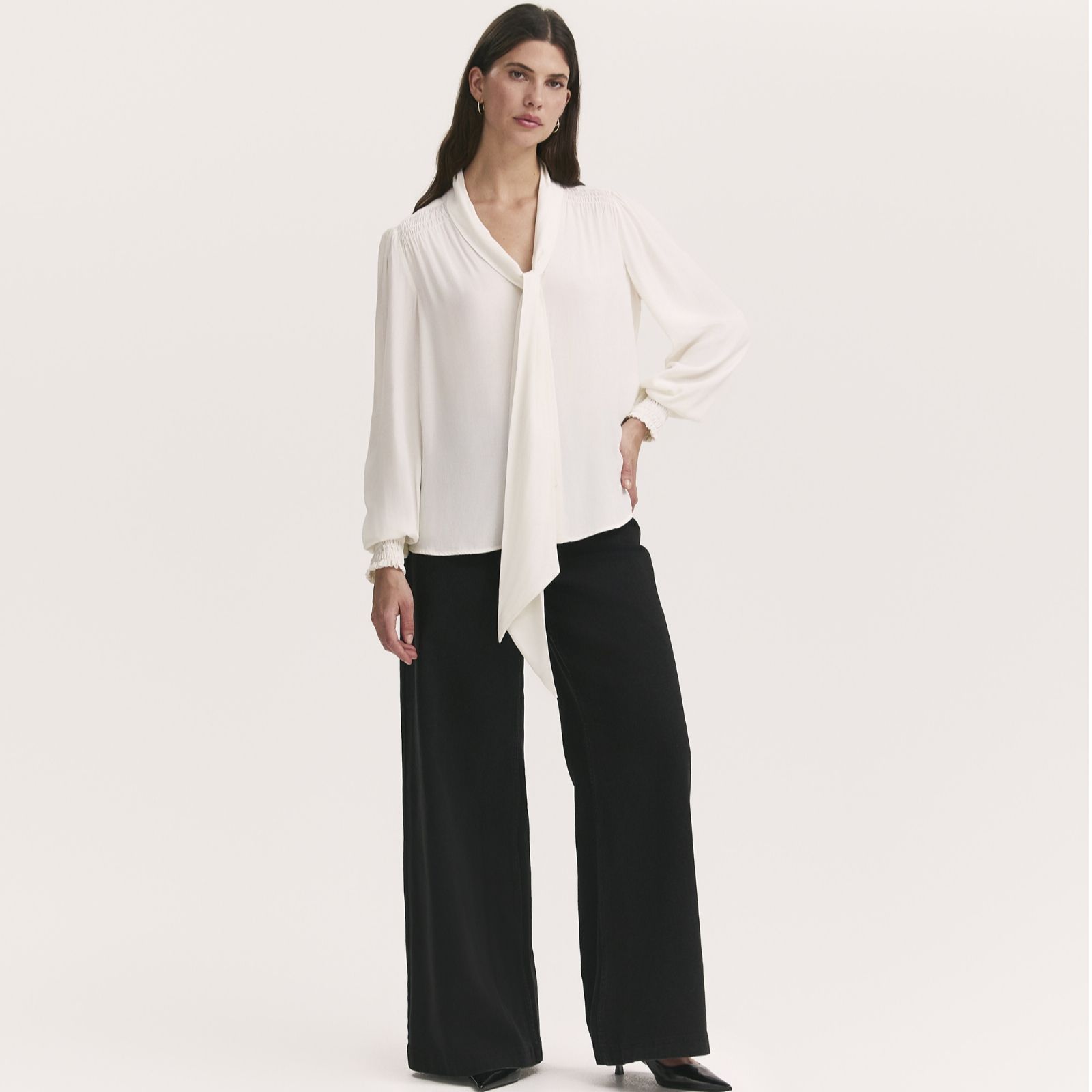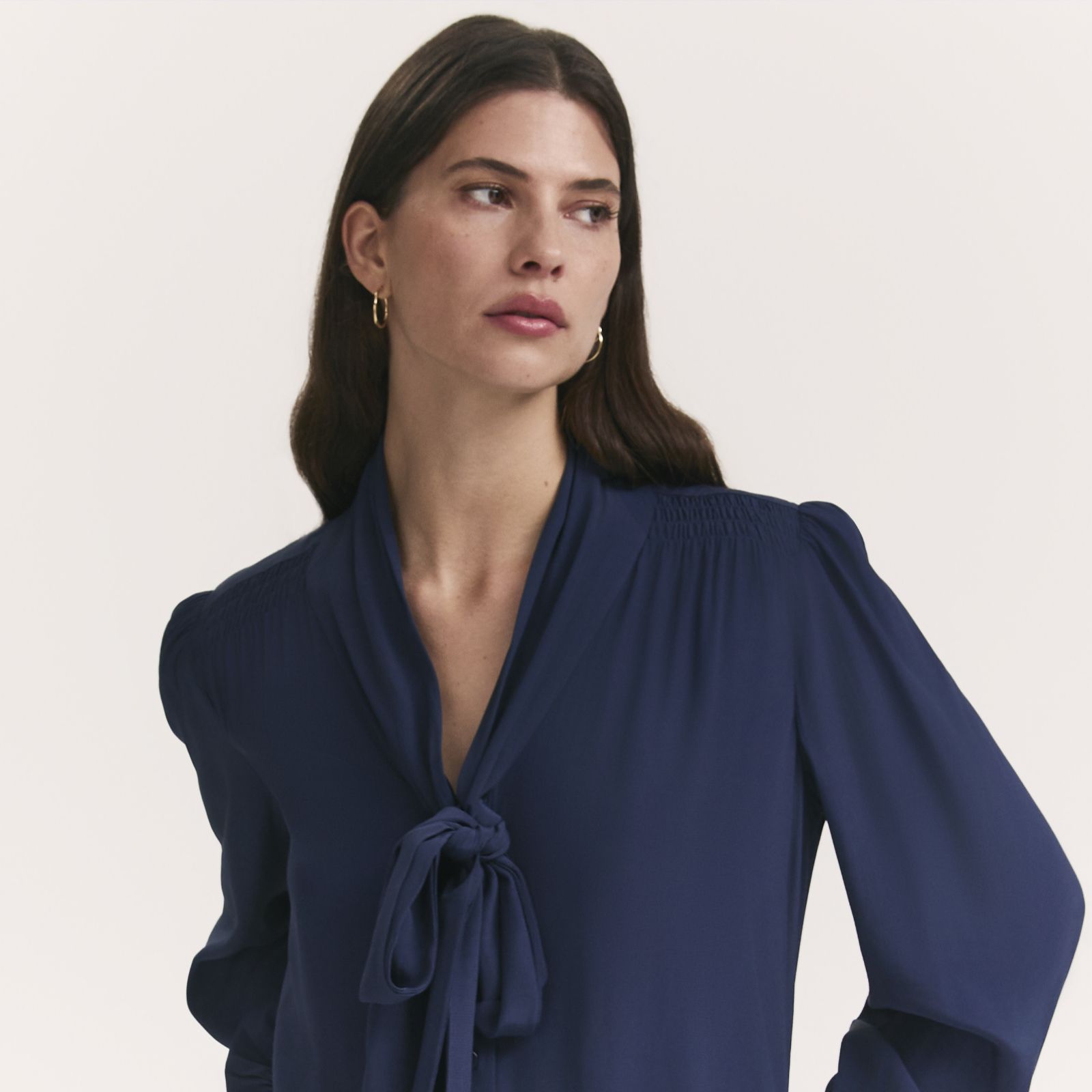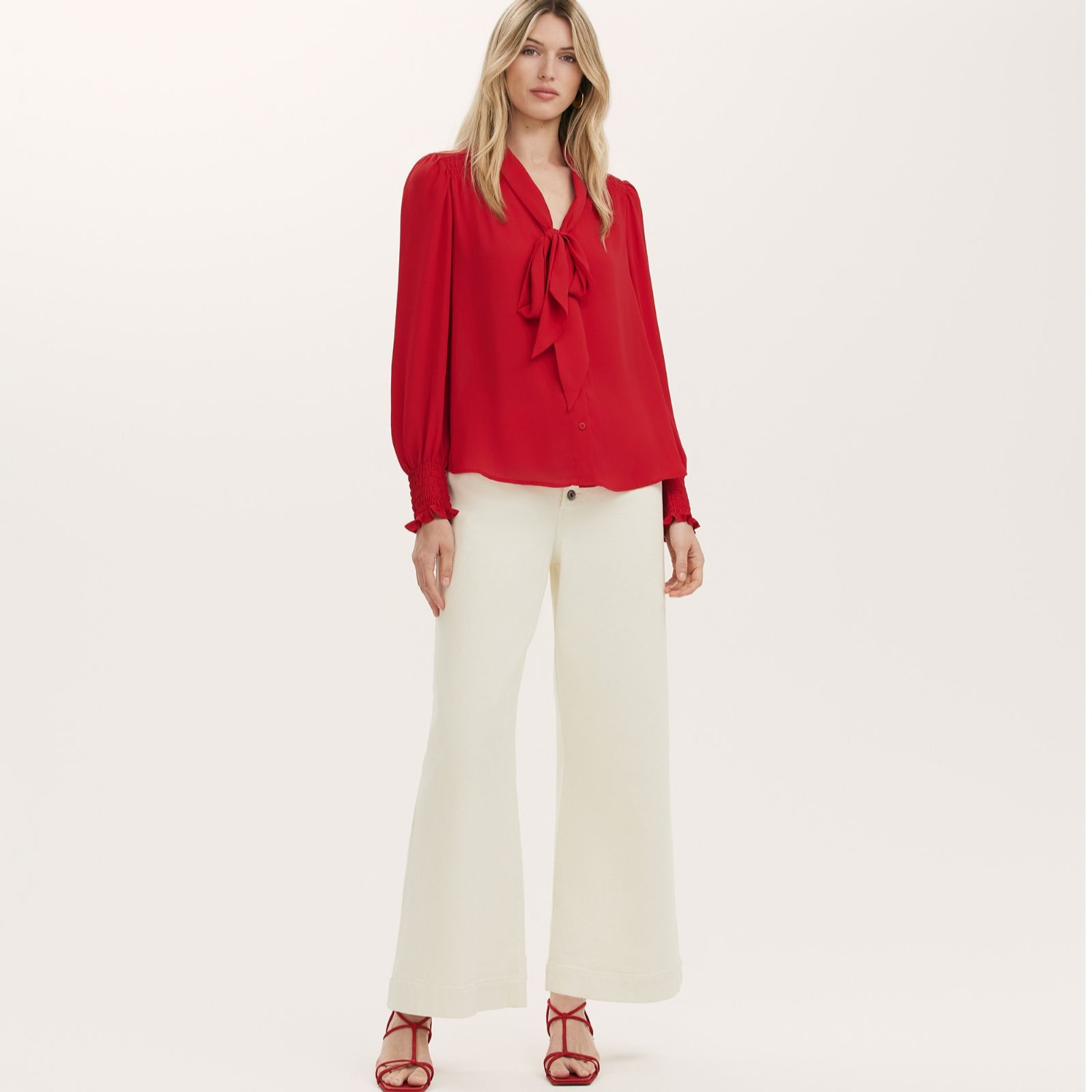 - Long blouson sleeves with shirred, frill-detailed cuffs
