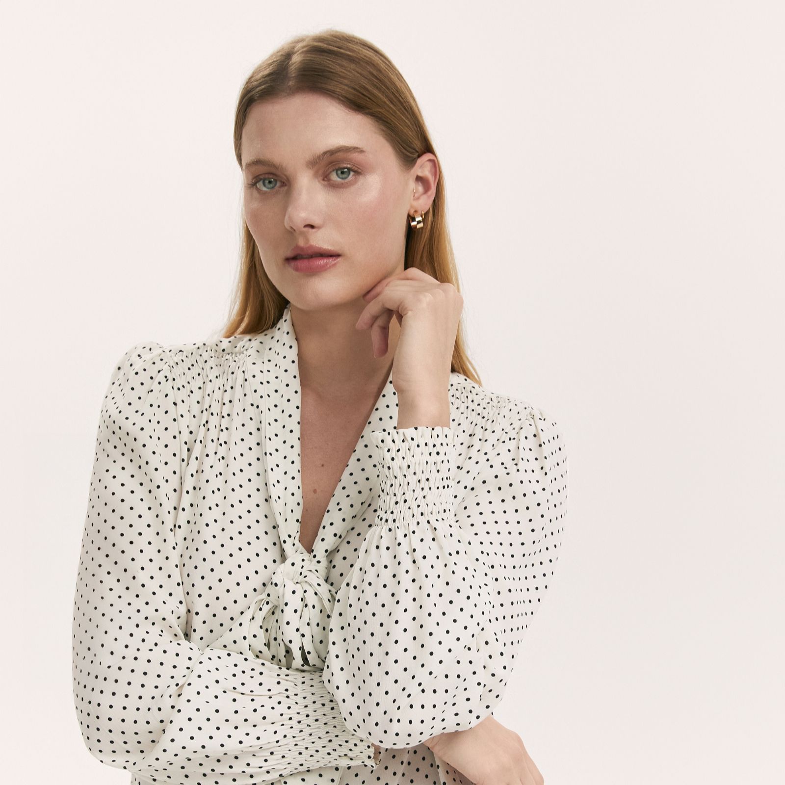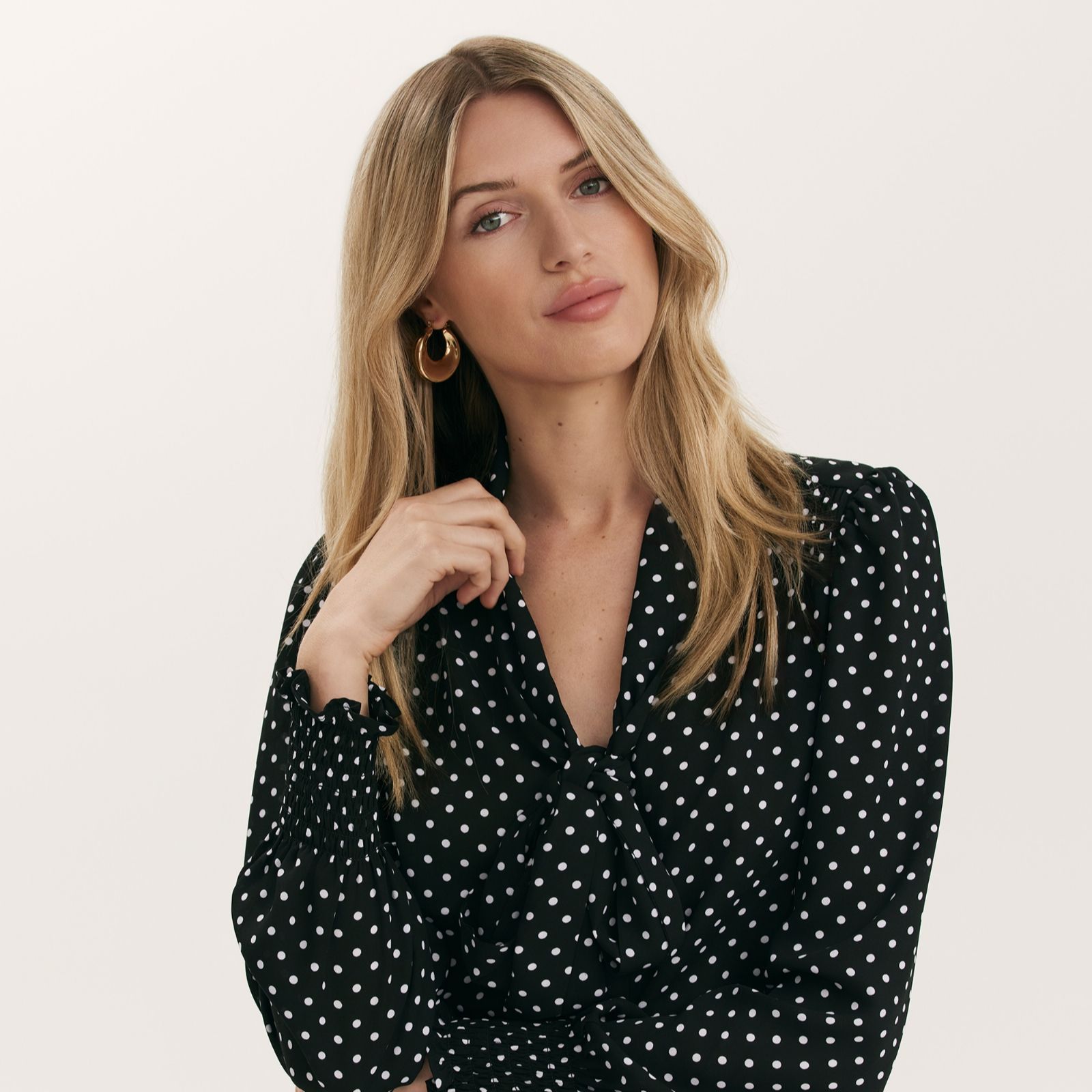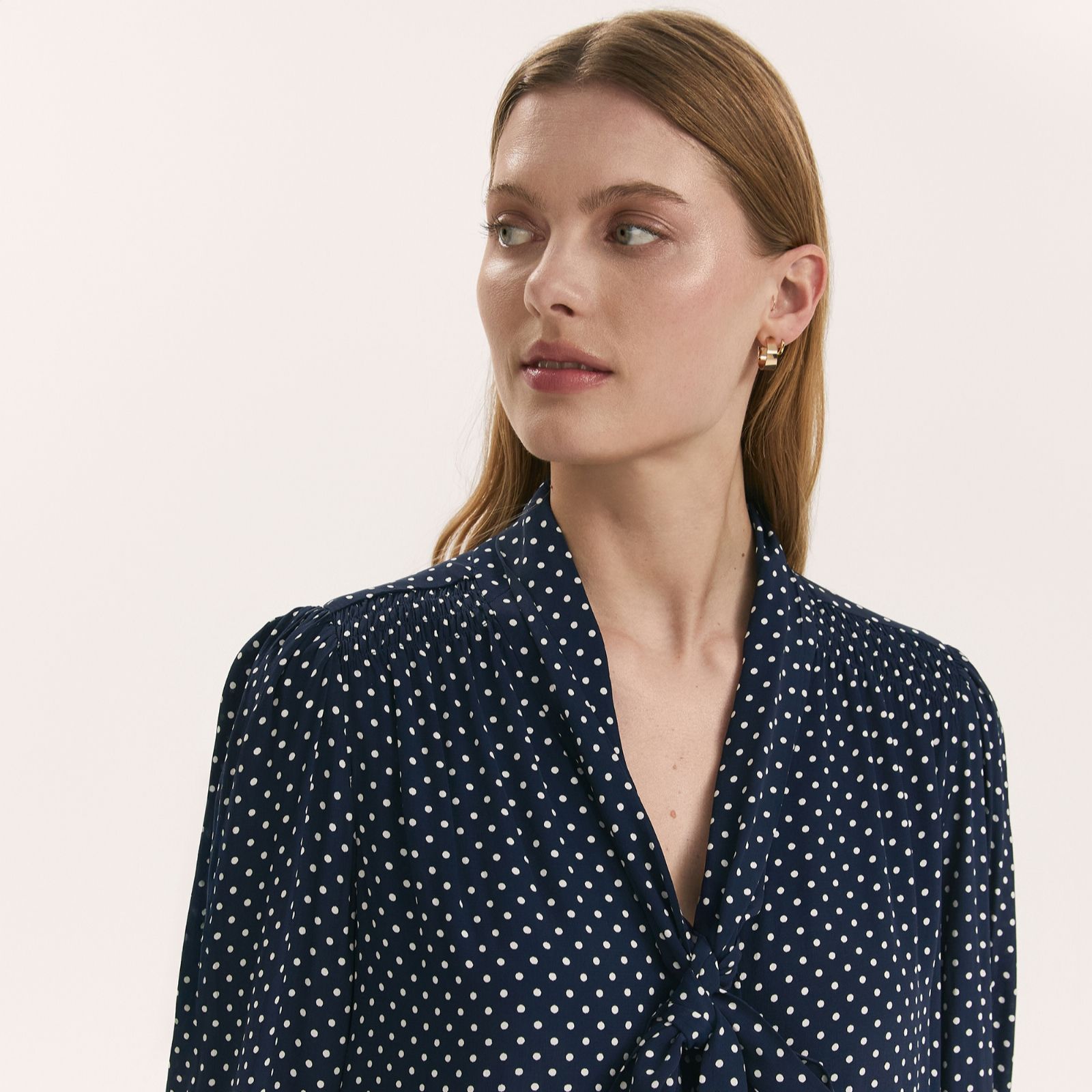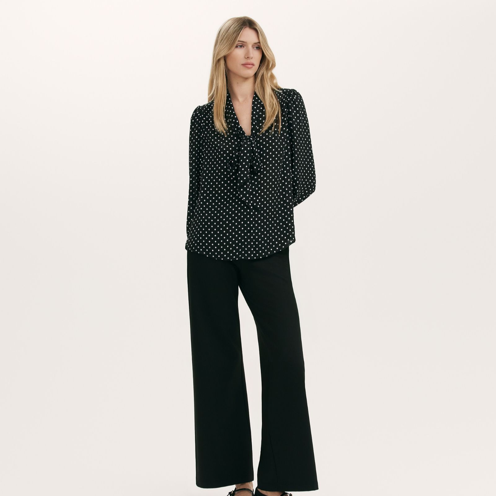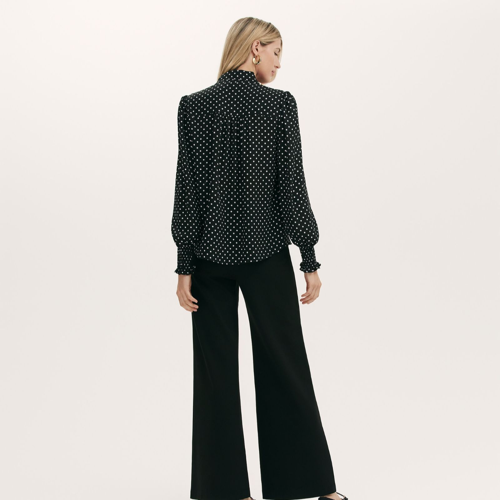 Channelling timeless elegance, the Mavis spot print crepe pussy bow blouse from Finery London brings a playful twist to classic tailoring with its delicate frill-trimmed shirred cuffs and a versatile necktie for that signature pussybow look. Whether you're heading to the office or dressing up for an evening out, this blouse offers effortless sophistication. Try pairing it with tailored trousers or a sleek pencil skirt for a polished finish.