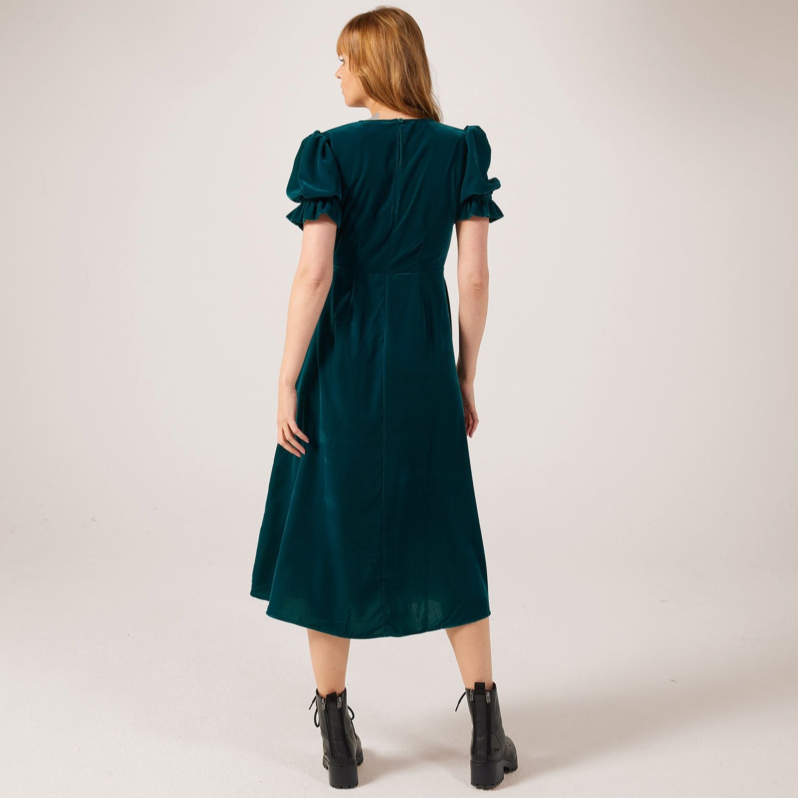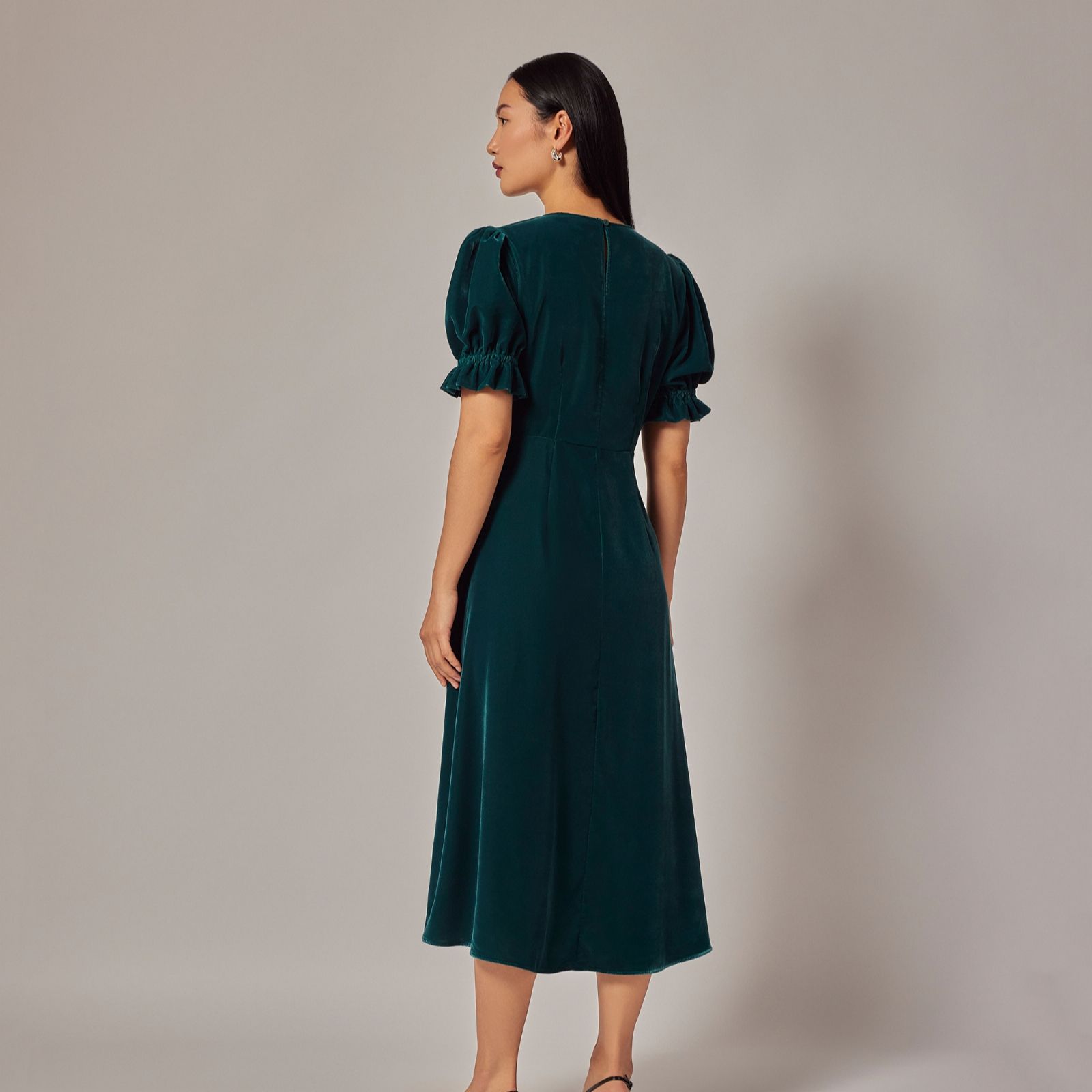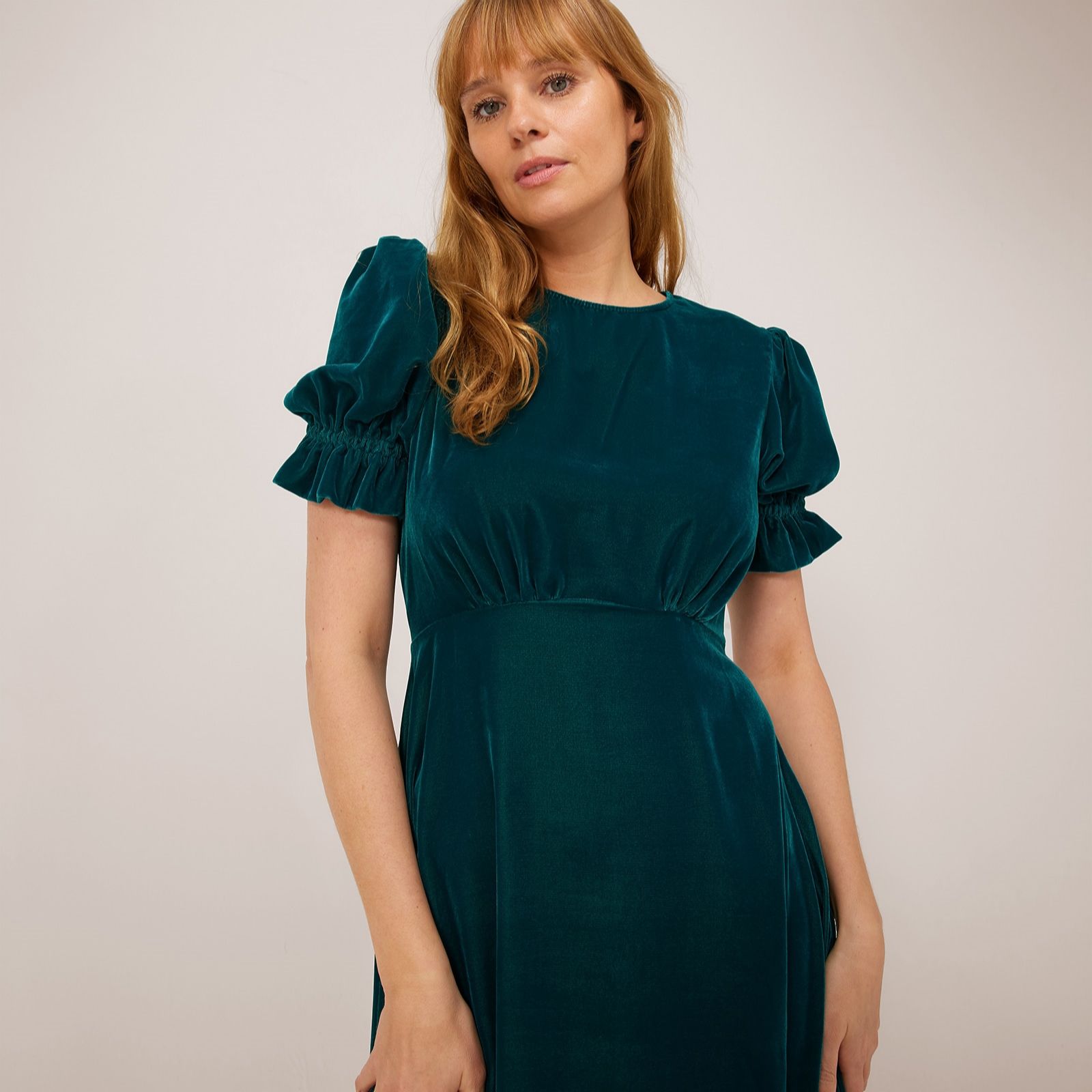 Elevate your wardrobe with the Mela stretch velvet midi dress from Finery London. This elegant dress boasts a sophisticated round neckline and an empire line waist seam that beautifully enhances your silhouette. The short sleeves with elasticated cuffs and ruffle detail add a touch of feminine charm, while the rear keyhole fastening ensures ease of wear. Perfect for any occasion, pair it with your favourite heels and a clutch.