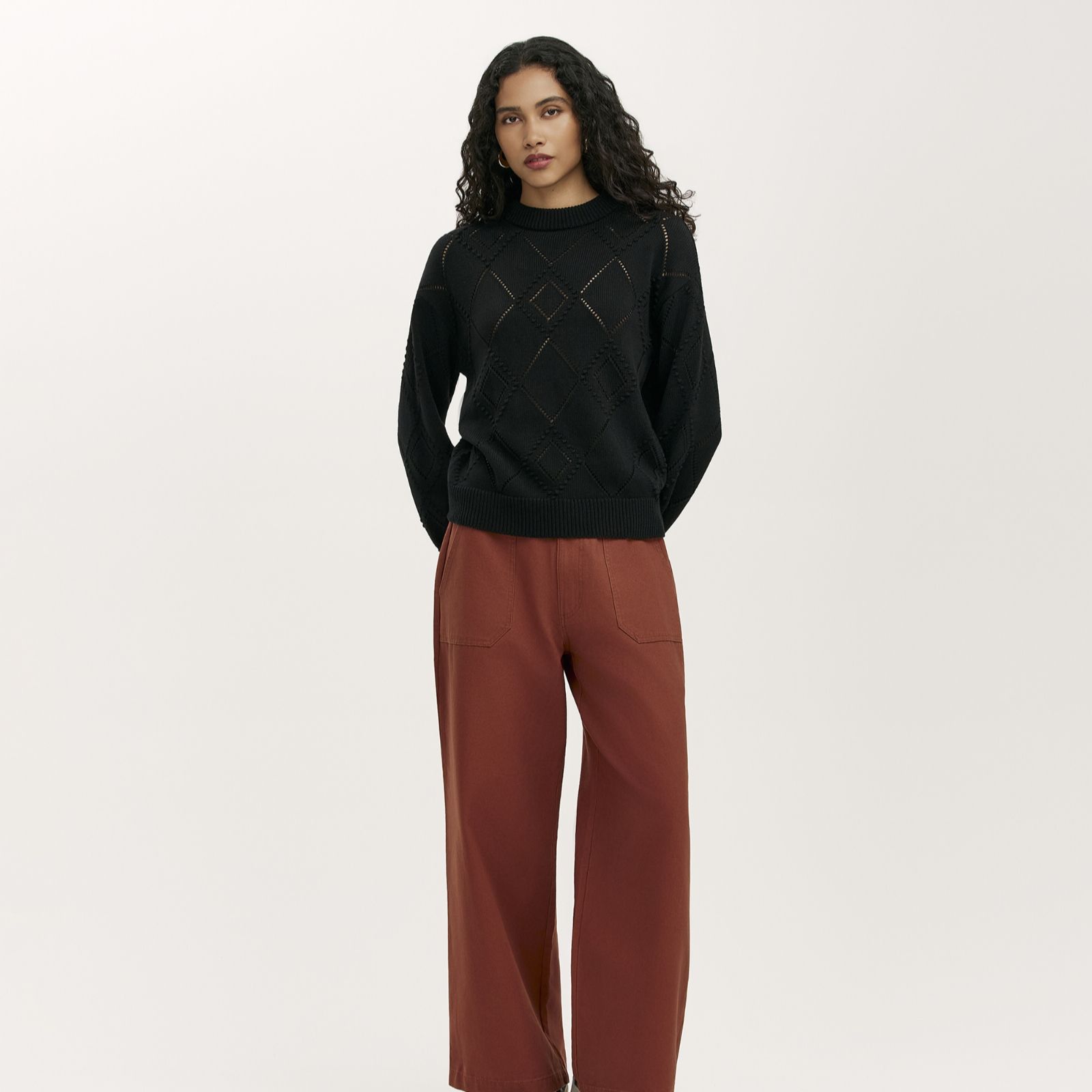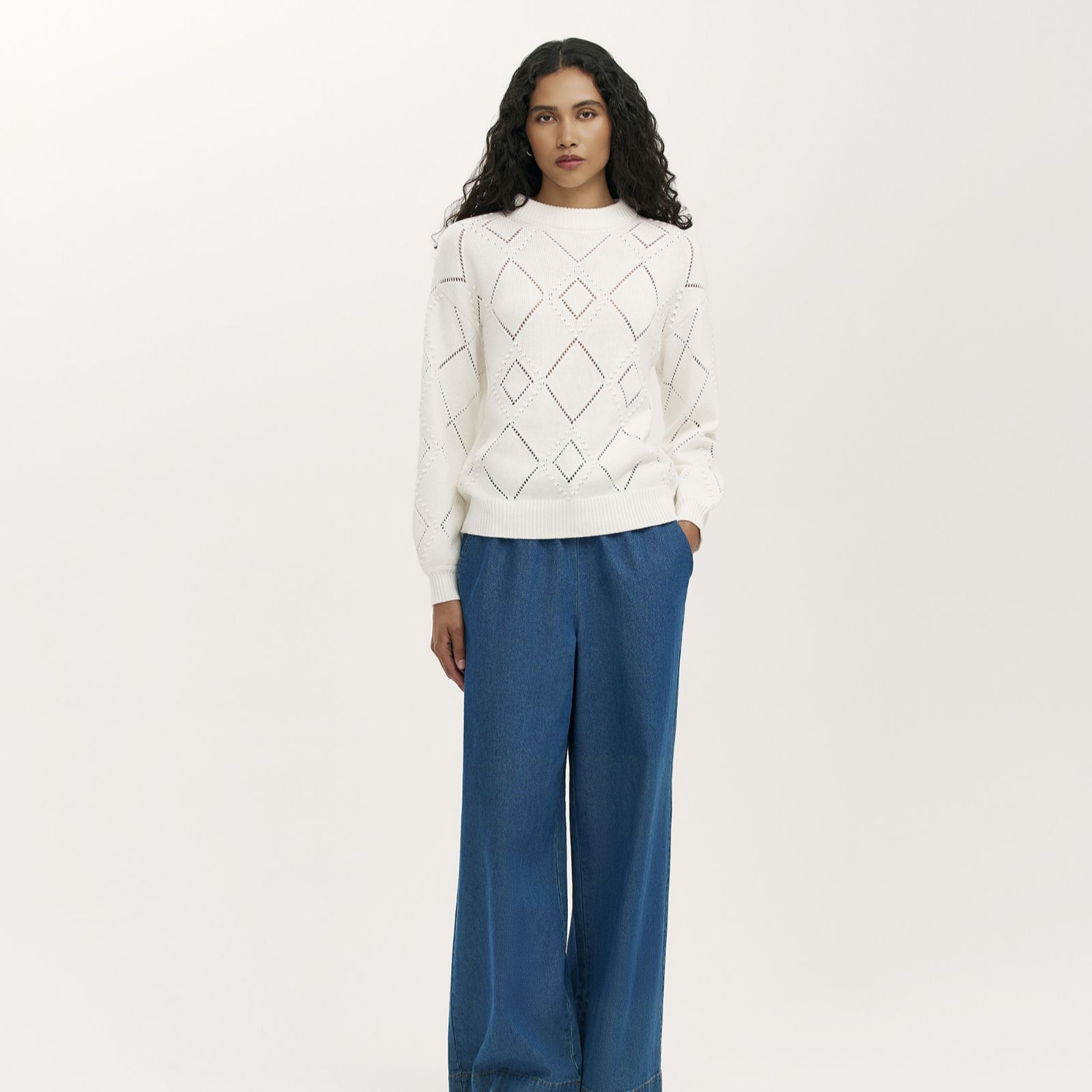 Enjoy effortless style with the Odette jumper from Finery London, crafted in a delicate diamond pointelle knit that gives a timeless, textured finish. Its round neckline and long sleeves, paired with ribbed trims, offer a flattering silhouette and subtle elegance for every day. Whether layered over a collared shirt for work or worn solo on weekends, Odette brings sophistication to both casual and refined looks. Try styling it with tailored trousers and loafers for a polished ensemble.