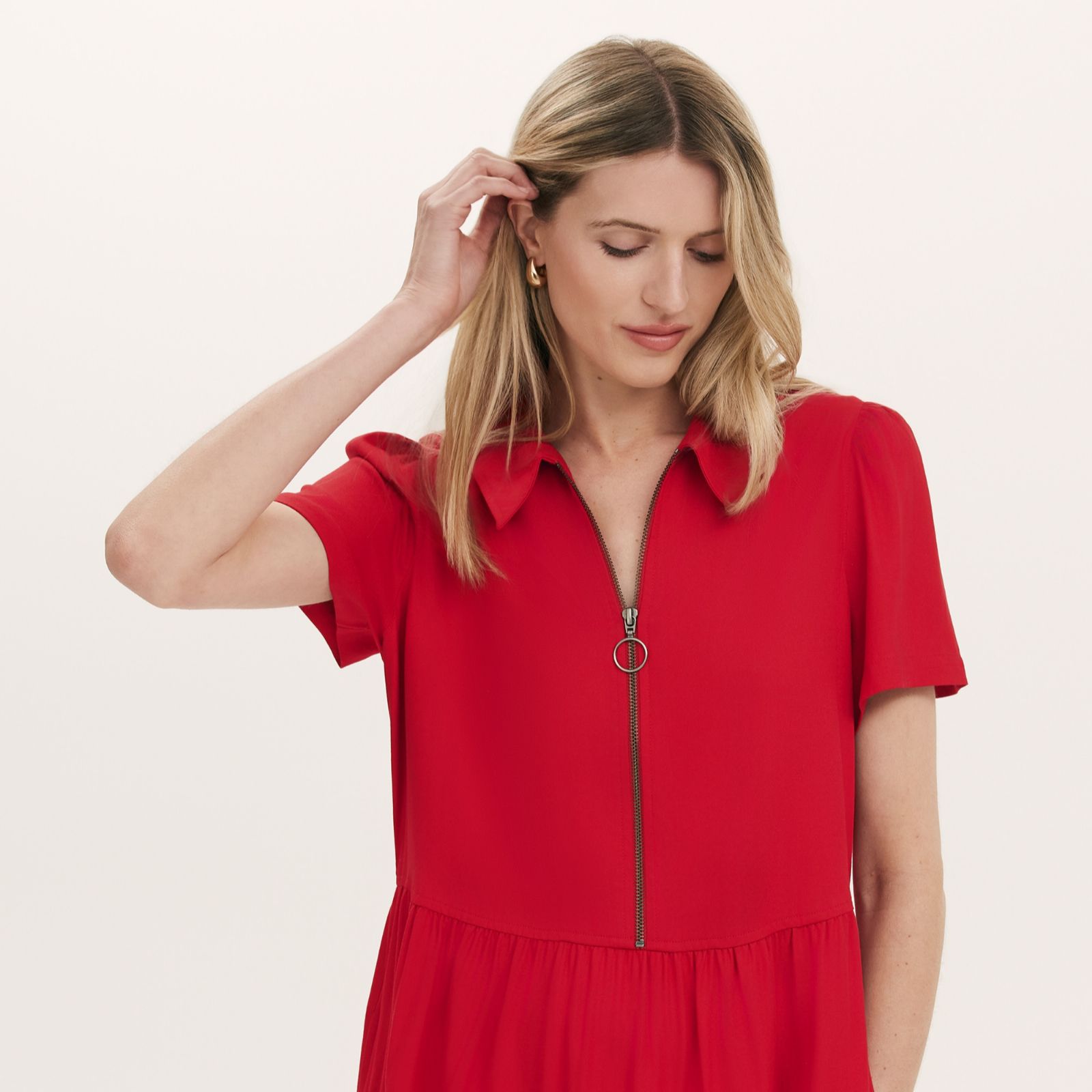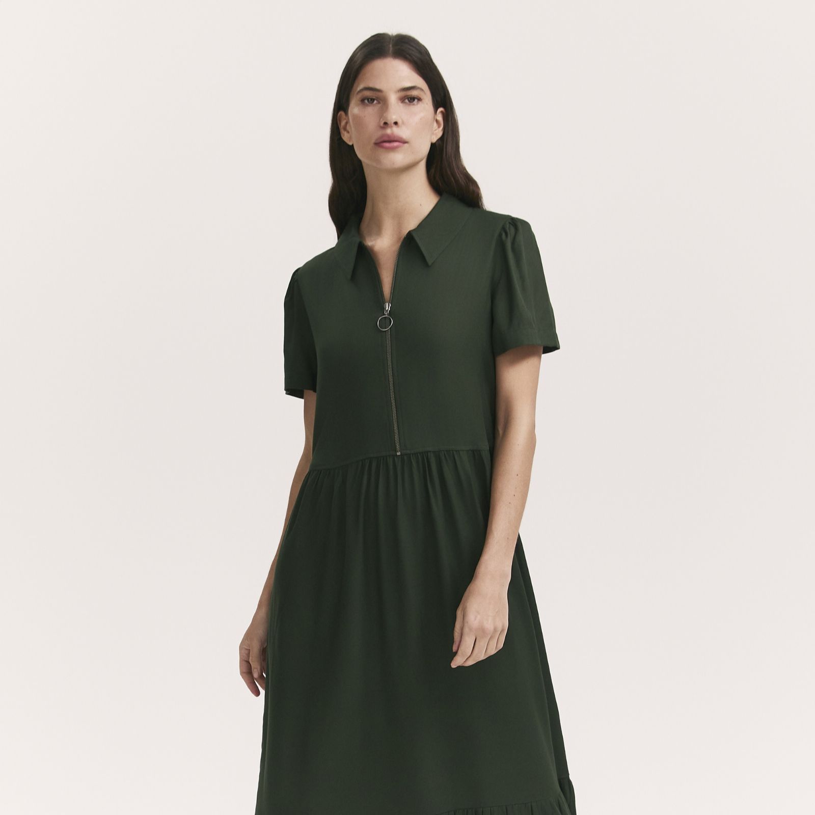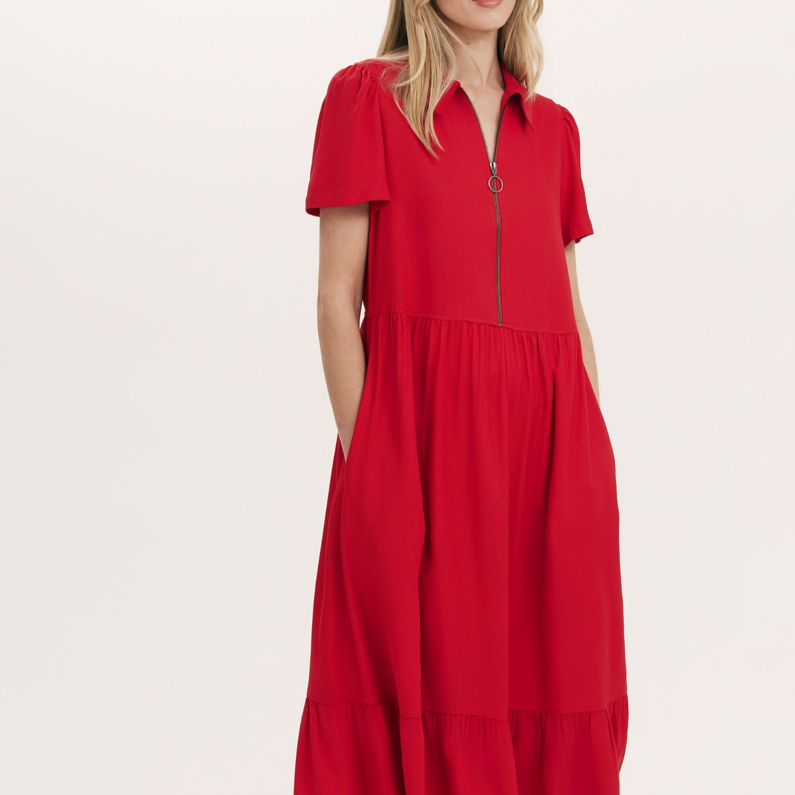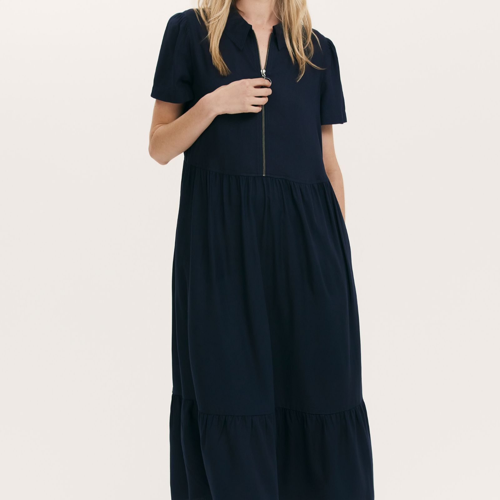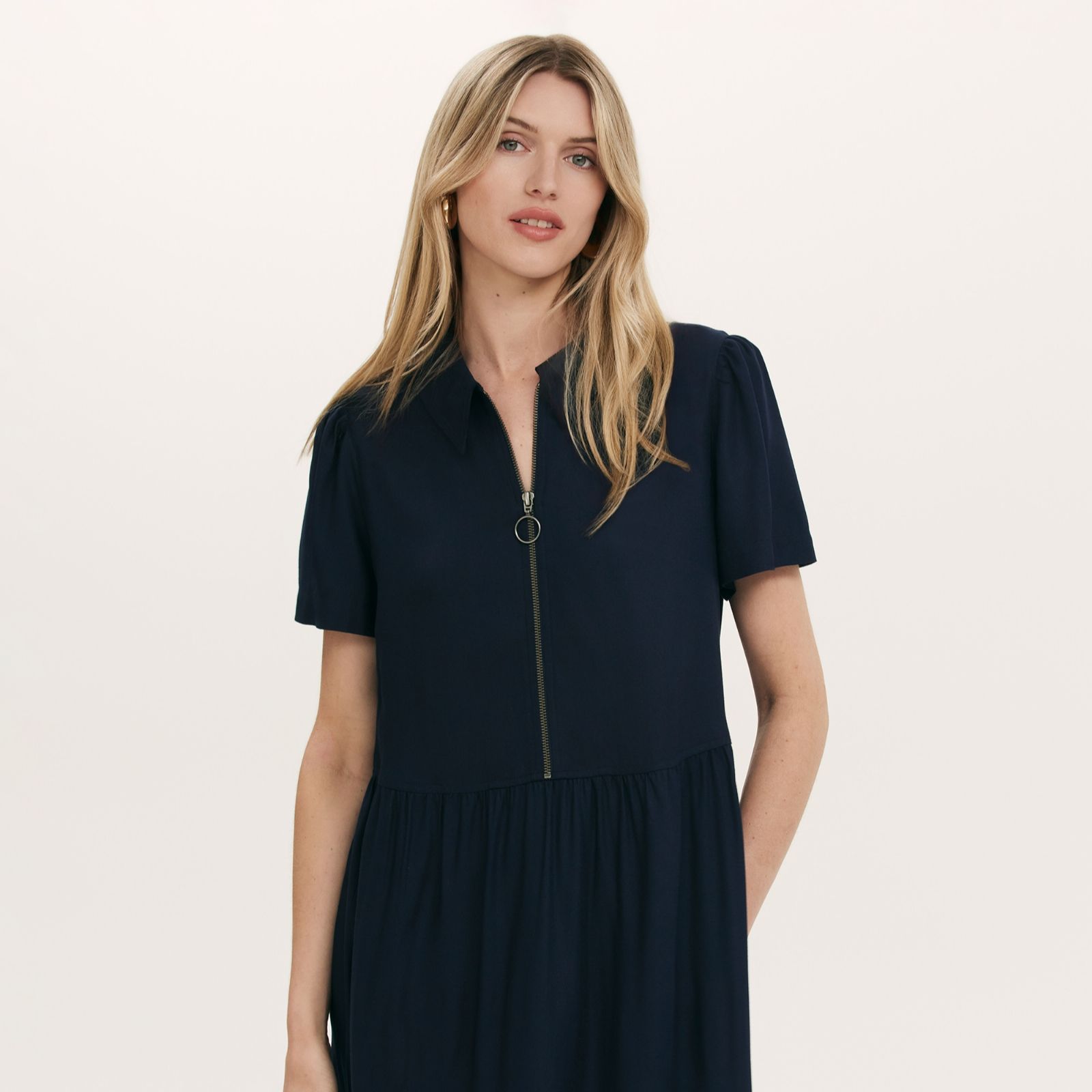 Step out in confidence with the Orion midi dress from Finery London, where a collared neckline, zip front and relaxed fit come together for a look that's as effortless as it is stylish. The tiered hem and practical pockets add a touch of everyday ease, making this dress a versatile choice for workdays, brunches or weekend strolls. Style yours with ankle boots and a cropped jacket for a chic, modern finish.
