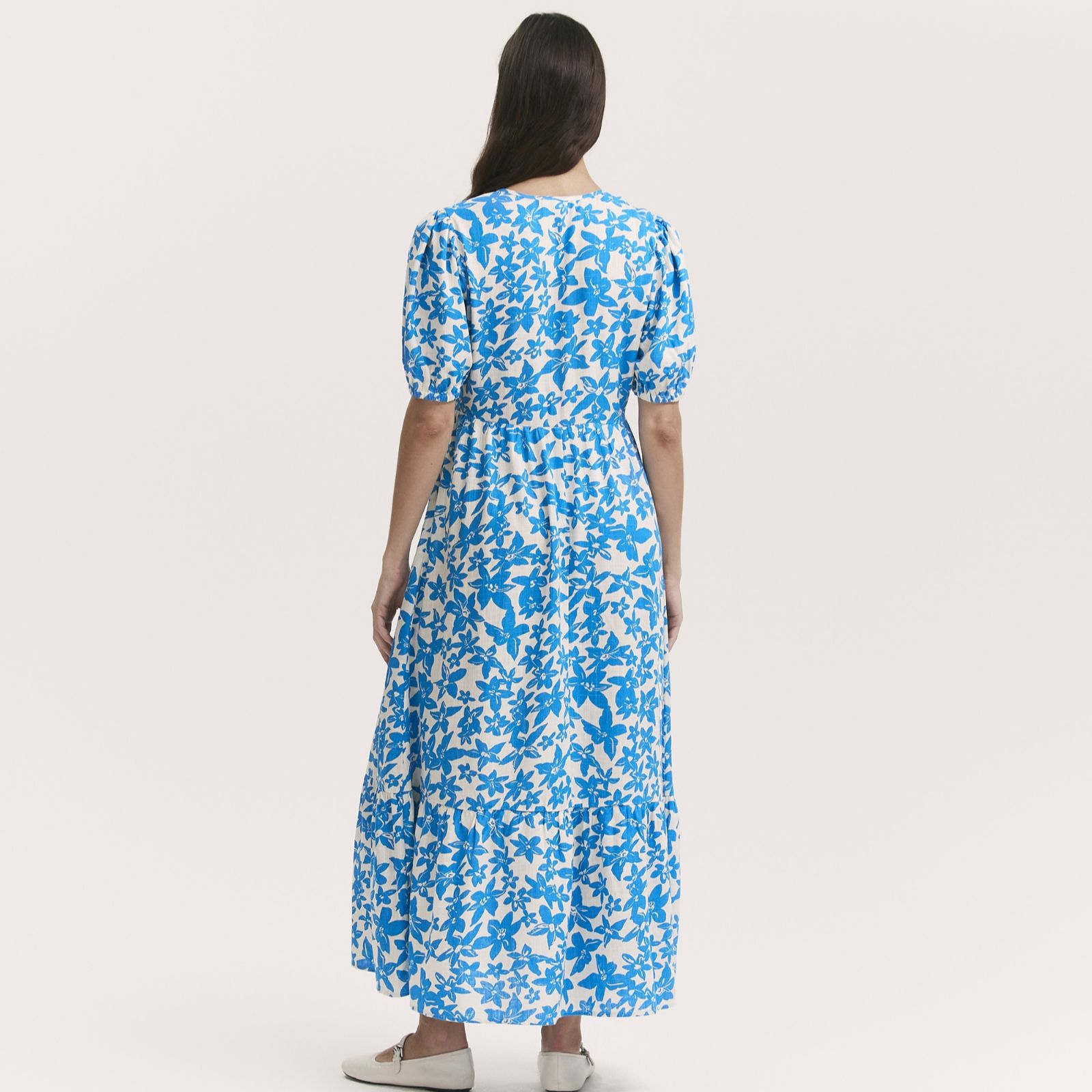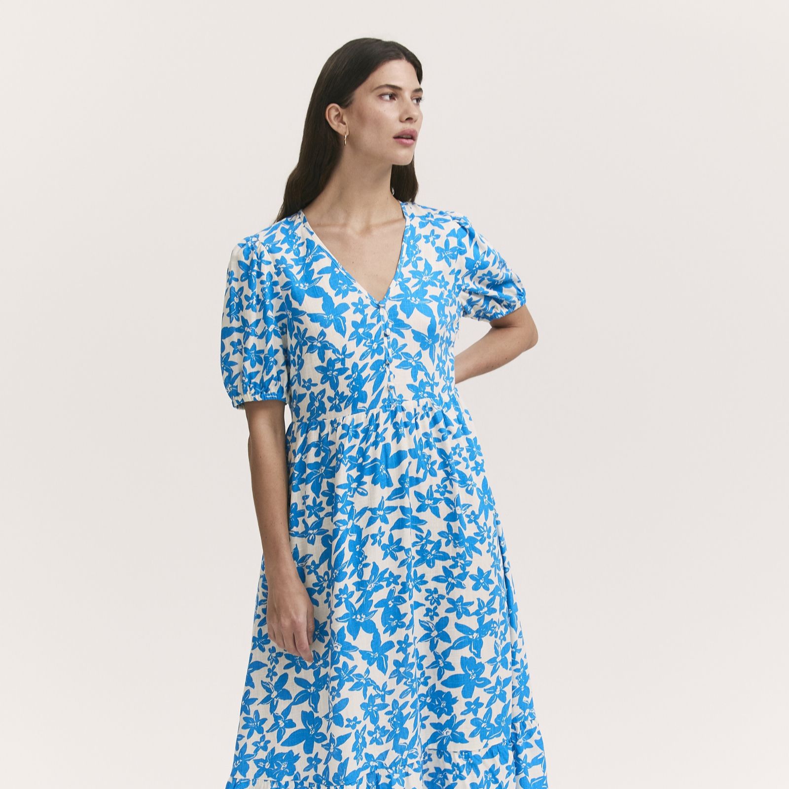 Let the Sabine midi dress from Finery London add buckets of effortless charm to your wardrobe, with its delicate blue flower print, v-neckline and button-up bodice lending a graceful touch to any day. Its relaxed fit, tiered hem and short puff sleeves make this dress an ideal choice for anything from weekend brunches to casual gatherings. Pair with strappy sandals and a woven bag for a laid-back yet polished look.