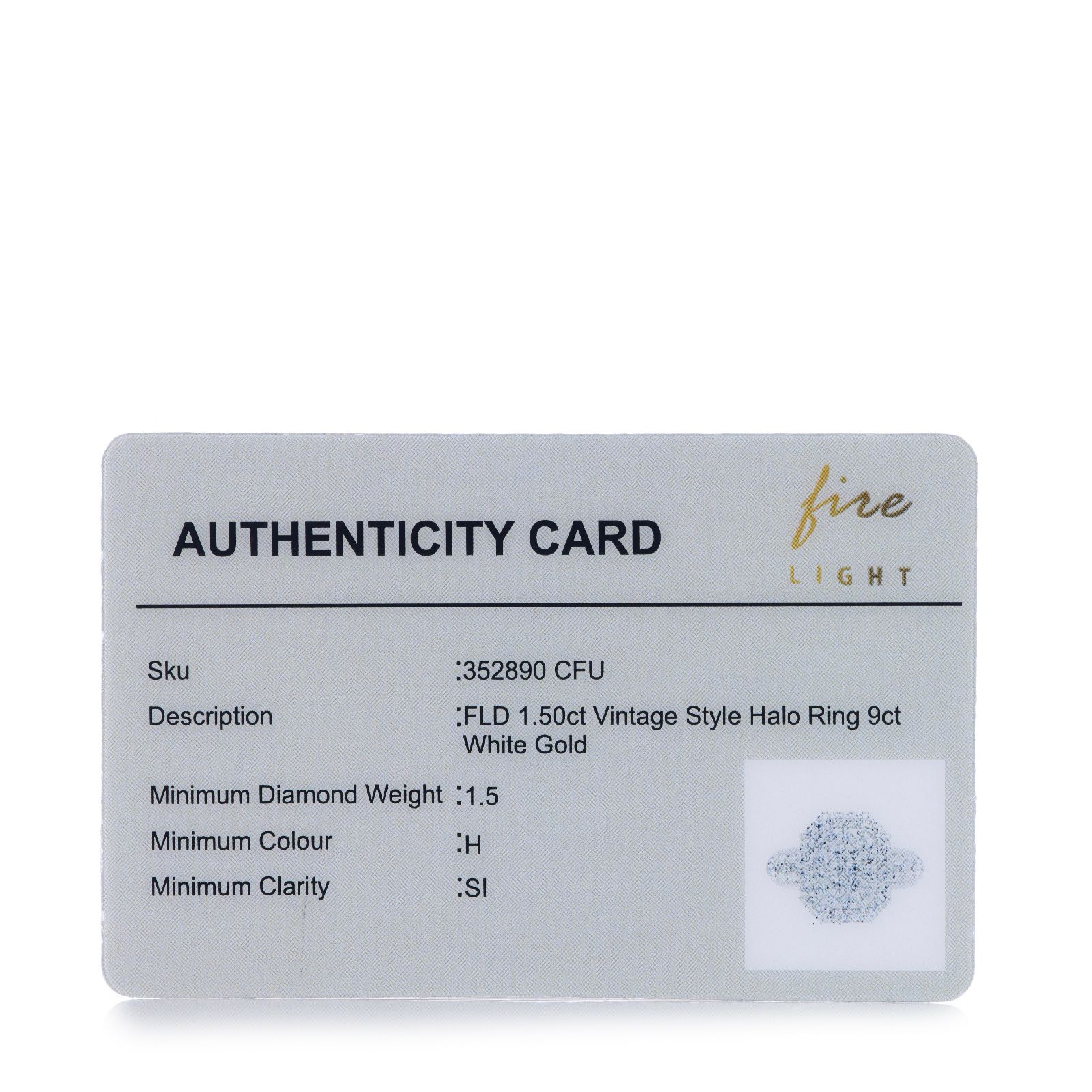 Make a statement with the Fire Light vintage-style halo ring, showcasing stunning lab-grown diamonds set in gleaming white gold. The intricate halo design surrounds the central stone with a cascade of sparkling full-cut diamonds, creating an elegant, timeless look. Perfect for adding sophistication to any outfit, this piece comes with a Fire Light certificate of authenticity, making it a truly special addition to your jewellery collection.