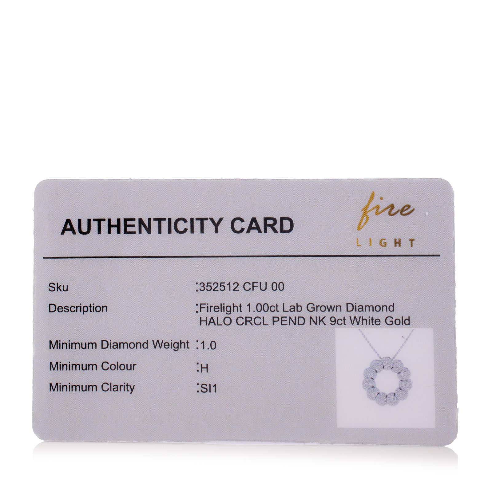 Radiating sophistication, this Firelight halo circle pendant necklace is expertly crafted from 9ct gold and adorned with a brilliant array of lab grown diamonds. The centrepiece sparkles with a captivating 1 carat of diamonds, beautifully encircled by a shimmering halo, making it a timeless piece that will add elegance to any ensemble, from daywear to special occasions.