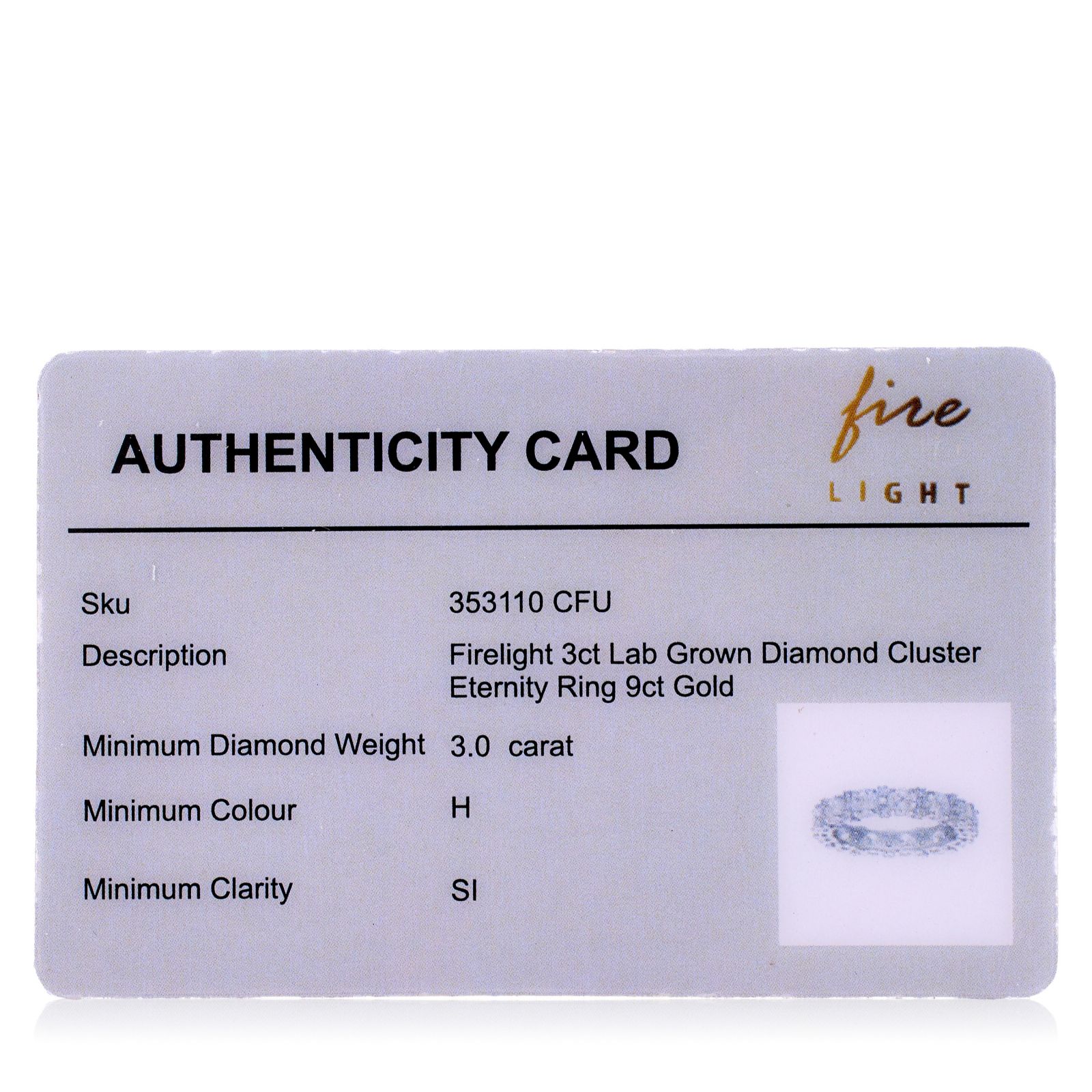 Illuminate every moment with the Firelight 3ct Lab Grown Diamond Cluster Eternity Ring, a dazzling piece crafted in 9ct white gold. This exquisite ring showcases a radiant cluster of full-cut, white lab grown diamonds, offering SI clarity and H colour for exceptional brilliance. Perfect for marking a special occasion or elevating your everyday style, it comes complete with a Firelight certificate of authenticity card.