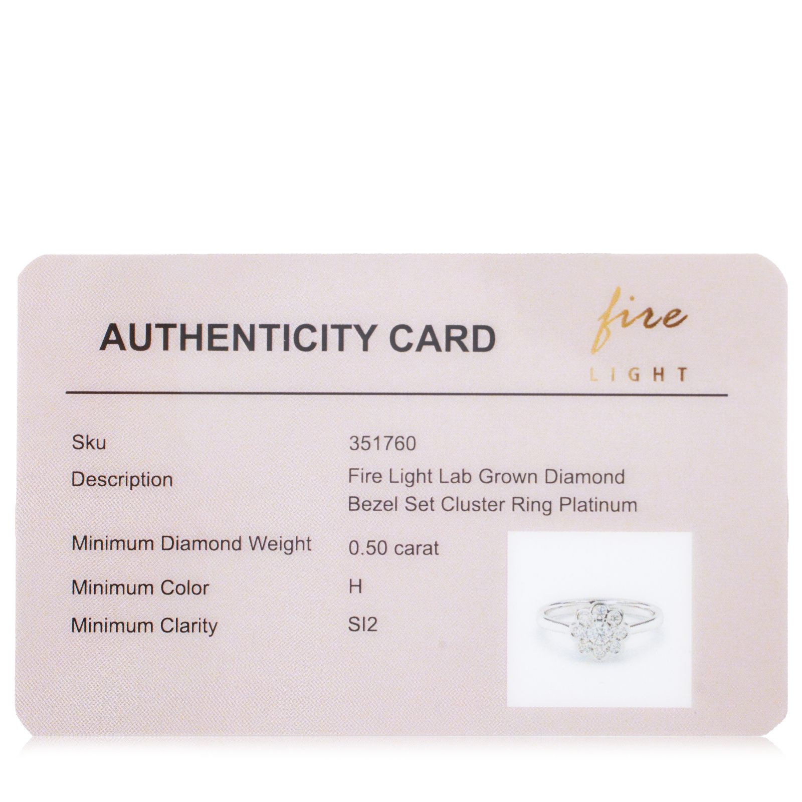 Embrace sparkling sophistication with the Lab Grown Diamond Bezel Set Cluster Ring from Fire Light. This exquisite ring, crafted from luxurious platinum, features a cluster of round brilliant cut white lab-grown diamonds, each with H colour and SI2 clarity, set in a sleek bezel design. The meticulous arrangement of these diamonds ensures maximum sparkle and brilliance, making this ring a perfect choice for special occasions or adding a touch of luxury to everyday wear.