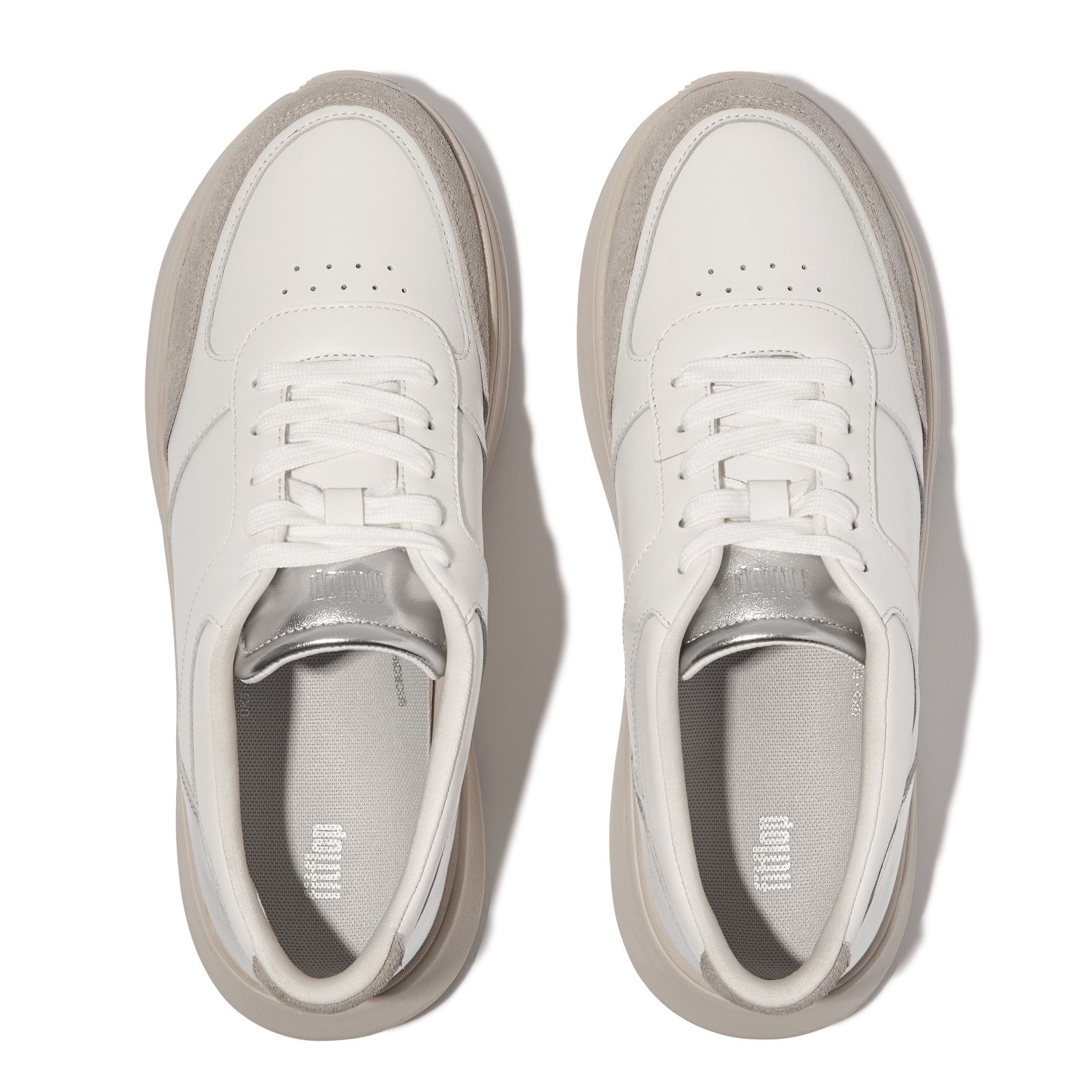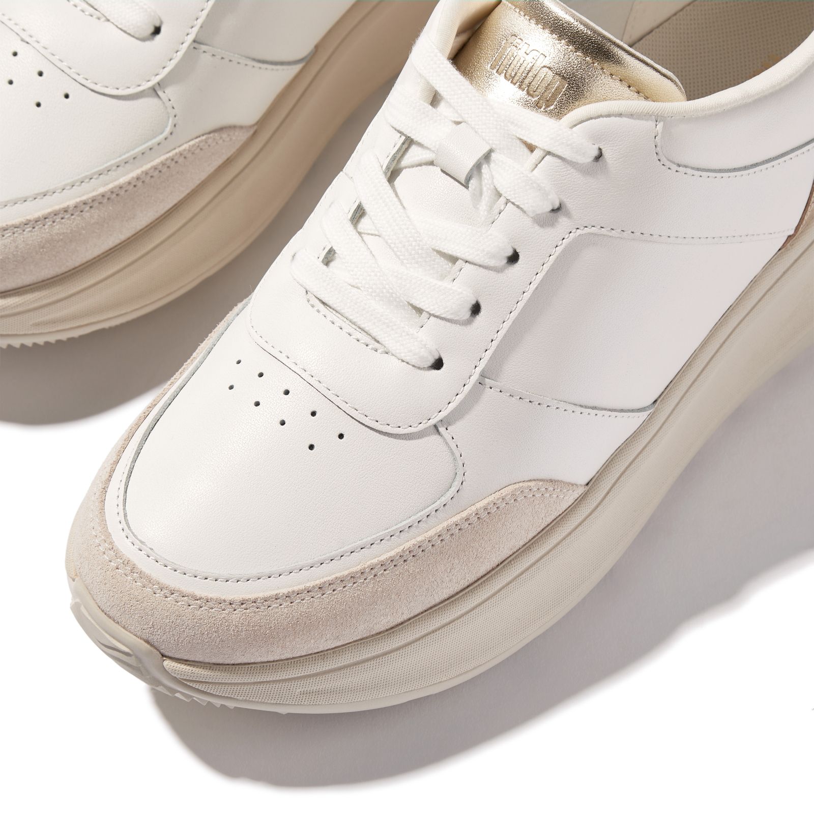 Experience the perfect blend of sporty style and modern elegance with the Fitflop F-mode Flatform trainers. These versatile trainers combine crisp white leather with suede accents and glossy metallic details at the heel and tongue, ensuring you stand out. The breathability holes at the front and padding throughout provide comfort, while the ultra-cushioning Microwobbleboard midsole offers extra height. Perfect for both casual outings and stylish ensembles, pair them with jeans or a chic dress for a dynamic look.