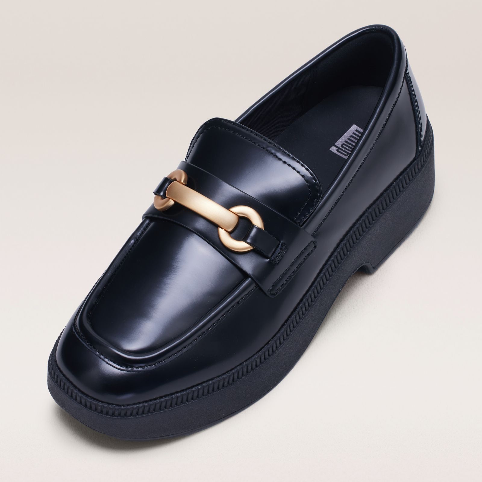 Step into modern elegance with these Fitflop Snaffle Wedge Loafers, featuring a premium box leather upper with a sleek, glossy finish. The stylish loafer design is enhanced by a brushed-metal snaffle, slightly square toe, and moccasin seaming, all set on a comfortable light wedge sole. These loafers offer a perfect blend of sophistication and comfort, making them an ideal choice for both work and casual outings.
