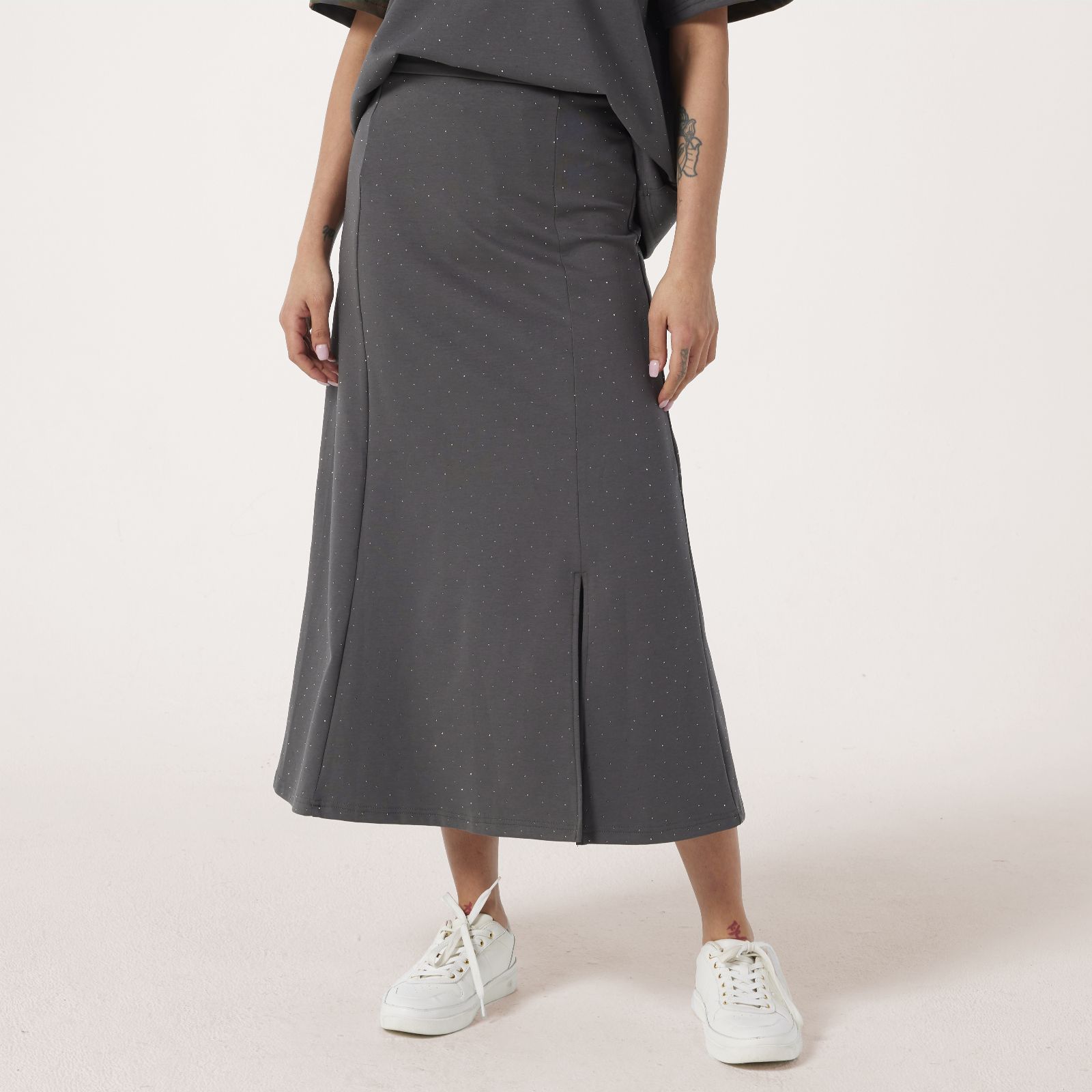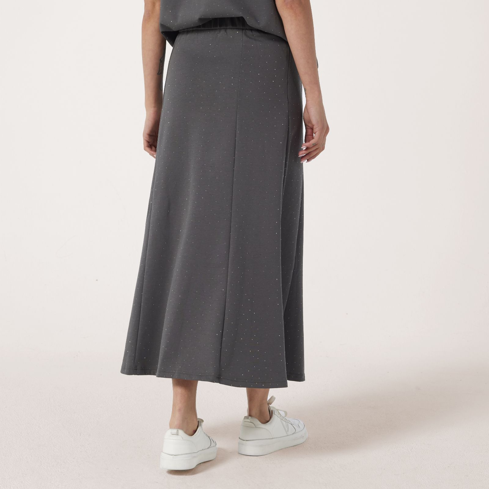 Discover your new favourite piece with the Frank Usher A-line jersey skirt with studs. This elegant skirt showcases scattered small stud embellishments on both the front and back, infusing an edge into its timeless A-line shape. The elasticated waistband at the back ensures a snug fit, complemented by a side zip and an off-centre slit at the hemline. Ideal for both casual and more refined events, this versatile skirt pairs wonderfully with a tailored blouse or a simple T-shirt for an effortlessly chic look.