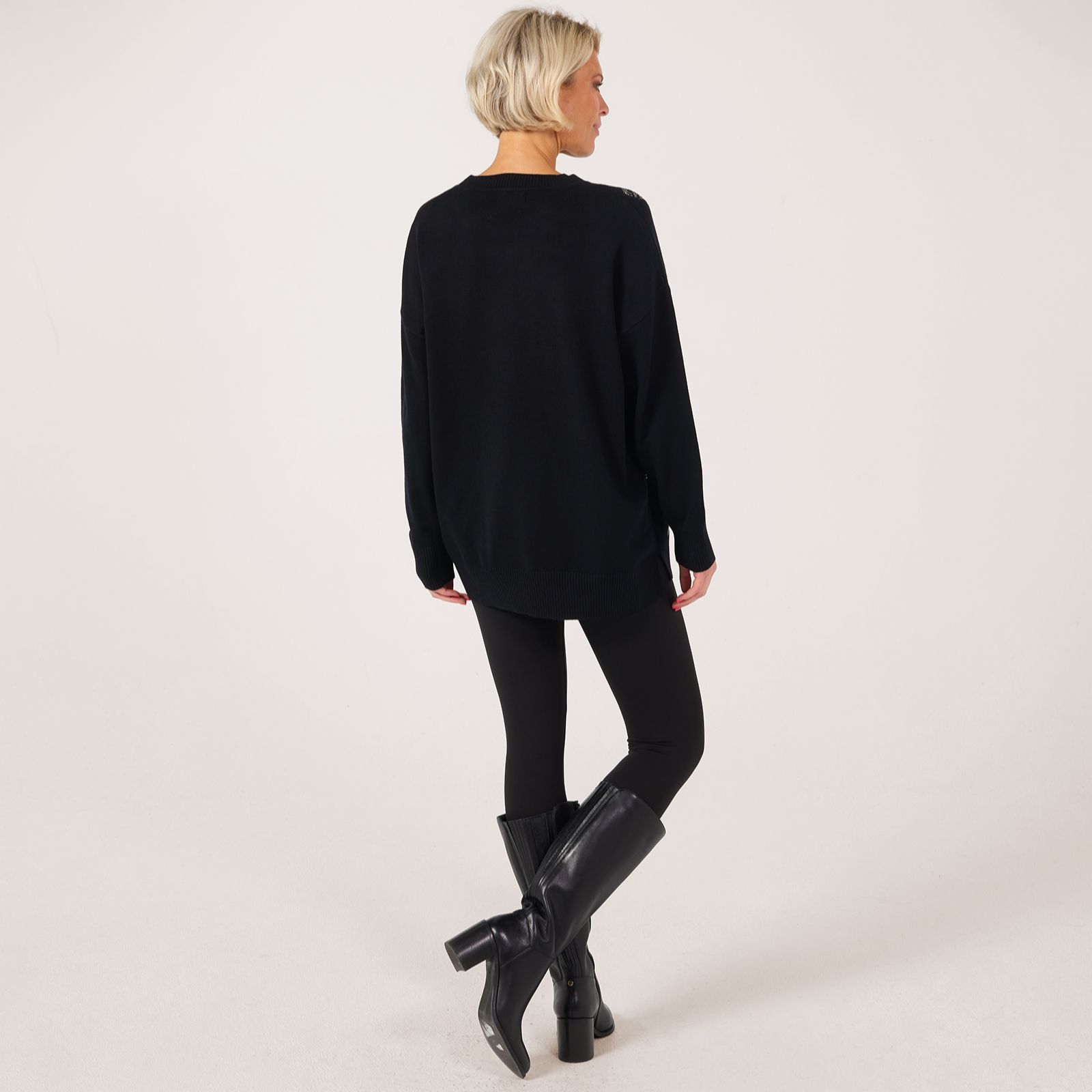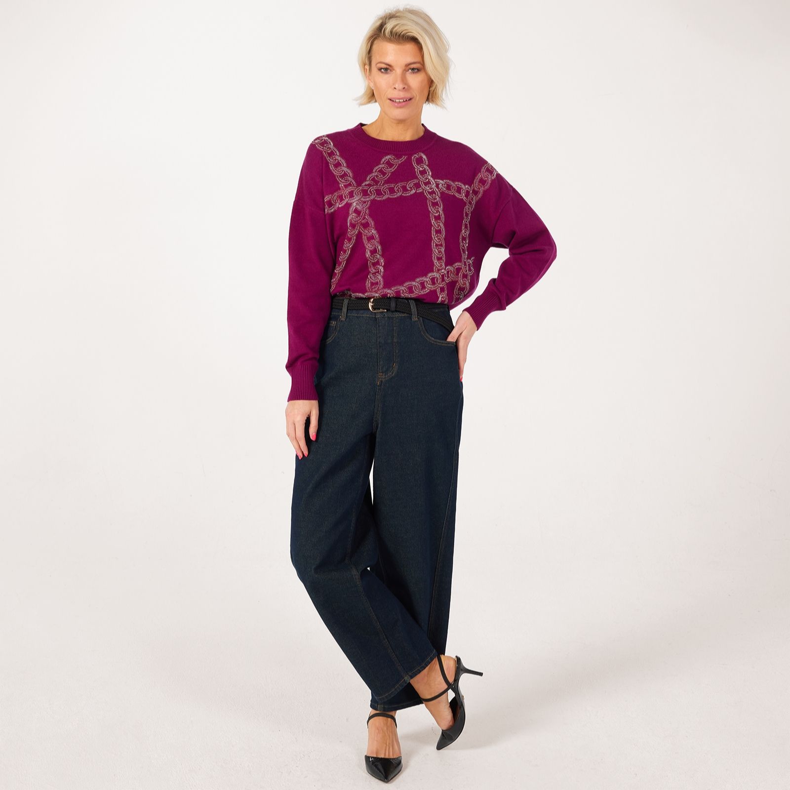 Bring a touch of glamour to your everyday style with this chain stud embellishment knit jumper from Frank Usher. With its relaxed fit, dropped shoulders and striking two-tone studded chain motif, this jumper is perfect for adding a chic twist to casual outings or evening get-togethers. Pair it with tailored trousers or your favourite jeans for a look that's both effortless and eye-catching.