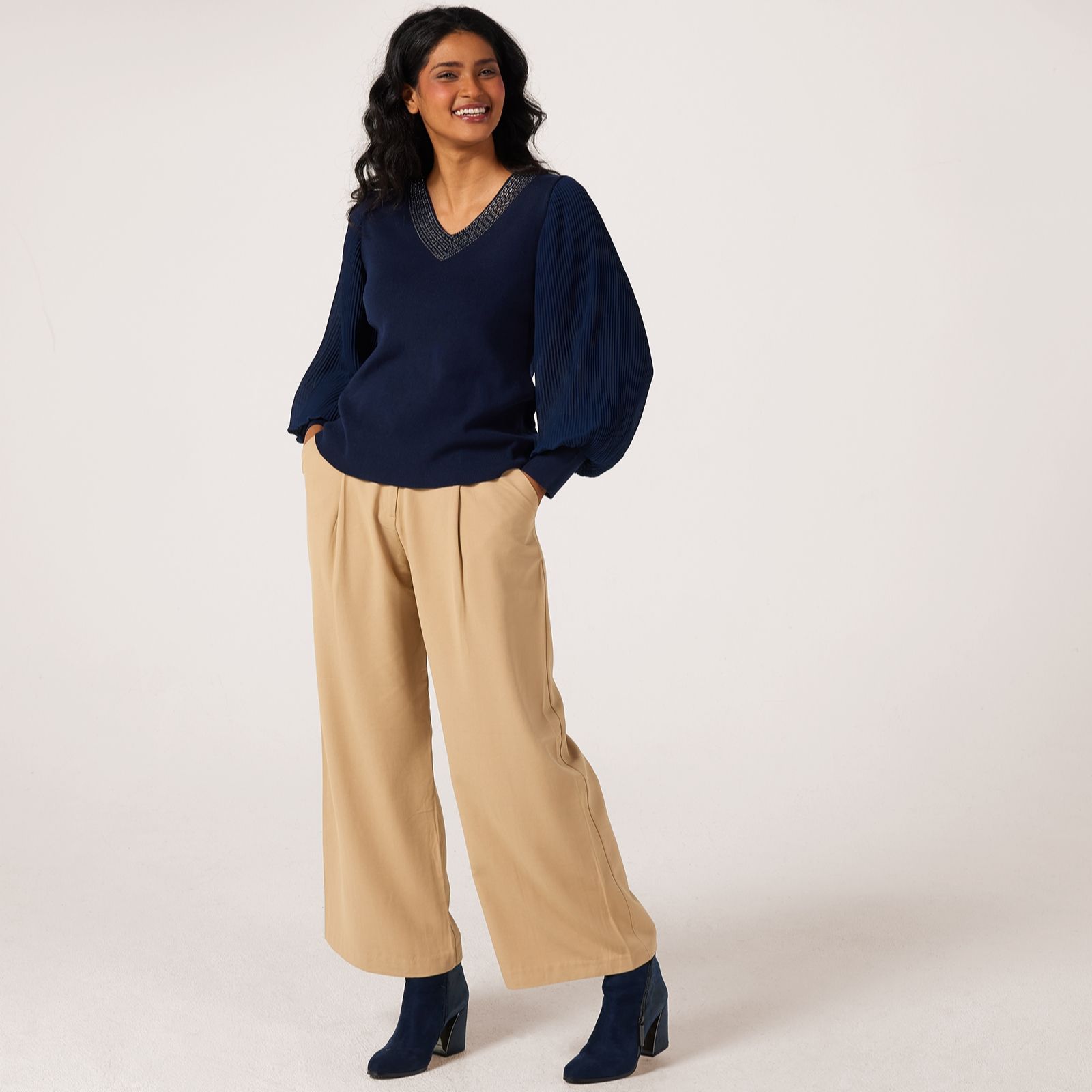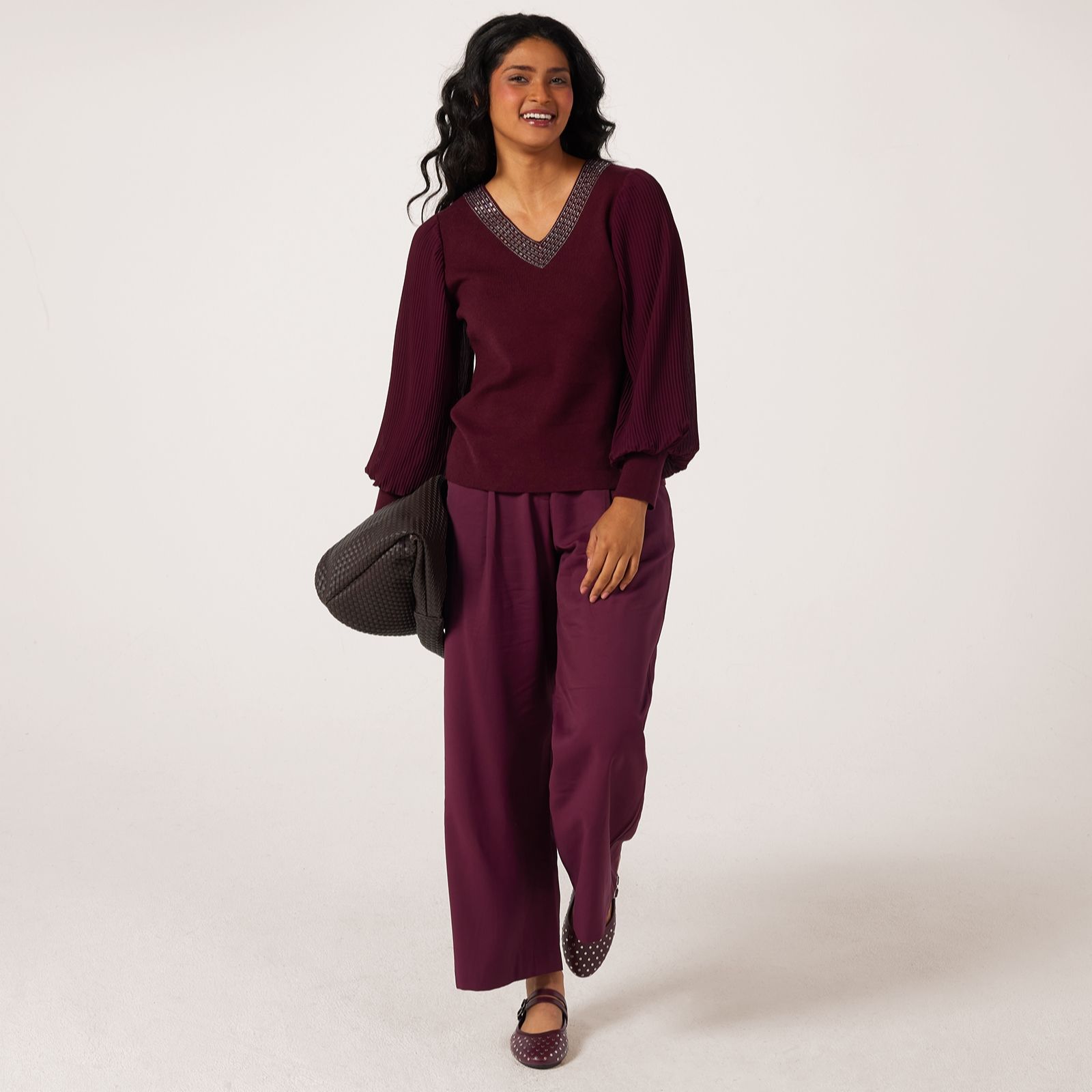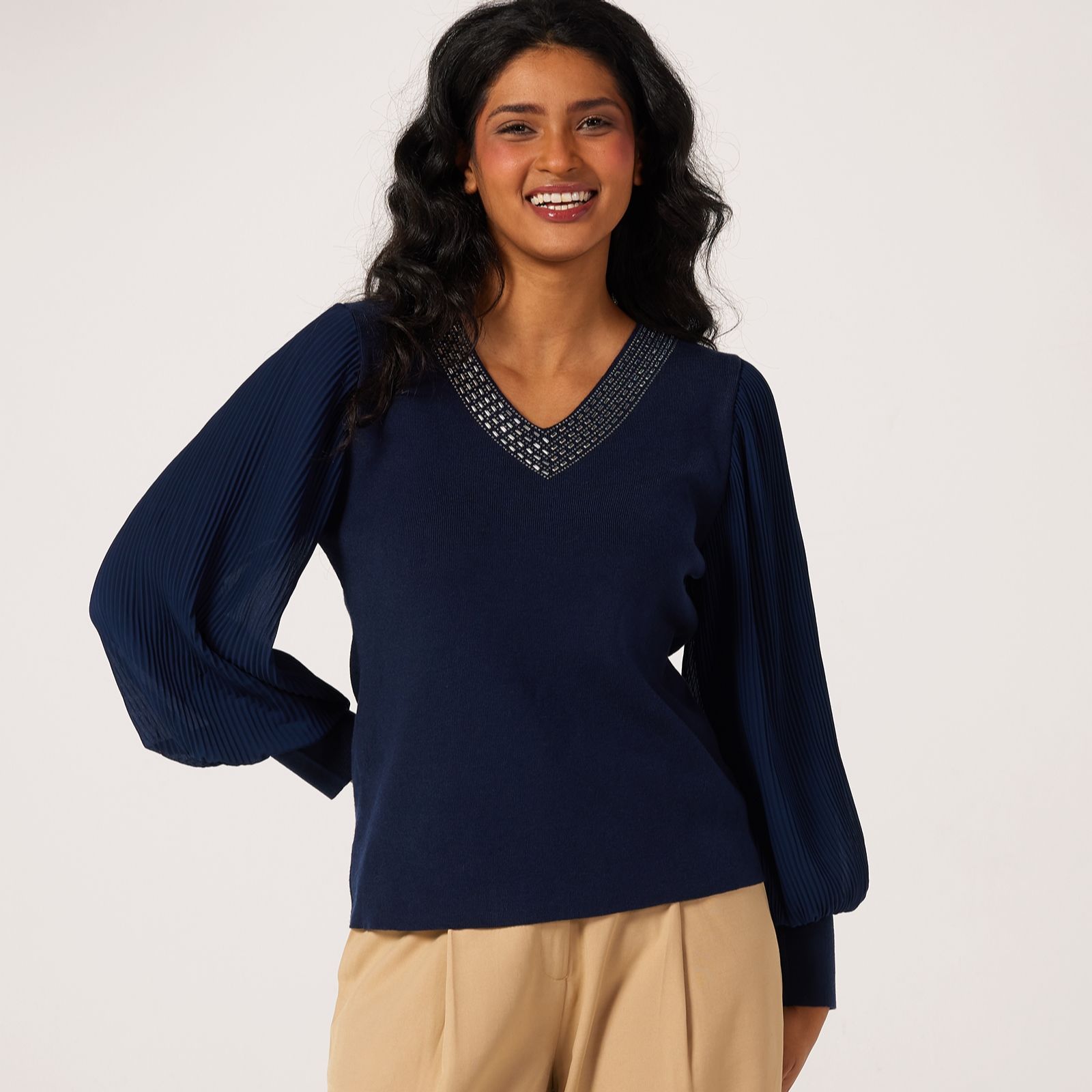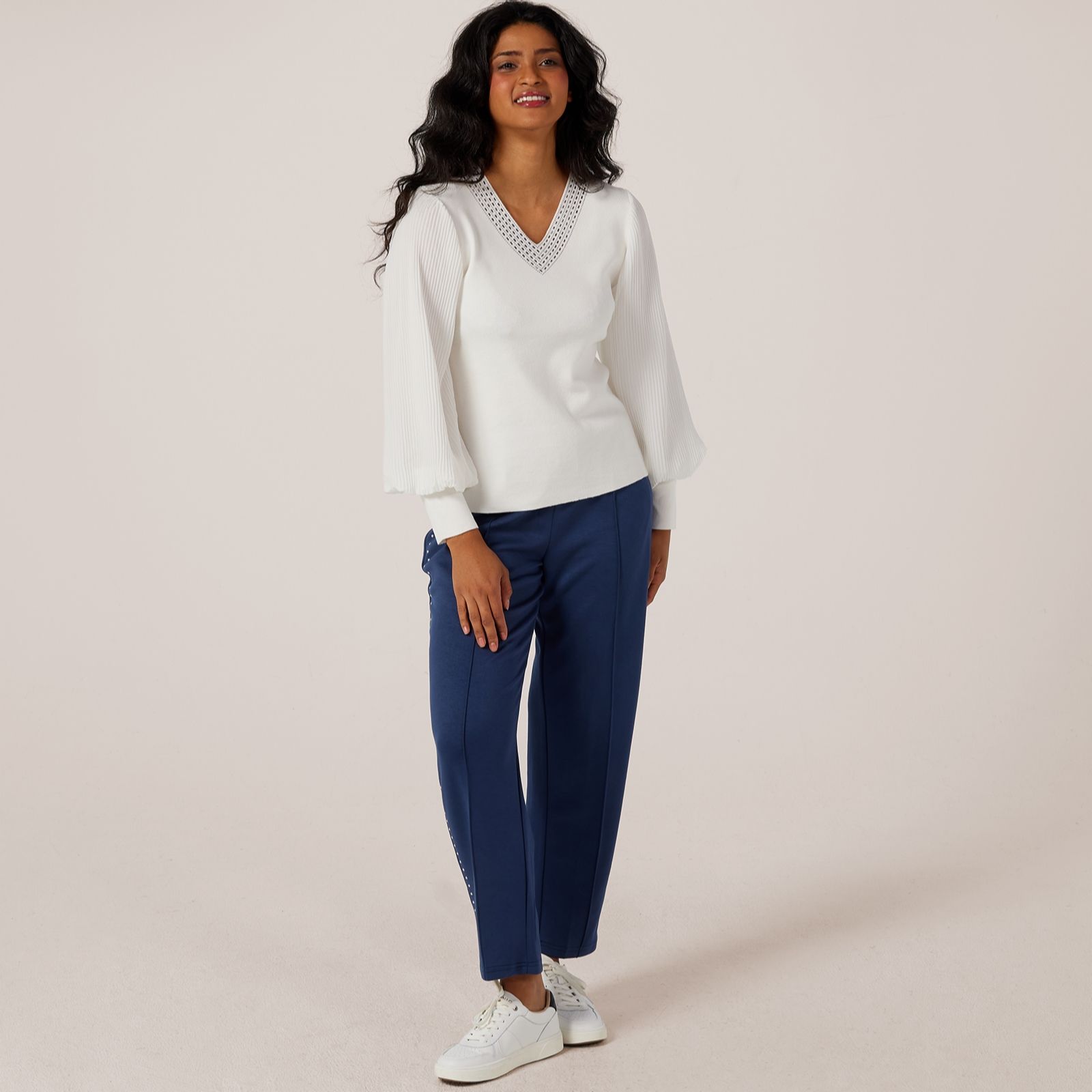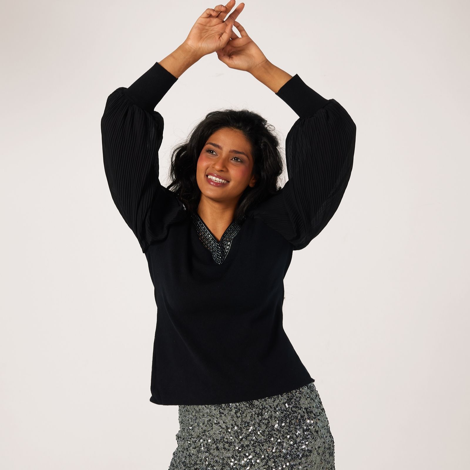 Add a touch of glamour to your everyday style with this embellished knit jumper from Frank Usher, blending a soft knit body with dramatic chiffon sleeves and rows of sparkling studded detail along the neckline. Whether you're heading to brunch, a casual dinner or dressing up for an evening out, this semi-relaxed piece offers both comfort and standout appeal. Try pairing it with sleek trousers or a pencil skirt for a chic, modern look.