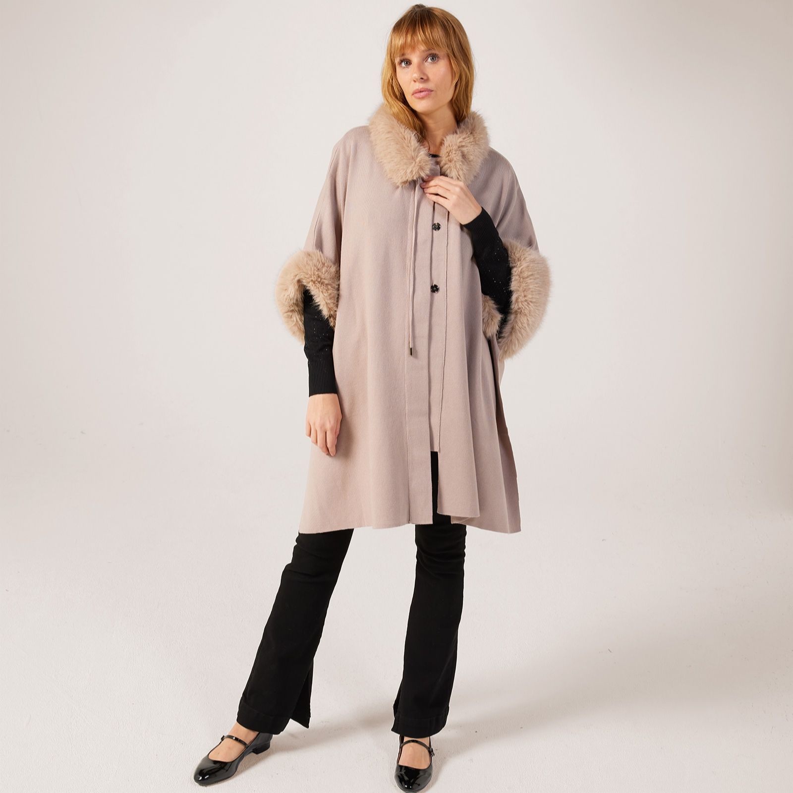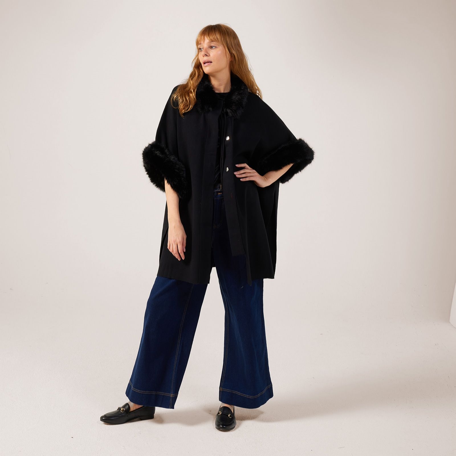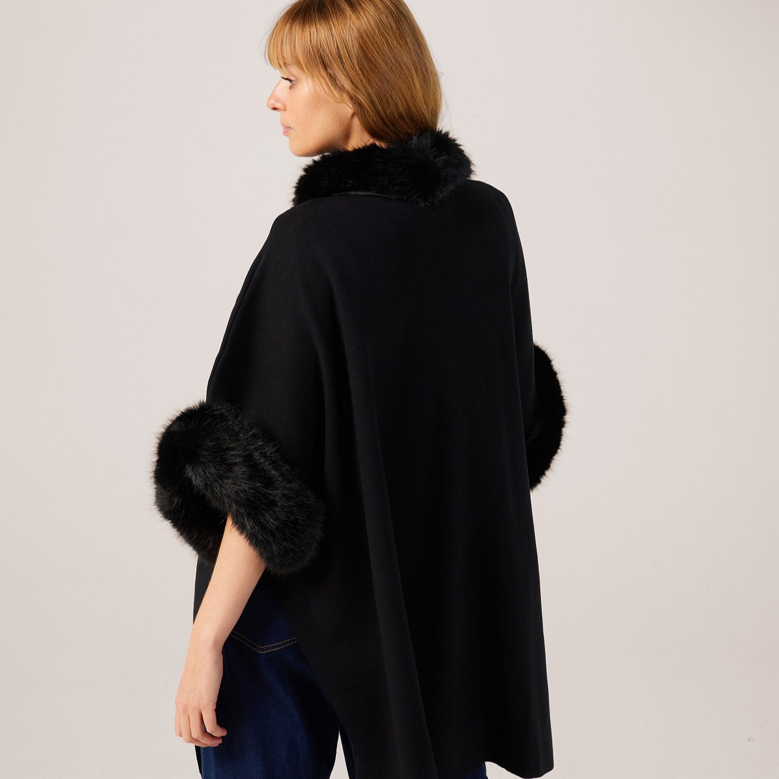 Finish your look with the luxurious drape of the Frank Usher Faux Fur Trim Knitted Edge-To-Edge Wrap. This stunning wrap features a detachable faux fur trim at the neck and armholes, adding a touch of elegance to your ensemble. The edge-to-edge style with placket covered press studs and half sleeve overarm design offers a chic and relaxed fit. Perfect for layering over any outfit, its versatile box shape and large side slits make it a must-have for any fashion-forward individual.