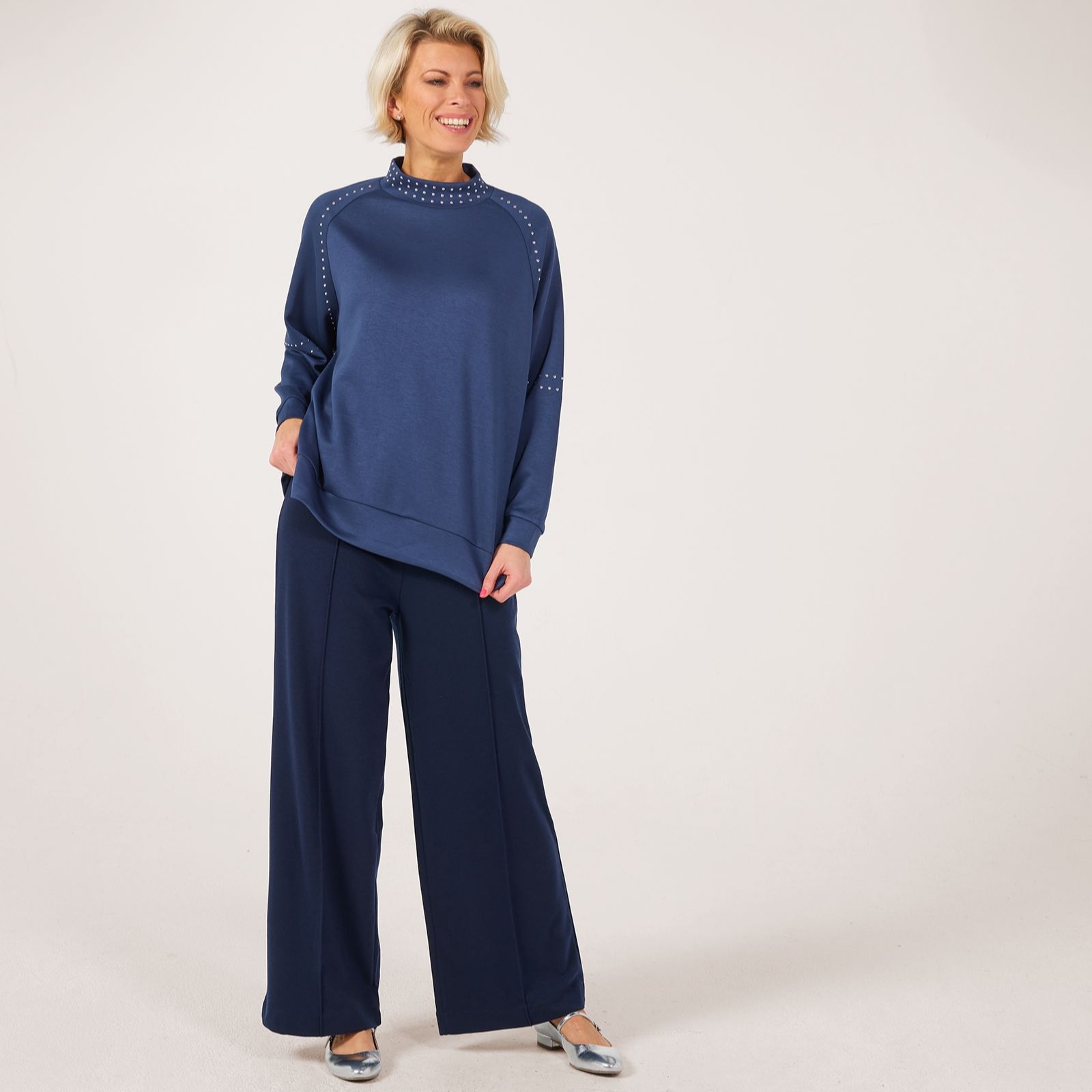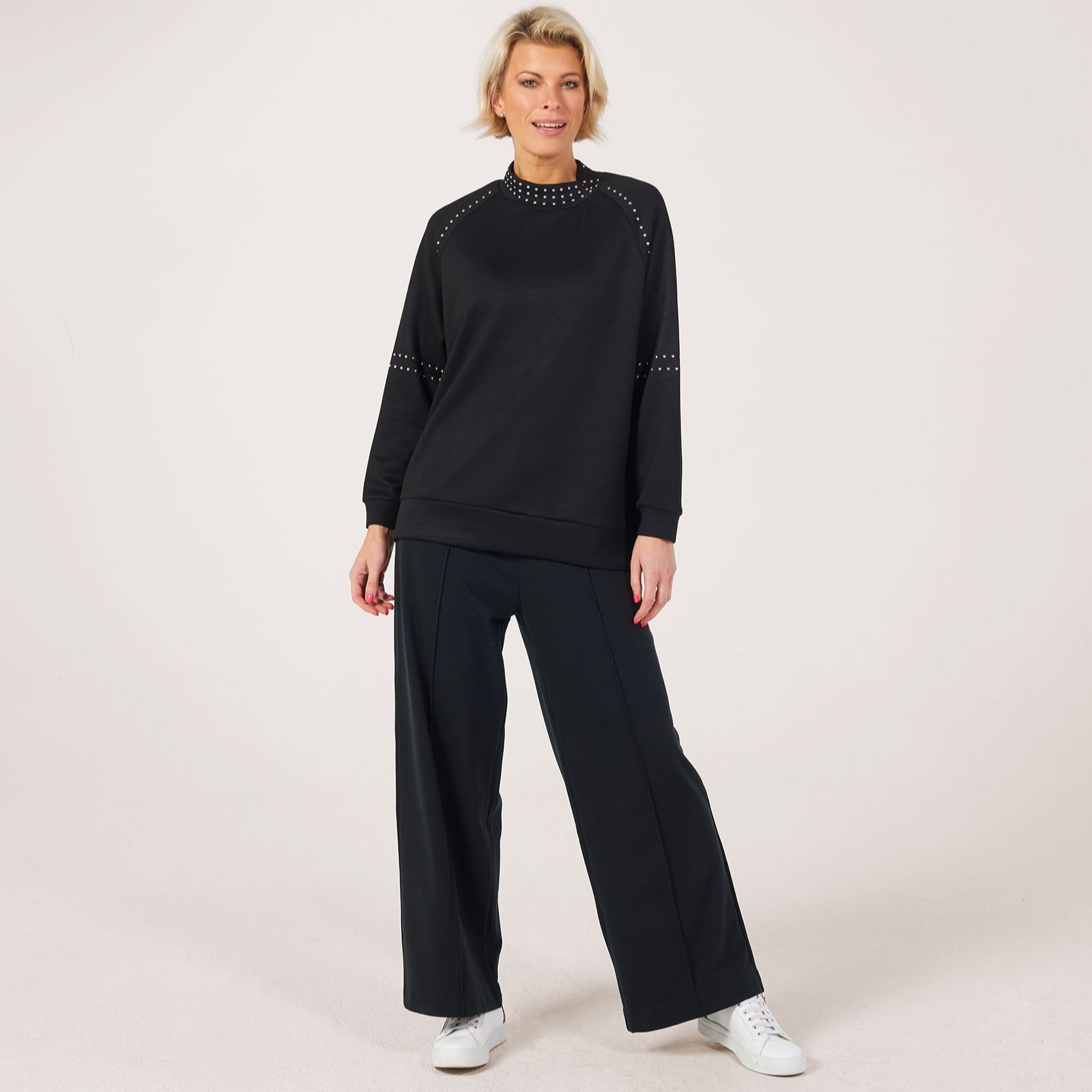 Add a touch of sparkle to your everyday with this Frank Usher high neck super soft jersey jumper, adorned with rows of rounded silver studs along the neckline, sleeves and raglan seams for a modern twist. The loose fit and long raglan sleeves make it perfect for cosy days out or relaxed evenings in, while its chic detailing ensures you stand out in style. Pair it with matching joggers or slim-fit jeans for a polished, contemporary look.