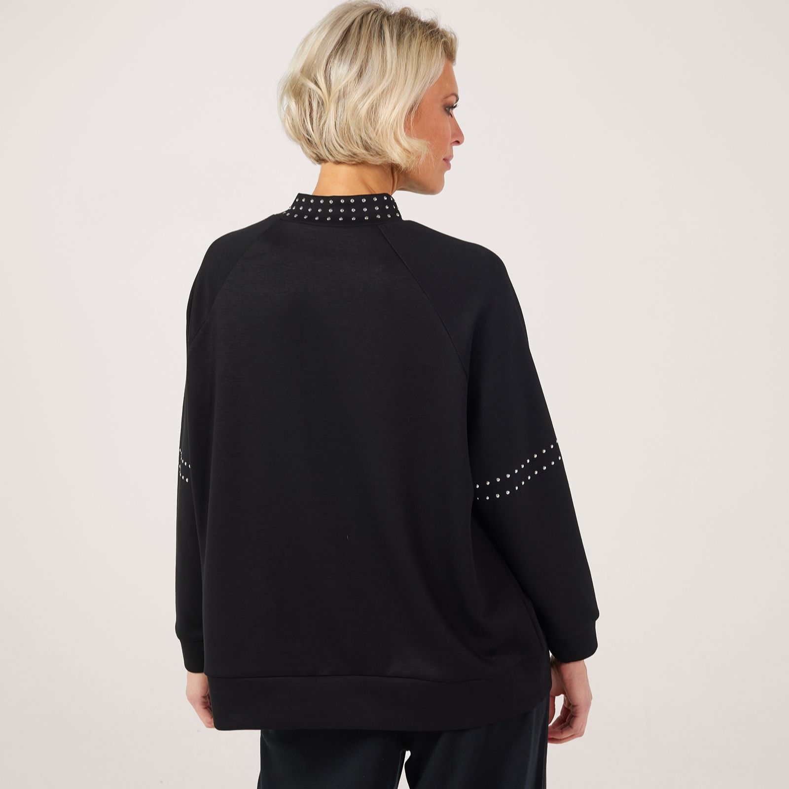 - Rows of rounded silver studs to neck, sleeves and raglan seam