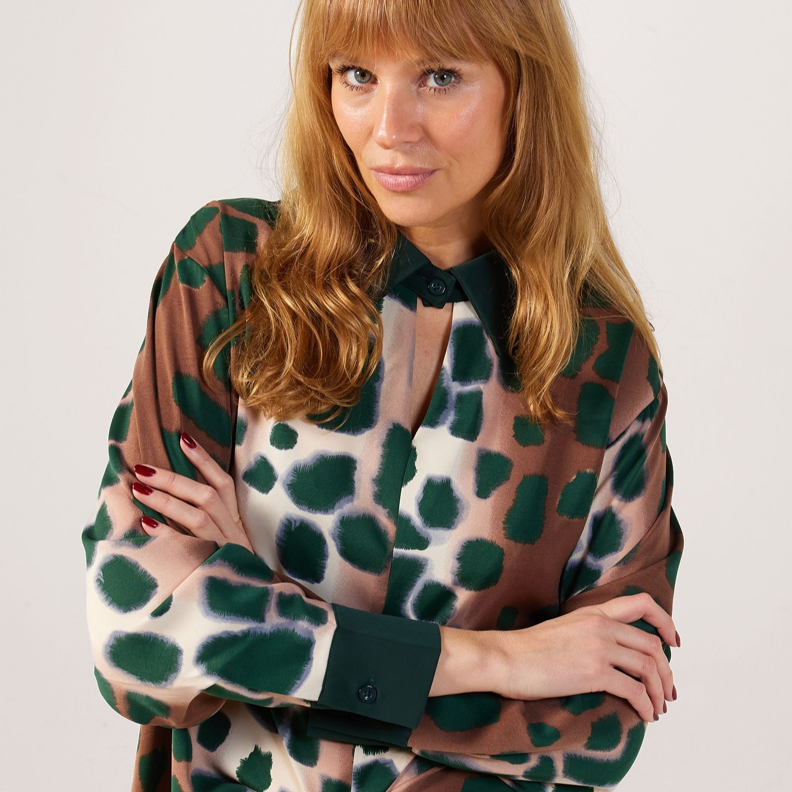 Elevate your wardrobe with the Frank Usher long animal print shirt, featuring a striking contrast collar and cuffs. This unlined piece boasts a buttoned collar neck with a V-notch, long sleeves with buttoned cuffs, and a dipped back for added flair. The pleated back and side slits ensure a relaxed fit, while the large front centre hemline slit and rounded hemline add a touch of sophistication. Perfect for both casual outings and more polished occasions, this shirt pairs beautifully with tailored trousers or your favourite jeans.