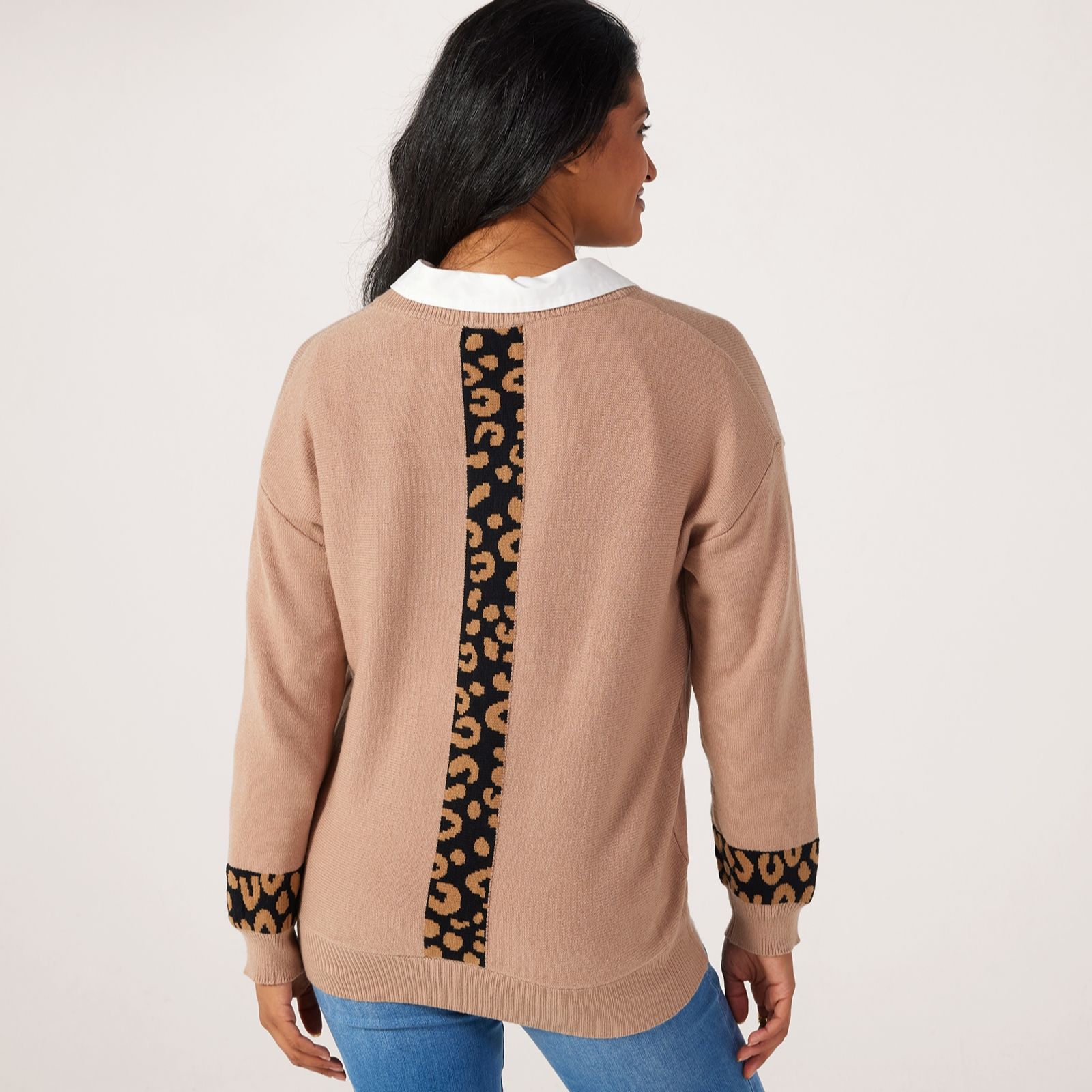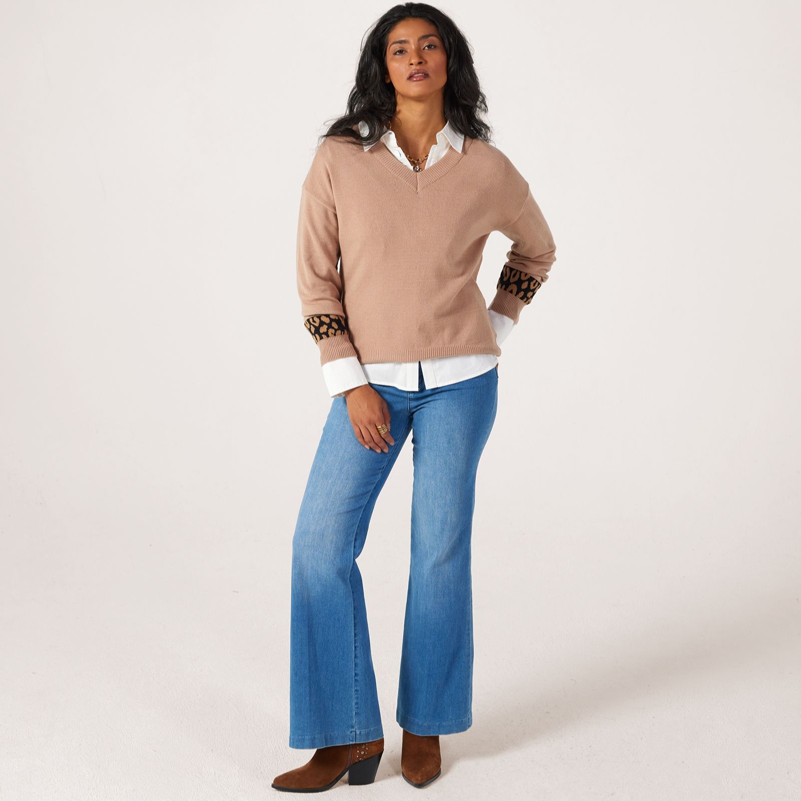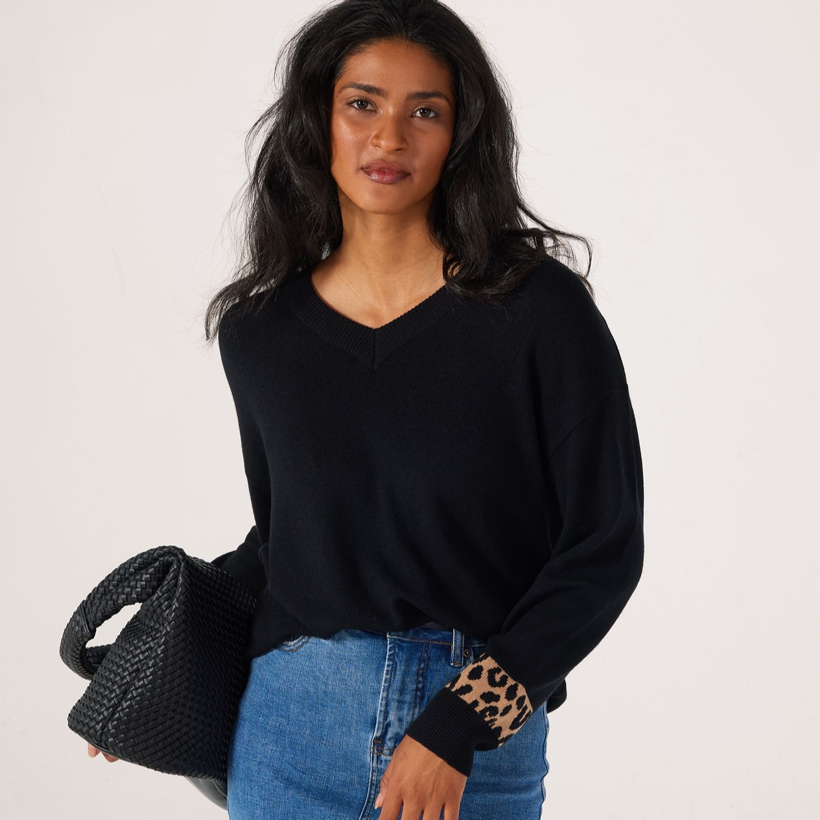 Step out in style with this V-neck knitted jumper from Frank Usher, crafted with bold leopard print stripes that add instant glamour to your everyday style. This standout jumper features dropped shoulders and a loose fit, offering relaxed comfort for brunch dates, weekend strolls or cosy evenings at home. Pair it with sleek leggings or your favourite jeans to let the striking leopard pattern make a statement.