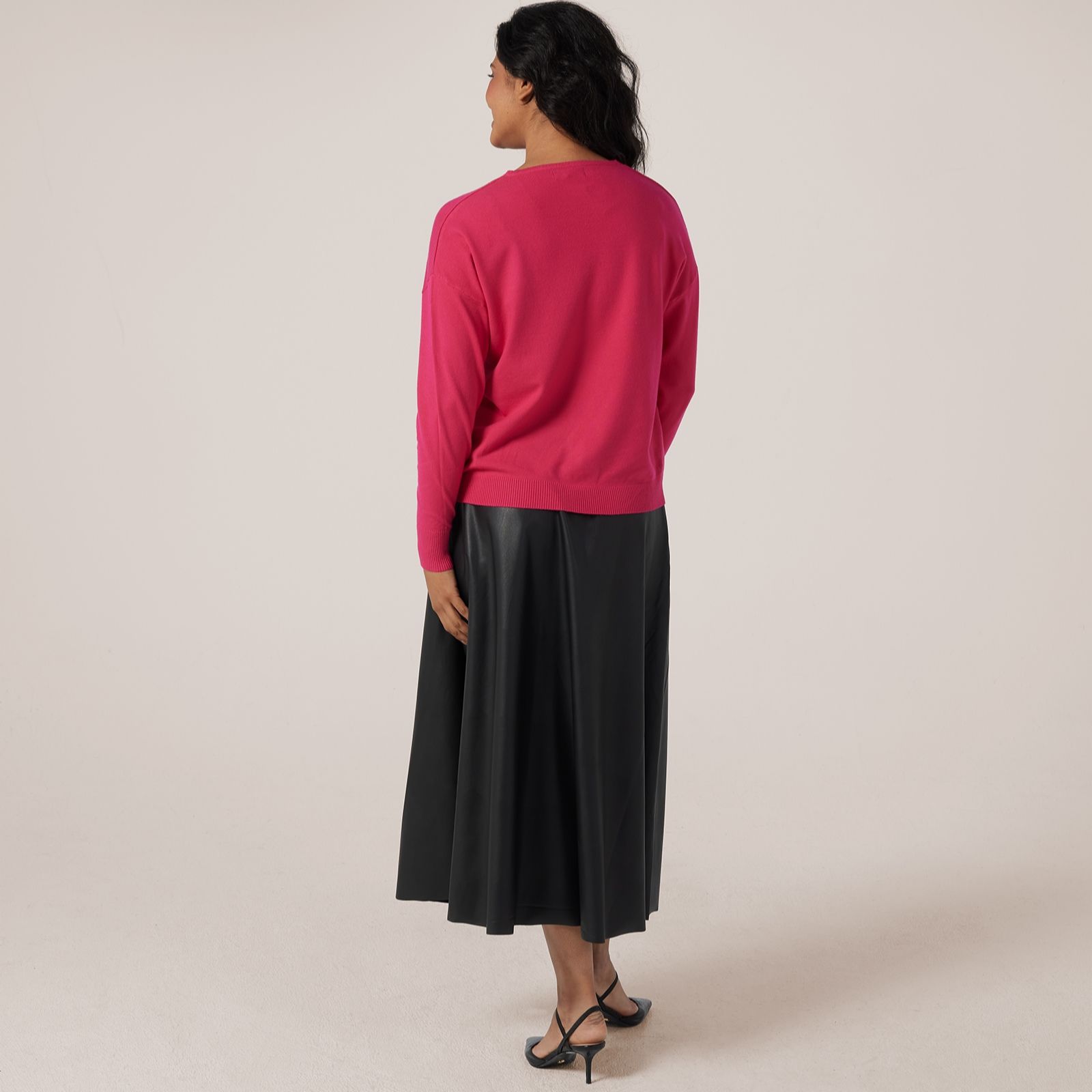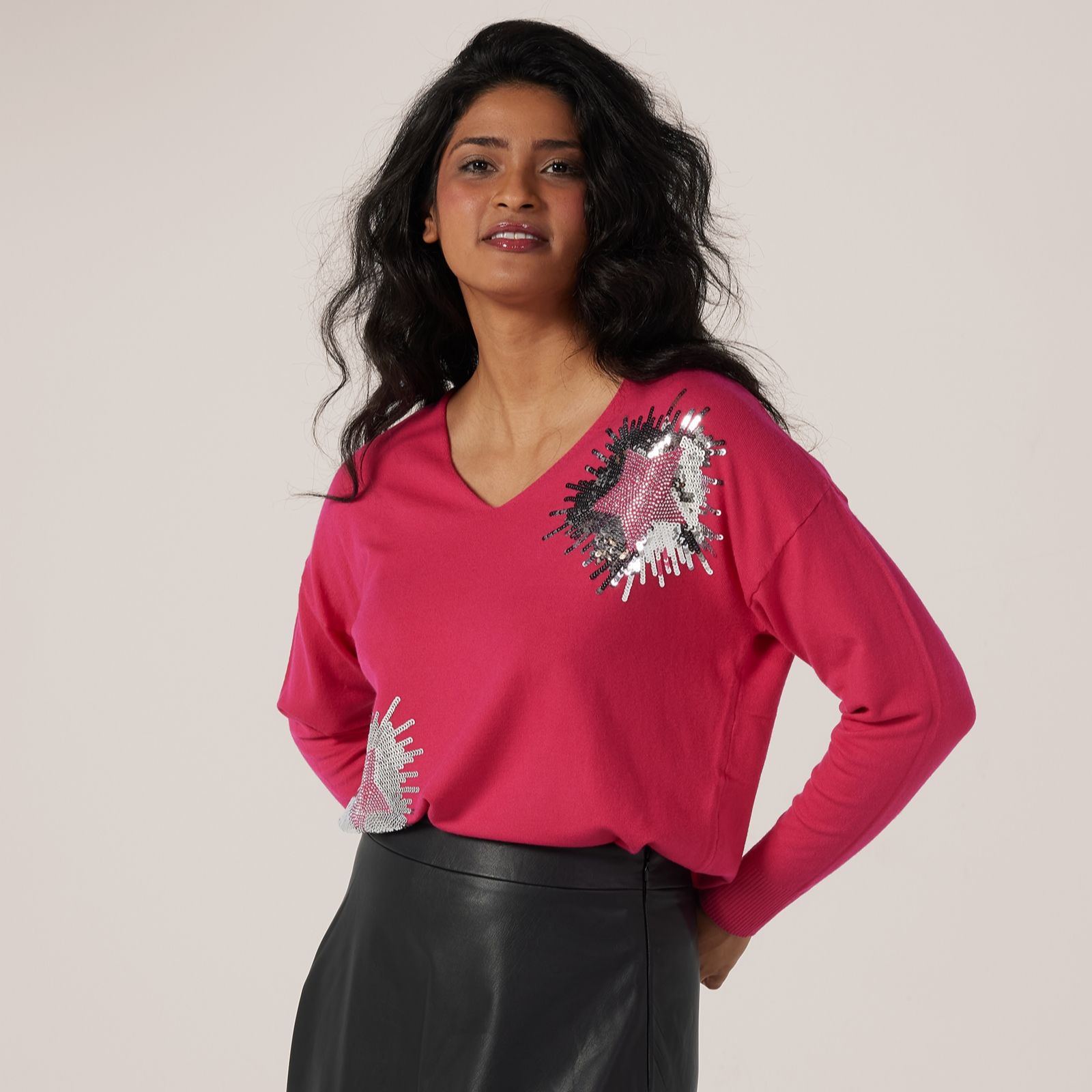 Add a touch of sparkle to your wardrobe with this V-neck knitted jumper from Frank Usher, featuring dazzling studded star motifs with a starburst sequin effect on the shoulder and waist. Its loose fit and dropped shoulders make it effortlessly chic for everything from weekend brunches to evening get-togethers. Pair it with tailored trousers or your favourite jeans for an easy, glamorous look.