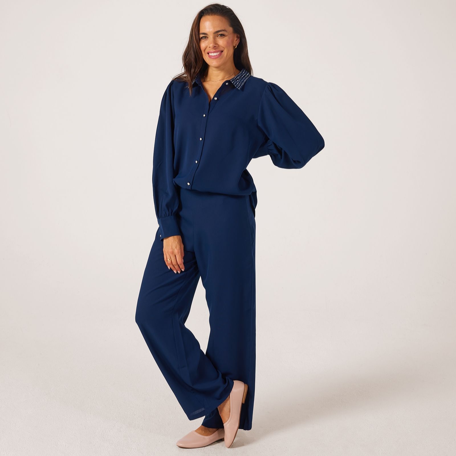 Shimmering with two-tone stud embellishments along the collar, this woven crepe handfeel shirt from Frank Usher brings a touch of glamour to your everyday style. Its relaxed fit, puff sleeves, and decorative crystal-set buttons create a chic yet wearable look, perfect for both smart daytime outings and evening gatherings. Pair it with tailored trousers or the matching co-ord for a polished ensemble that turns heads.