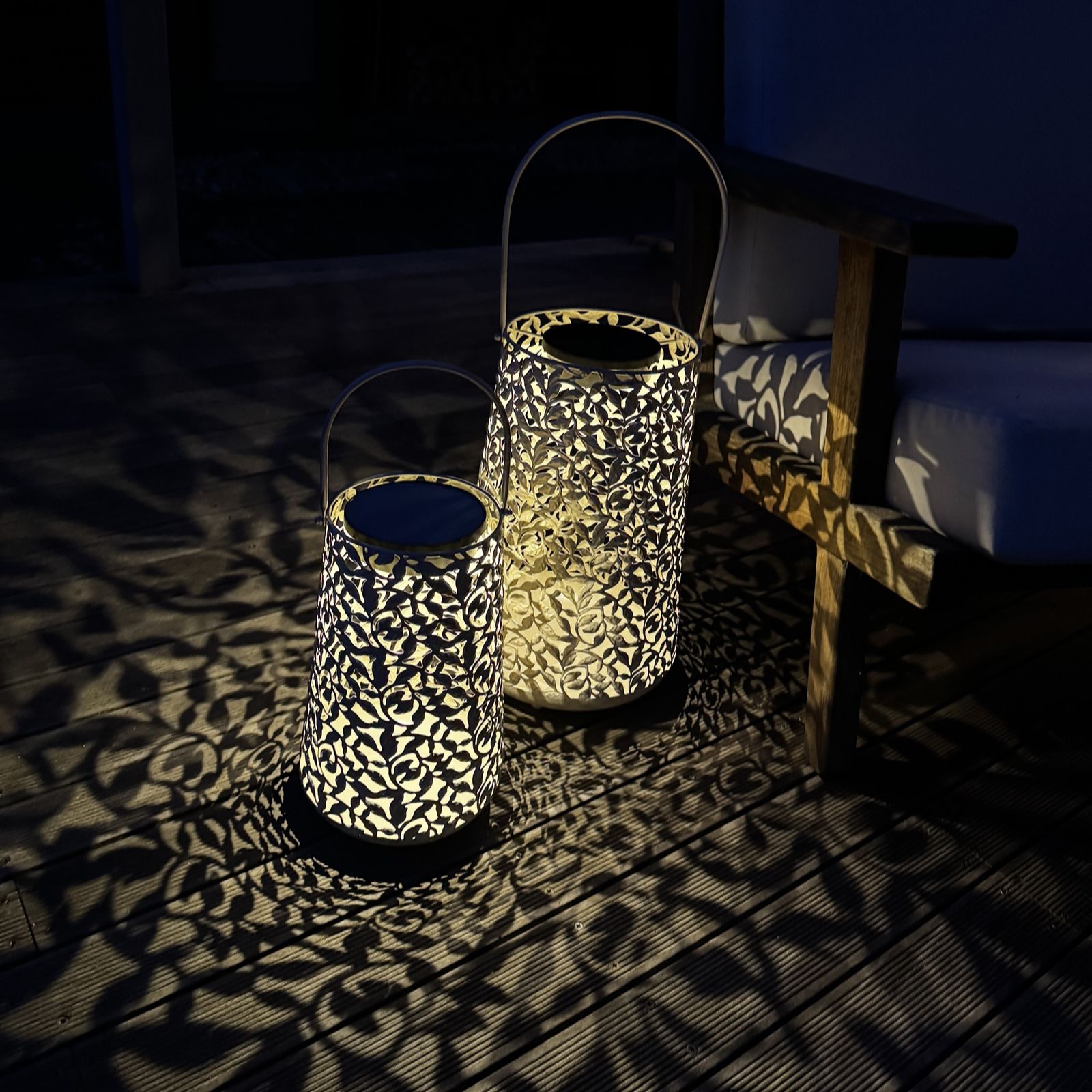 you'll love this lantern's sophisticated fretwork leaf design, which allows the warm light to shine through when it switches on at dusk. Ideal for elevating your garden or bringing a sophisticated twist to your patio, this lantern is sure to make any spot in your outdoor area a favourite.