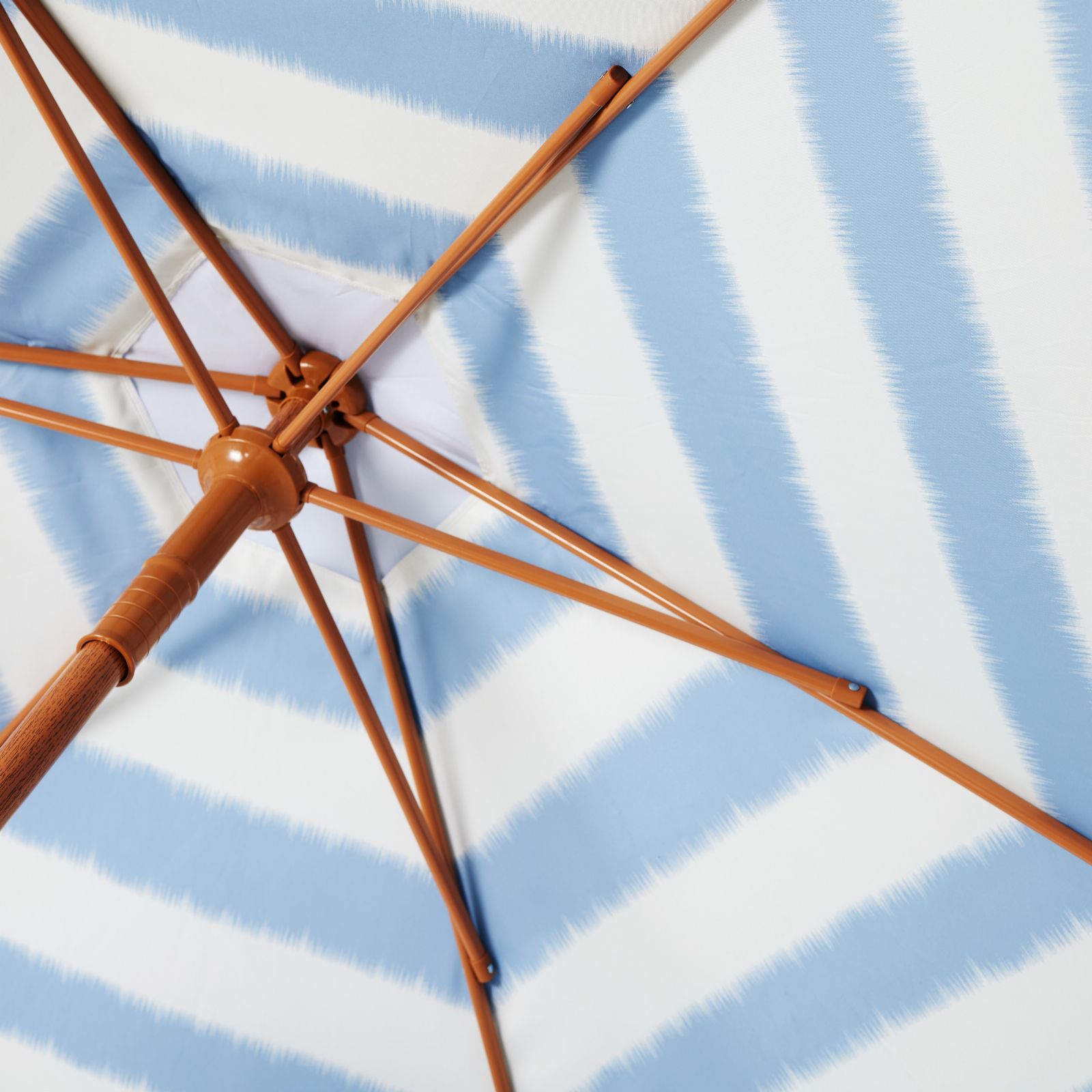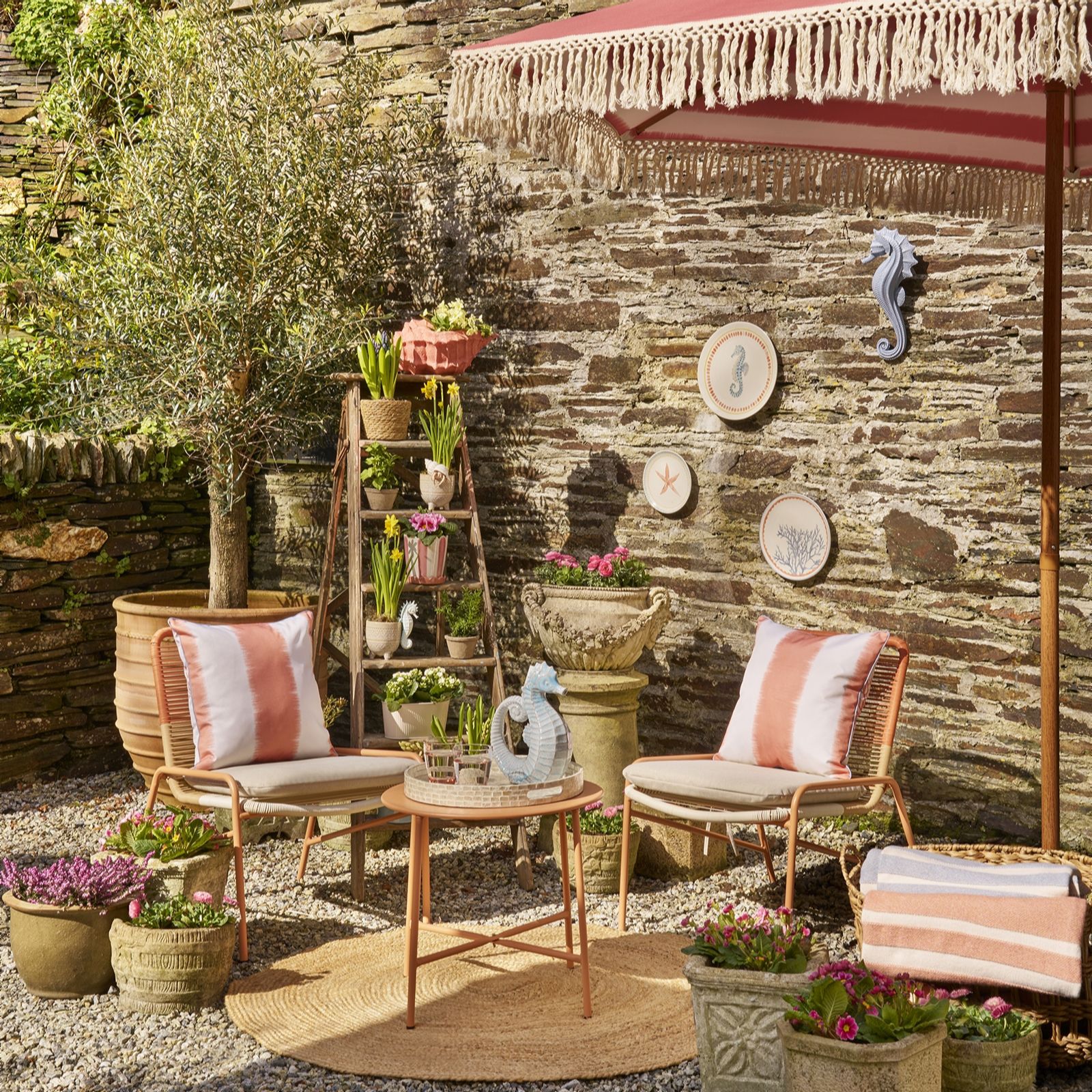 Bring a touch of vintage elegance to your outdoor space with the Garden Stories x Anouska Fringe Parasol. Featuring a charming tassel trim and a two-layer fabric canopy in Dusty Blue or Terracotta, this parasol offers adjustable shade up to 45 degrees left and right, making it perfect for sunny garden lunches, relaxing on the patio or creating a stylish poolside retreat. Its wooden-look steel pole and easy pop-up mechanism ensure both beauty and practicality.