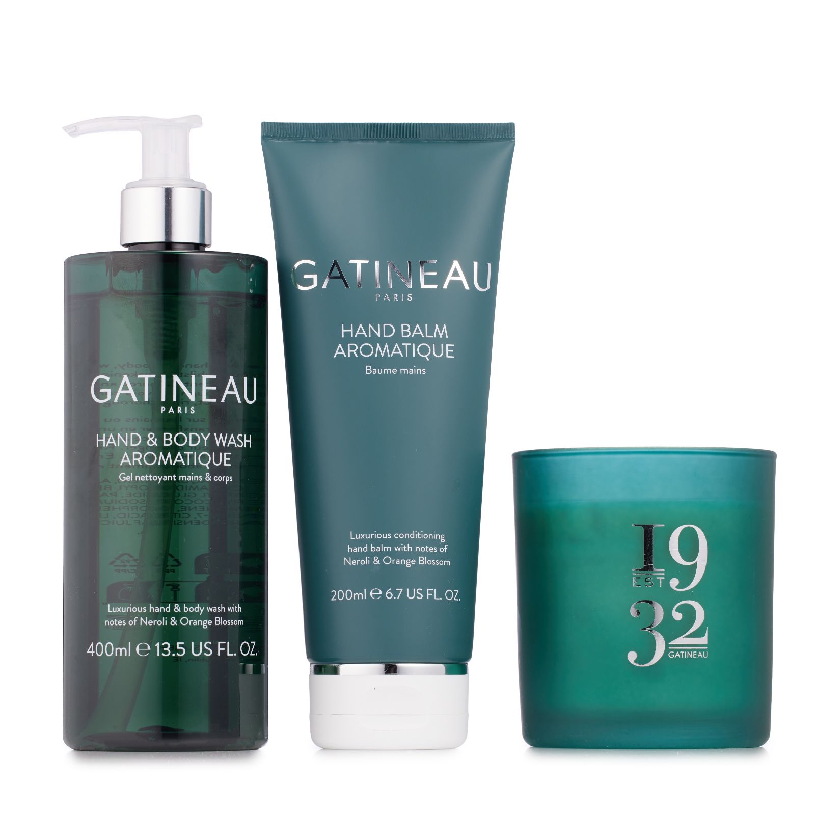 Transform your daily routine into a spa-like experience with the Gatineau Aromatique Spa Collection. This luxurious set combines a refreshing hand and body wash, a conditioning hand balm and an elegant candle, all infused with uplifting neroli and orange blossom scents, helping to leave skin feeling soft and your space beautifully fragranced.