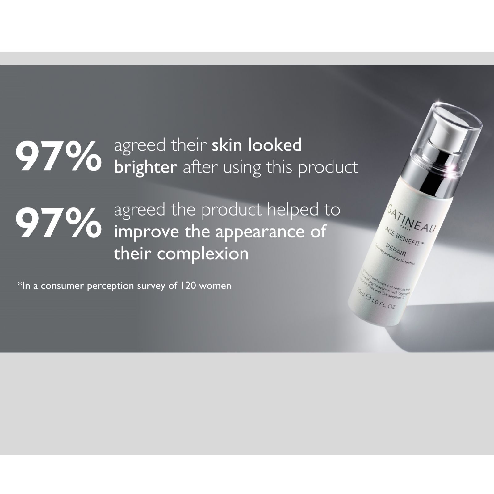- 1 x Age Benefit Repair Serum (30ml) – helps to even out skin tone and brighten the look of your complexion