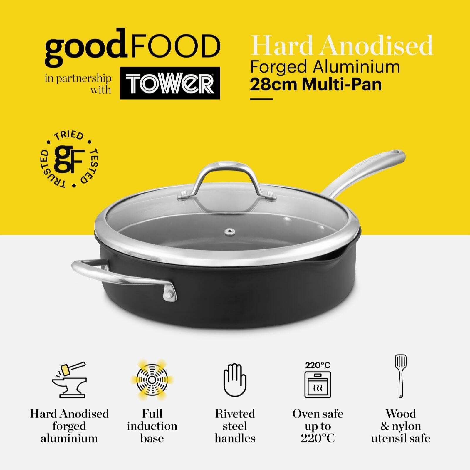 Cook up a storm using this Hard Anodized Grey and Steel 28cm Non-Stick Frying Pan from Good Food in partnership with Tower. Designed for use alongside the Good Food recipe library, it delivers even heat distribution with no hot spots, while its superior ceramic non-stick coating ensures effortless food release. Perfect for frying, sauteing or finishing in the oven, it's a versatile kitchen essential you'll reach for every day.